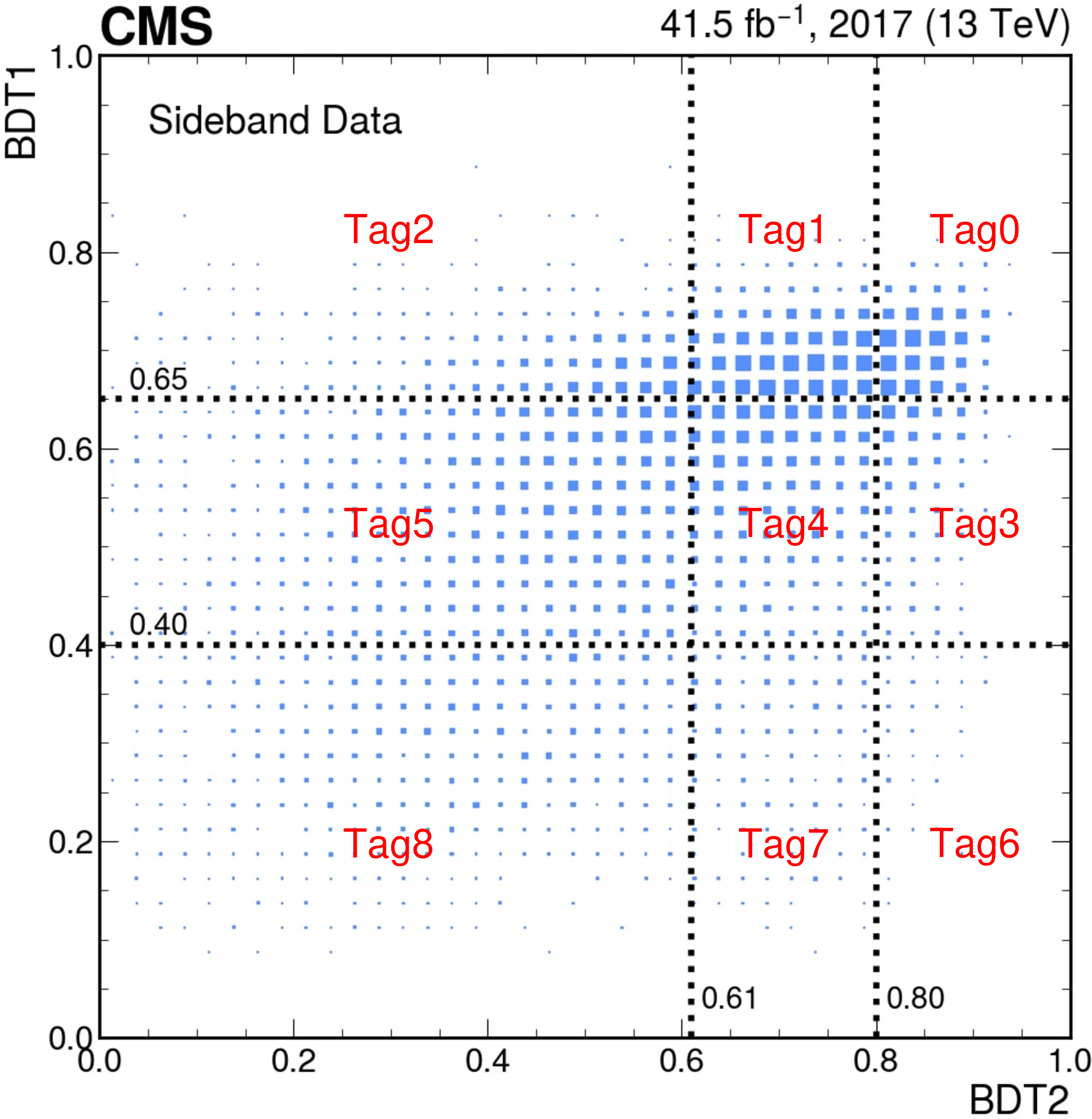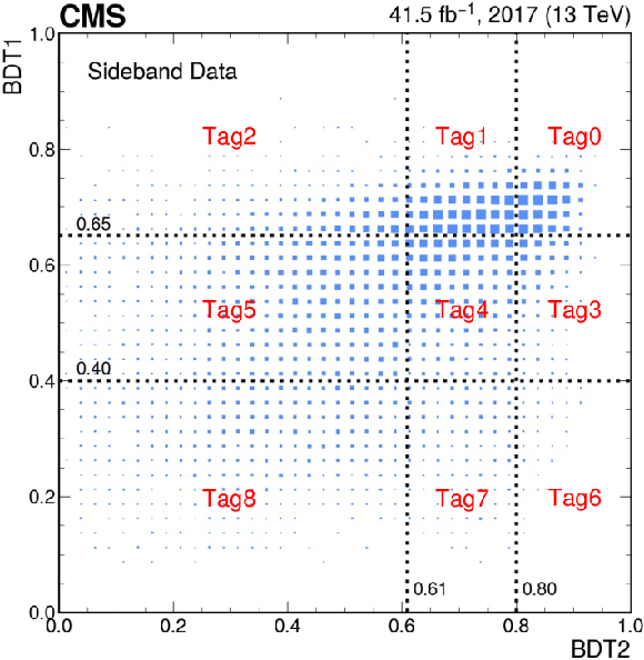 Two-dimensional distributions of BDT1 output ($ y $ axis) and BDT2 output (x axis) for cH (upper left), $ \mathrm{g}\mathrm{g}\mathrm{H} $ (upper right), and sideband data (lower) in 2017 event categories. The BDT1 score discriminates the cH signal from the resonant background while the BDT2 score discriminates the cH signal from the continuous background. Event category boundaries on BDT scores are illustrated as dashed lines. |