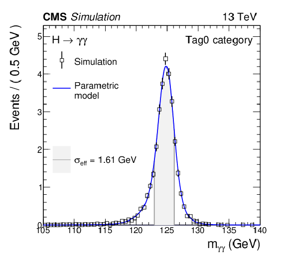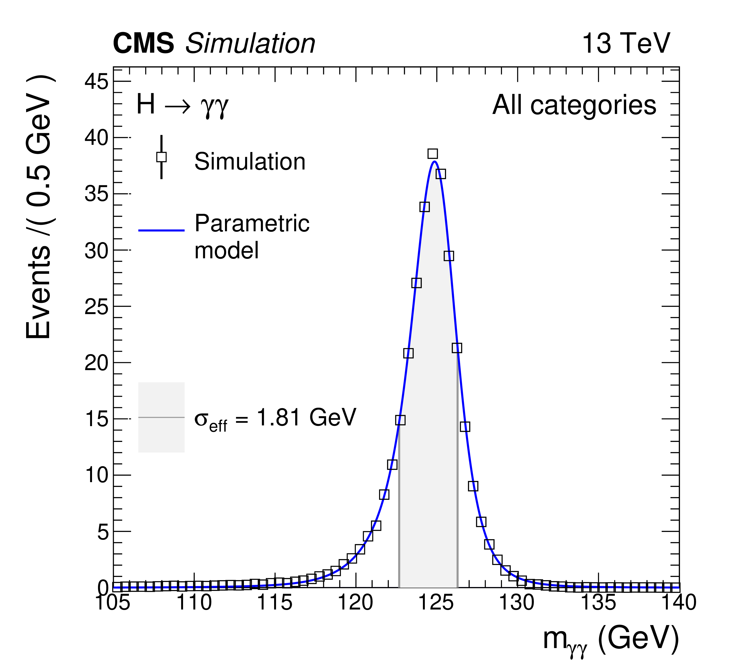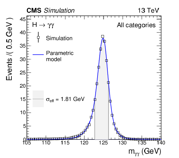 The shape of the parametric signal model for the analysis category with the tightest requirement in both BDT1 and BDT2 scores (left) and for the sum of all analysis categories (right). The open squares represent simulated events and the blue line represents the corresponding model. Also shown is the $ \sigma_{\text{eff}} $ value (half the width of the narrowest interval containing 68.3% of the diphoton mass distribution) in the grey shaded area. |
