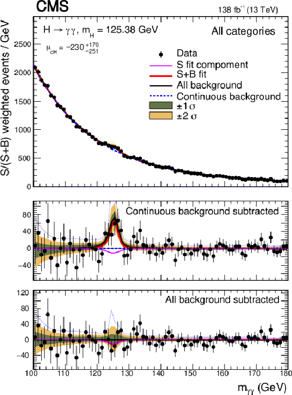 Invariant mass distribution of the selected events in all categories. For each category, the events are scaled by $ \mathrm{S}/(\mathrm{S}+\mathrm{B}) $, where S (B) is the number of expected signal (background) events in the smallest mass window containing 68.3% of the expected signal events. Curves for the signal + background fit (red), separately showing the resonant (black) and continuous (blue) backgrounds, as well as bands representing the 68.3% and 95.5% CL intervals in the background estimation, are overlaid. The middle (lower) panel shows the $ m_{\gamma\gamma} $ distribution after subtracting only the continuous background (subtracting all background components) and overlaying the curve for the fitted signal (purple). |