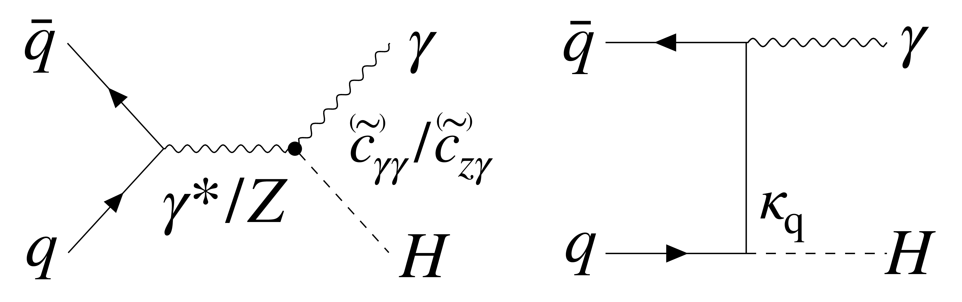 Examples of Feynman diagrams illustrating $ \gamma $H production at the LHC, highlighting the relevant couplings as discussed in the text. On the left, production occurs via an effective loop-generated $ \mathrm{H}\gamma\gamma $ or $ \mathrm{H}\mathrm{Z}\gamma $ interaction, denoted by a dot, which is the primary focus of this paper. On the right, production proceeds through H boson production in $ \mathrm{q}\overline{\mathrm{q}} $ annihilation with photon radiation. |