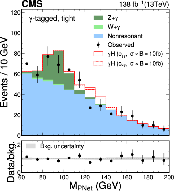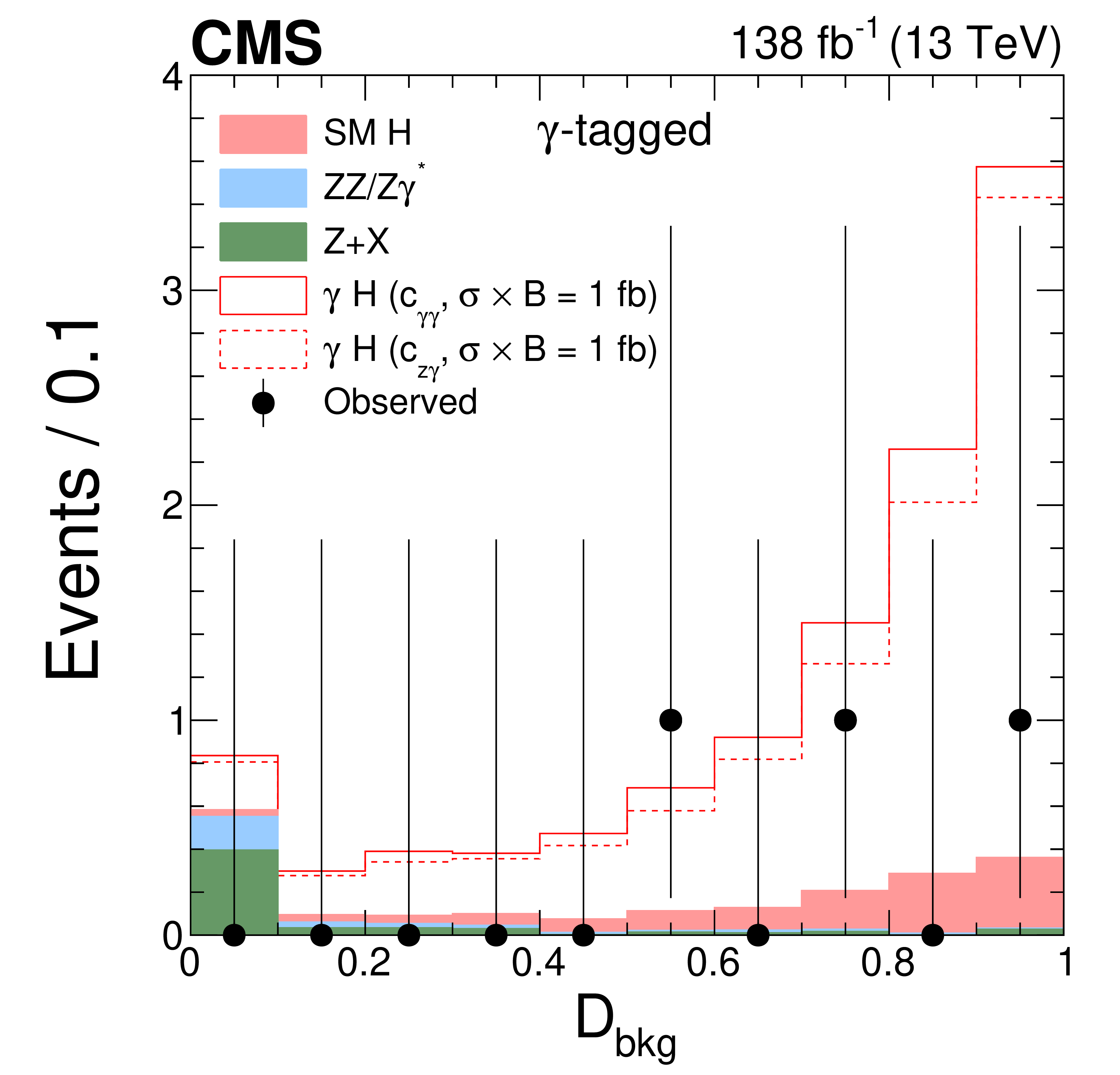Distributions of events for the $ {\mathcal{D}}_{\text{bkg}} $ observable in the $ \gamma $-tagged (left) and Untagged (right) categories of the $ \mathrm{H}\to 4\ell $ candidate events. Observed events (black markers) and expected background estimates (solid histograms) from MC simulation (ZZ/Z$ \gamma^* $) or control samples in data ($ \mathrm{Z}+\mathrm{X} $) are shown. The $ \gamma $H signal contribution, stacked on top of background, is shown with an open histogram for an assumed cross section of $ \sigma_{\gamma\mathrm{H}} \mathcal{B}_{4\ell}= $ 1 fb for either the $ c_{\gamma\gamma} $ (solid) and $ c_{z\gamma} $ (dashed) coupling hypothesis. |