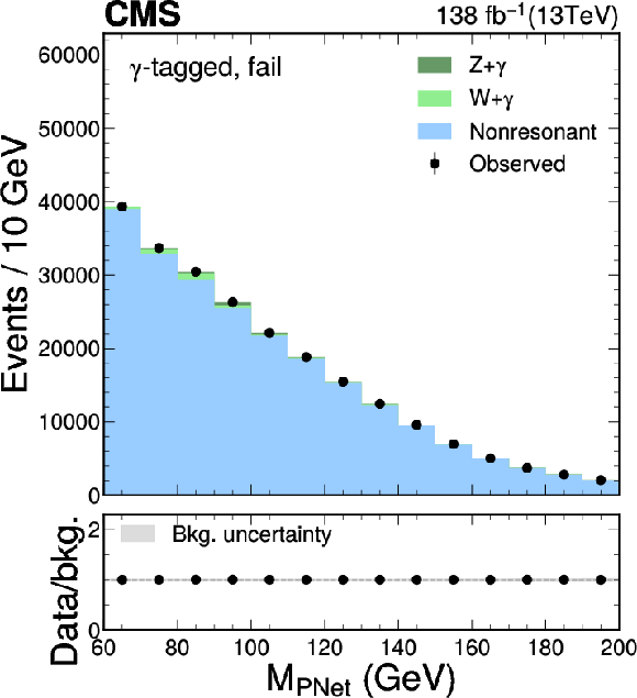 The $ M_{\textrm{PNet}} $ distributions for the number of observed events (black markers) compared with the backgrounds estimated in the fit to the data (filled histograms) in the $ \mathrm{b}\overline{\mathrm{b}} $ channel. Fail (left), medium (middle) and tight (right) regions of the $ \gamma $-tagged (lower) and Untagged (upper) categories are shown. The signal contribution, stacked on top of background, is shown with an open histogram for an assumed cross section of $ \sigma_{\gamma\mathrm{H}} \mathcal{B}_{\mathrm{b}\overline{\mathrm{b}}}= $ 10 fb. |