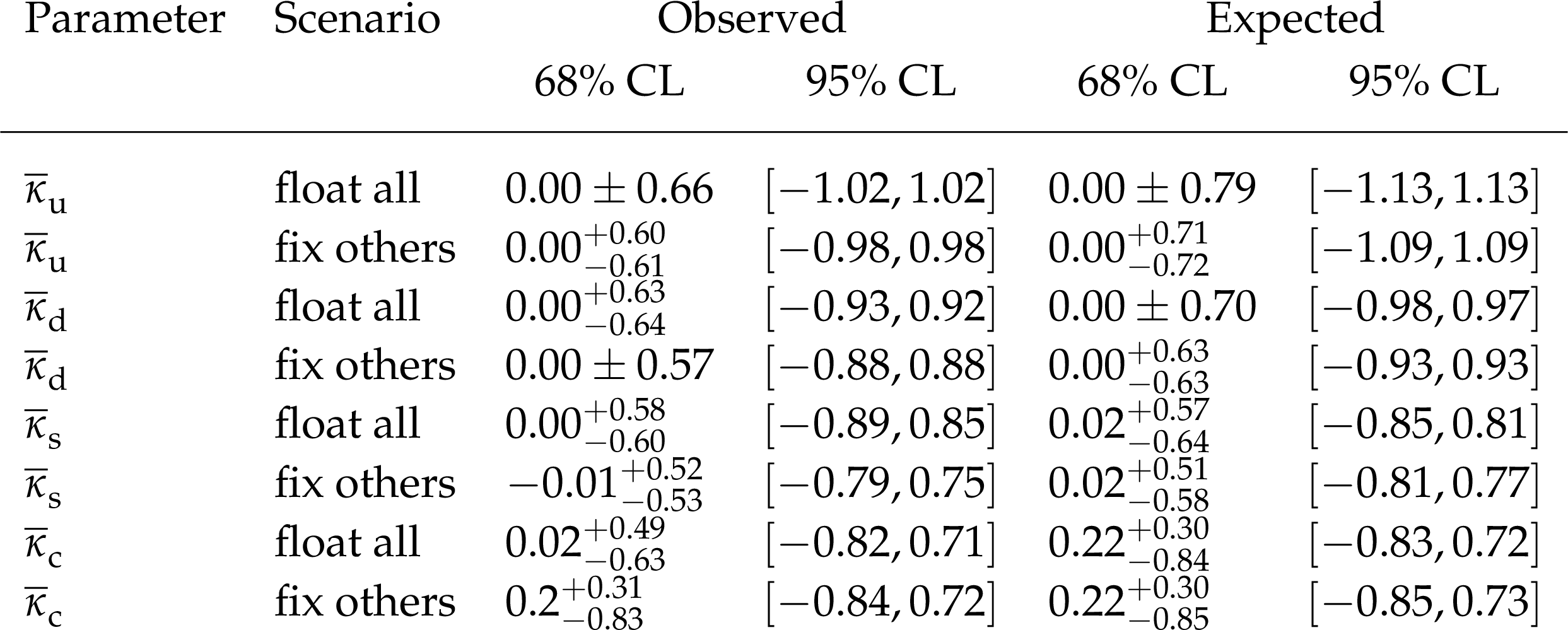Observed and expected constraints on the $ \overline{\kappa}_{\mathrm{u}} $, $ \overline{\kappa}_{\mathrm{d}} $, $ \overline{\kappa}_{\mathrm{s}} $, and $ \overline{\kappa}_{\mathrm{c}} $ defined as $ \overline{\kappa}_{\mathrm{q}}=y_{\mathrm{q}}v/m_{\mathrm{b}} $, following the same conventions as outlined in Table 3. |