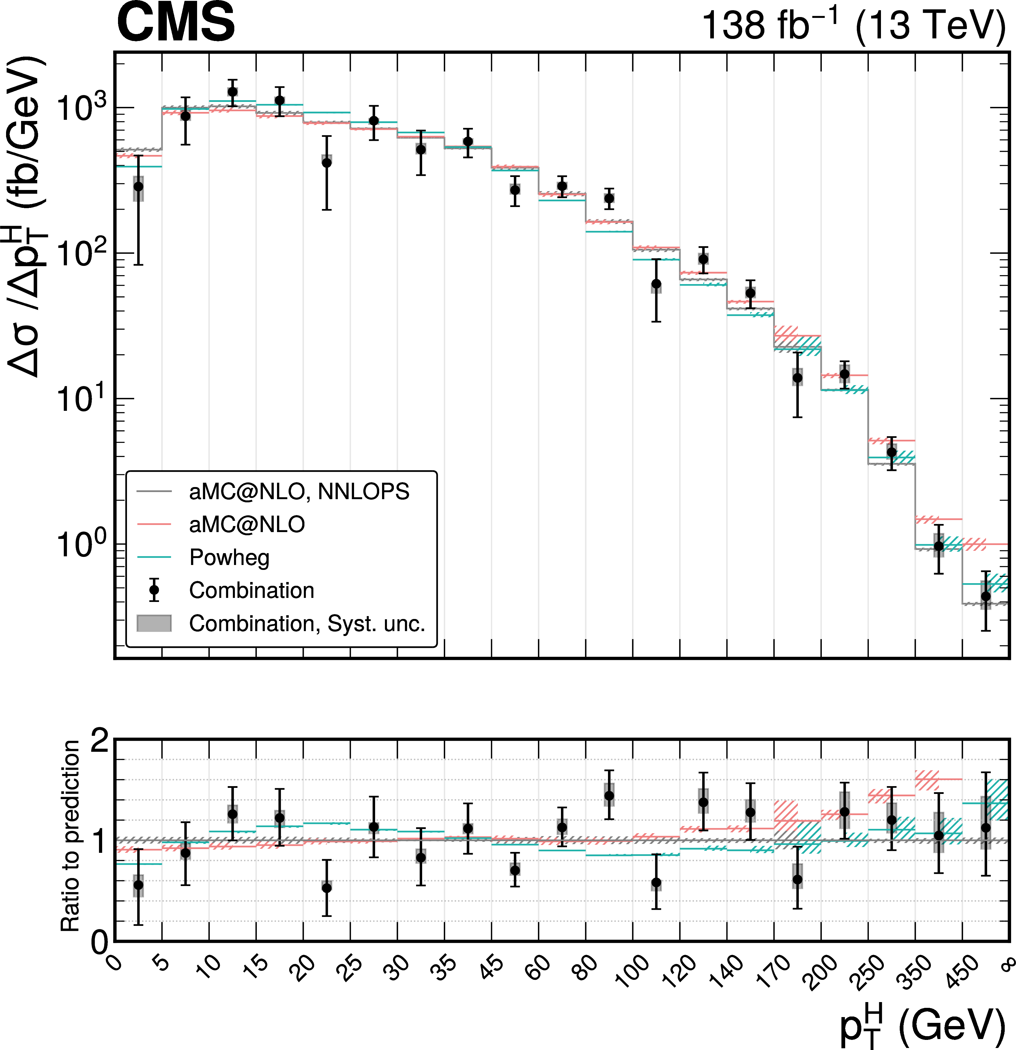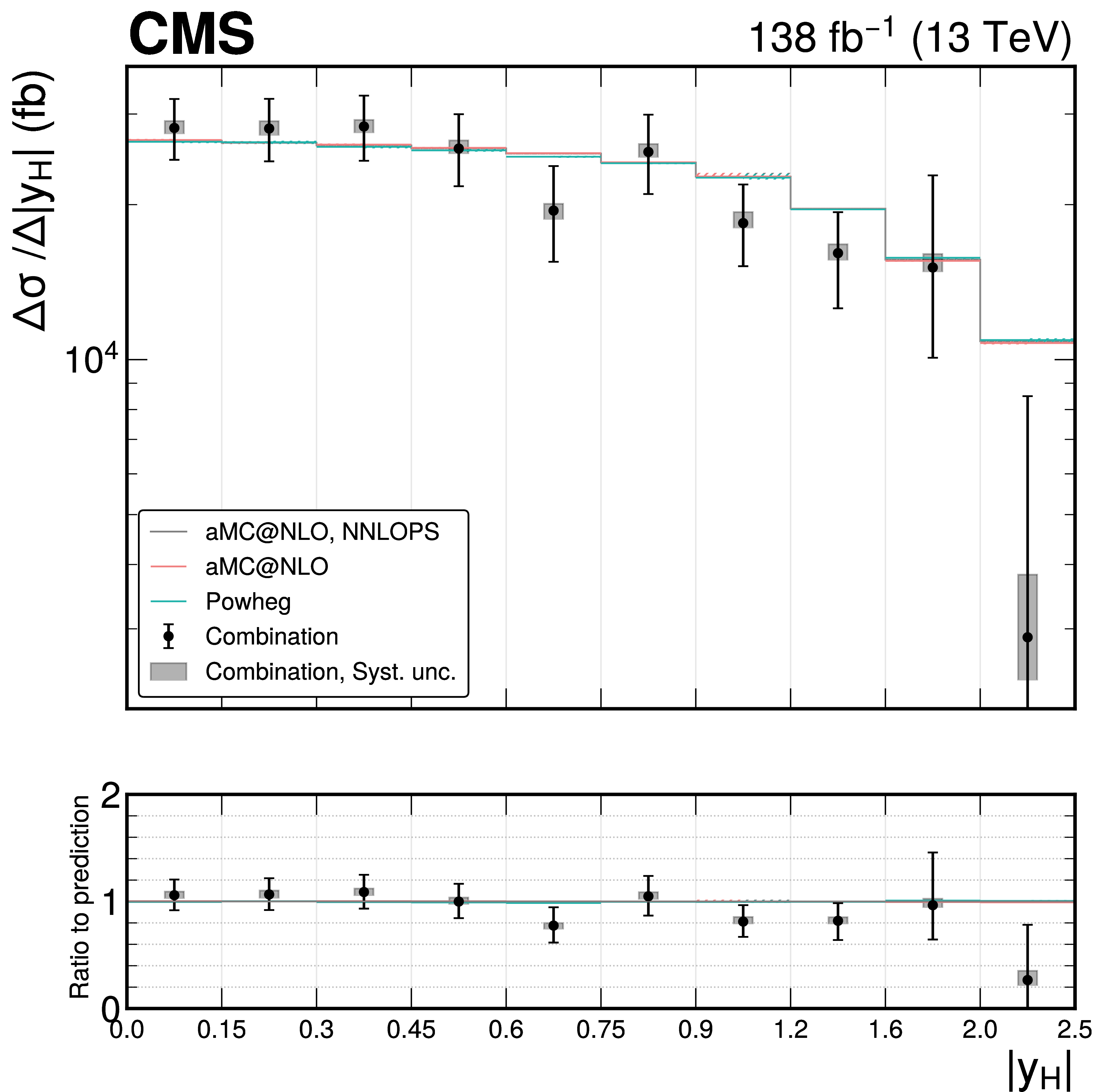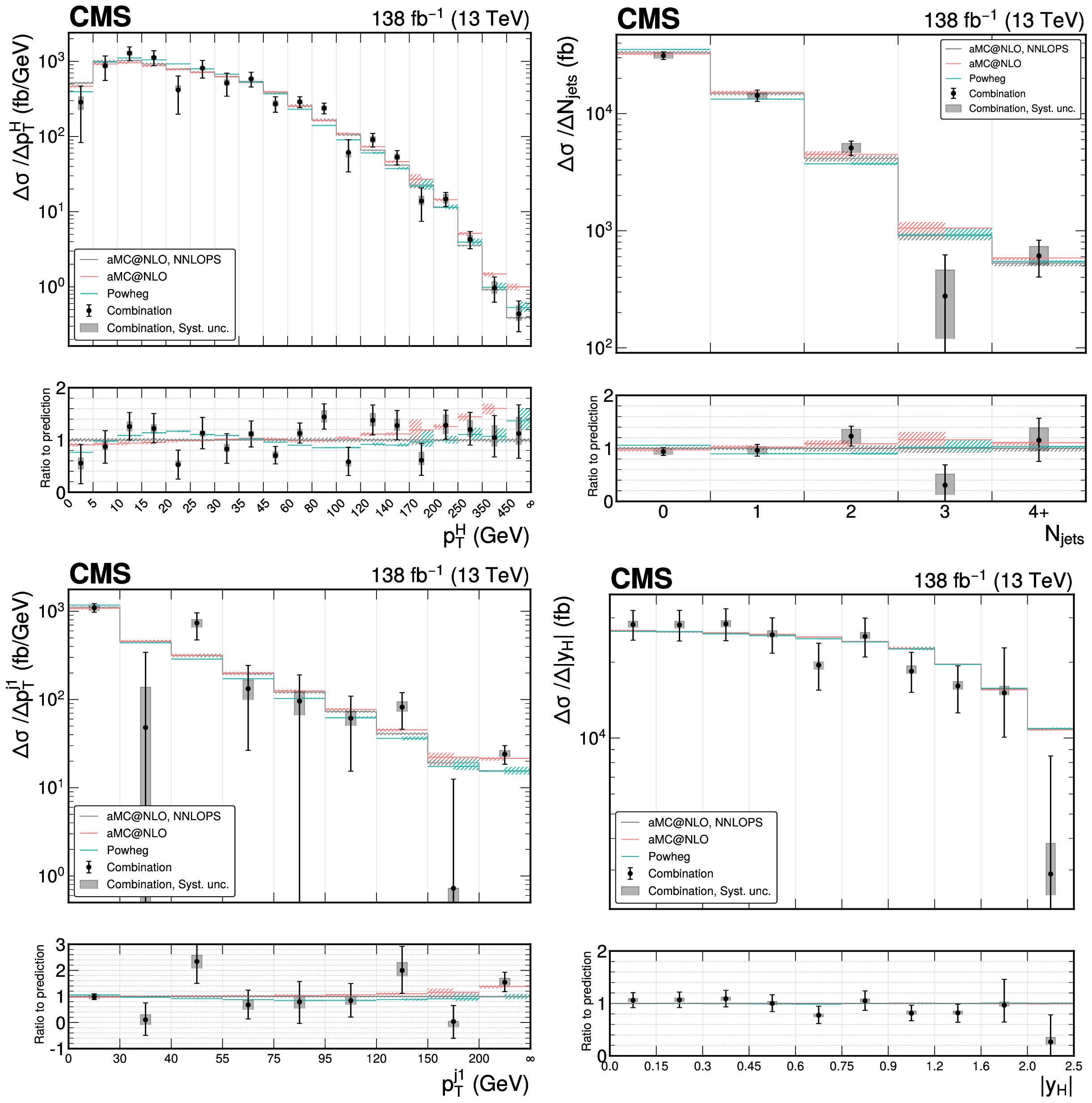 Measurement of the total differential cross section as a function of $ p_{\mathrm{T}}^{\mathrm{H}} $ (upper left), $ N_{\mathrm{jets}} $ (upper right), $ p_{\mathrm{T}}^{\mathrm{j}_1} $ (lower left), and $ |y_{\mathrm{H}}| $ (lower right). For $ p_{\mathrm{T}}^{\mathrm{j}_1} $, the first bin comprises all events with less than one jet, for which $ p_{\mathrm{T}}^{\mathrm{j}_1} $ is undefined. The combined spectrum is shown as black points with error bars indicating the 68% confidence interval. The systematic component of the uncertainty is shown in gray. The SM prediction is reported for different generators. In the case of $ p_{\mathrm{T}}^{\mathrm{H}} $ and $ p_{\mathrm{T}}^{\mathrm{j}_1} $, the rightmost bins of the distributions are overflow bins, and are normalized by the bin width of the last but one bin. In cases where the systematic uncertainty band covers only one side of the data point, the systematic uncertainty on the other side is negligible. The ratio between the measurements and the SM predictions is shown in the lower panel of each plot. |