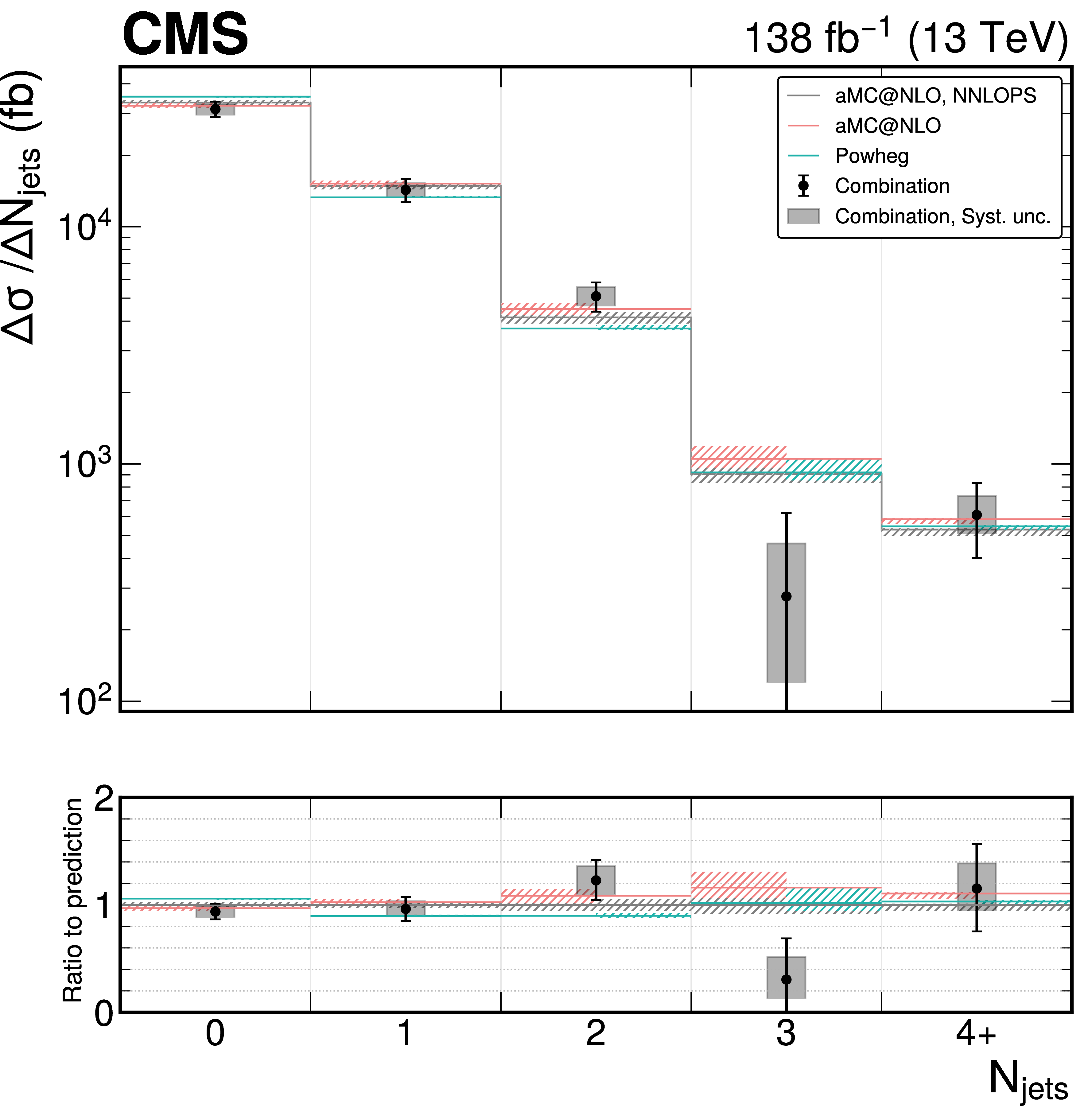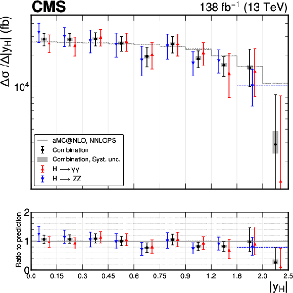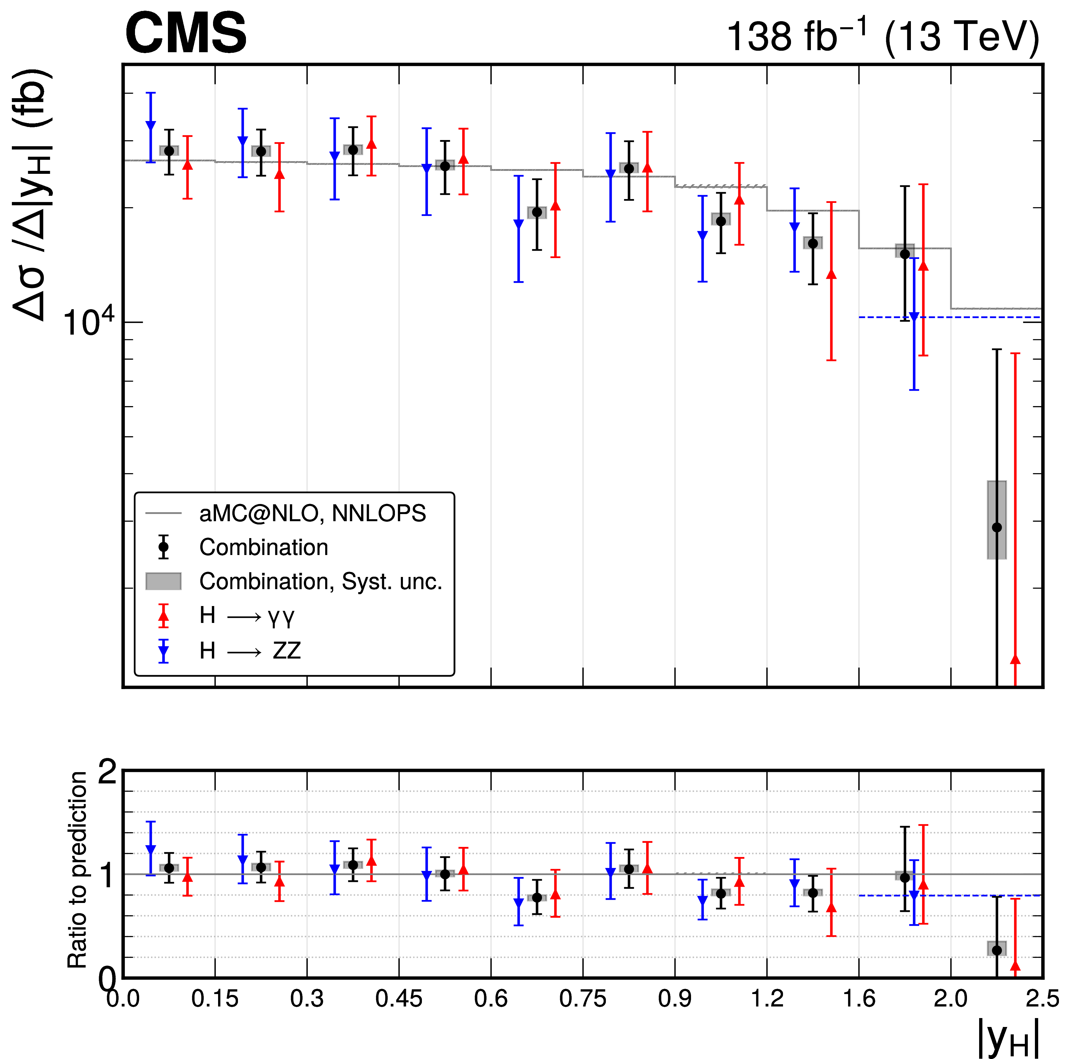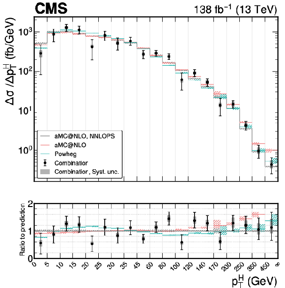 Measurement of the total differential cross section as a function of $ p_{\mathrm{T}}^{\mathrm{H}} $ (upper left), $ N_{\mathrm{jets}} $ (upper right), $ p_{\mathrm{T}}^{\mathrm{j}_1} $ (lower left), and $ |y_{\mathrm{H}}| $ (lower right). For $ p_{\mathrm{T}}^{\mathrm{j}_1} $, the first bin comprises all events with less than one jet, for which $ p_{\mathrm{T}}^{\mathrm{j}_1} $ is undefined. The combined spectrum is shown as black points with error bars indicating the 68% confidence interval. The systematic component of the uncertainty is shown in gray. The SM prediction is reported for different generators. In the case of $ p_{\mathrm{T}}^{\mathrm{H}} $ and $ p_{\mathrm{T}}^{\mathrm{j}_1} $, the rightmost bins of the distributions are overflow bins, and are normalized by the bin width of the last but one bin. In cases where the systematic uncertainty band covers only one side of the data point, the systematic uncertainty on the other side is negligible. The ratio between the measurements and the SM predictions is shown in the lower panel of each plot. |