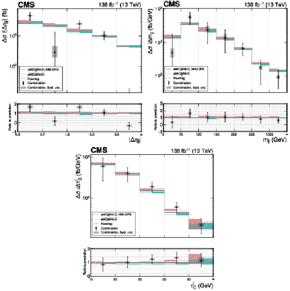 Measurement of the total differential cross section as a function of $ |\Delta\eta_{\mathrm{jj}}| $ (upper left), $ m_{\mathrm{jj}} $ (upper right), and $ \tau^{\mathrm{j}}_{\mathrm{C}} $ (lower). The combined spectrum is shown as black points with error bars indicating the 68% confidence interval. The systematic component of the uncertainty is shown in gray. The SM prediction is reported for different generators. The rightmost bins of the distributions are overflow bins, and are normalized by the bin width of the last but one bin. The ratio between the measurements and the SM predictions is shown in the lower panel of each plot. |