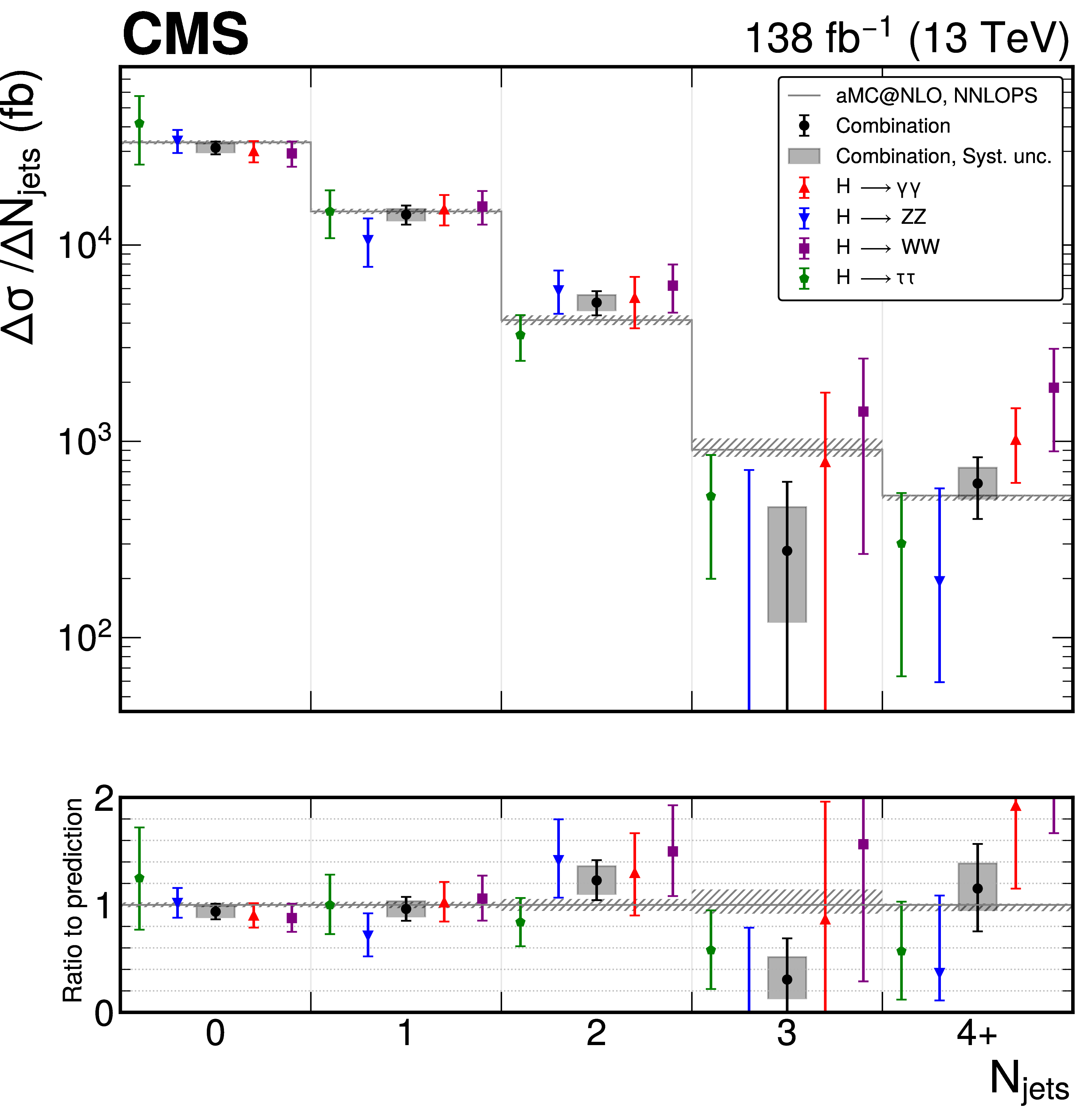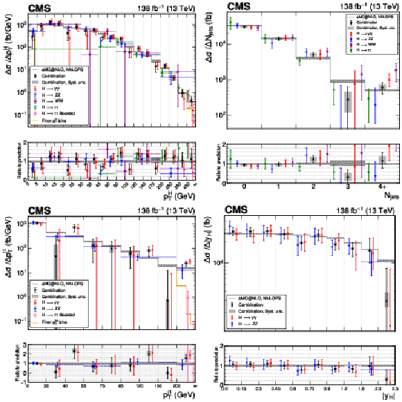 Measurement of the total differential cross section as a function of $ p_{\mathrm{T}}^{\mathrm{H}} $ (upper left), $ N_{\mathrm{jets}} $ (upper right), $ p_{\mathrm{T}}^{\mathrm{j}_1} $ (lower left), and $ |y_{\mathrm{H}}| $ (lower right). The combined spectrum is shown in black points with error bars indicating the 68% interval. The systematic component of the uncertainty is shown in gray. The spectra for the analyses in $ \mathrm{H} \to \gamma \gamma $, $ \mathrm{H} \to \mathrm{Z} \mathrm{Z}^{(*)} \to 4\ell $, $ \mathrm{H} \to \mathrm{W} \mathrm{W}^{(*)} \to \mathrm{e}^{\pm} \mu^{\mp} \nu_{\ell} \overline{\nu}_{\ell} $, $ \mathrm{H} \to \tau^{+} \tau^{-} $, and $ \mathrm{H} \to \tau^{+} \tau^{-} $ boosted are shown in red, blue, purple, green, and pink respectively. The SM prediction is reported in light gray for MadGraph-5_aMC@NLO NNLOPS. In the case of $ p_{\mathrm{T}}^{\mathrm{H}} $ and $ p_{\mathrm{T}}^{\mathrm{j}_1} $, the rightmost bins of the distributions are overflow bins, and are normalized by the bin width of the last but one bin. Measurements or predictions with different binnings can be directly compared only in the ratio panels of the figures. In cases where individual contributions have finer bins than the combination, such as the last bin of the $ p_{\mathrm{T}}^{\mathrm{H}} $ and $ p_{\mathrm{T}}^{\mathrm{j}_1} $ spectra, a second, finer, SM prediction is shown in the upper panel. |