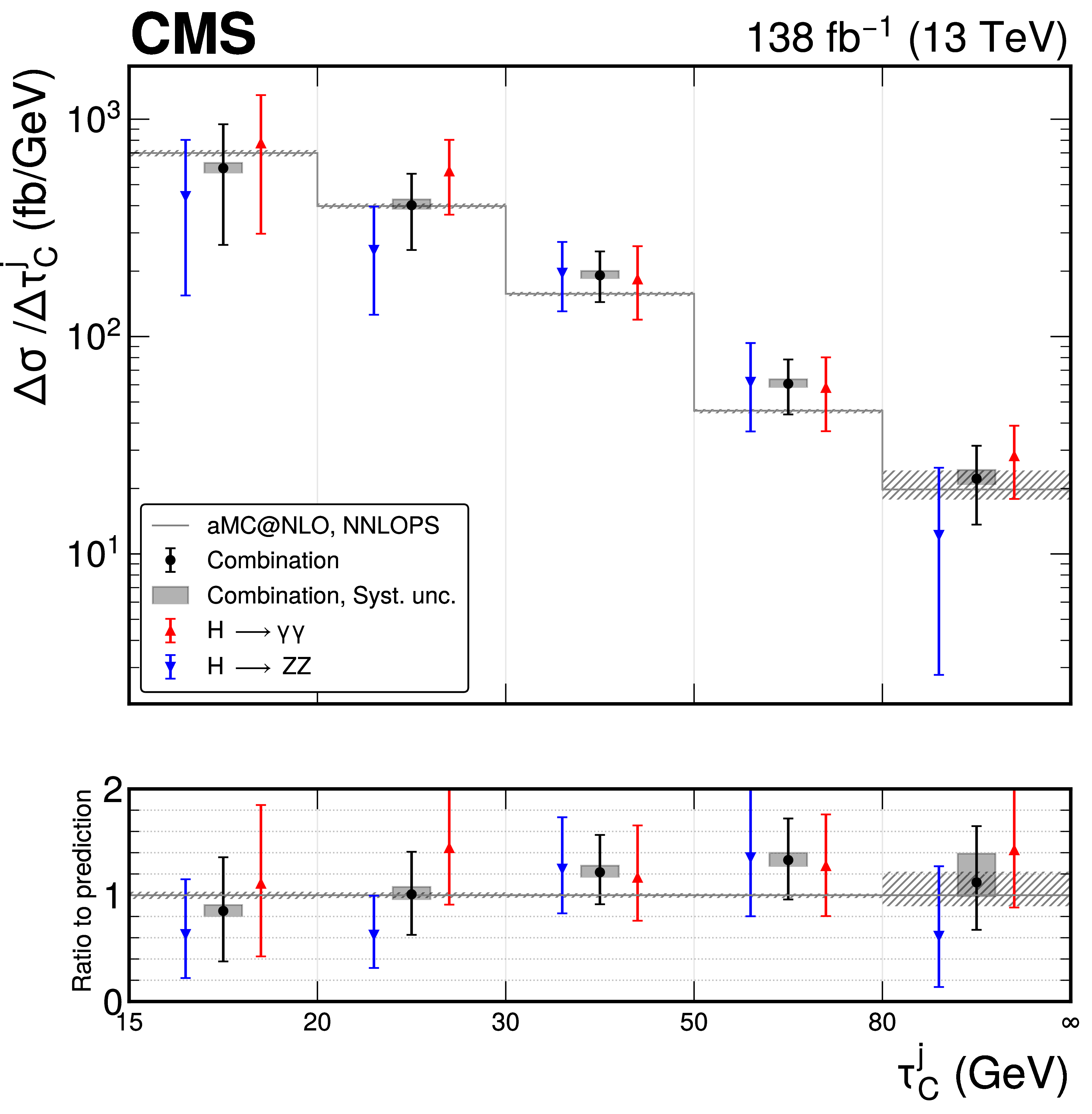 Measurement of the total differential cross section as a function of $ |\Delta\eta_{\mathrm{jj}}| $ (upper left), $ m_{\mathrm{jj}} $ (upper right), and $ \tau^{\mathrm{j}}_{\mathrm{C}} $ (lower). The combined spectrum is shown in black points with error bars indicating the 68% interval. The systematic component of the uncertainty is shown in gray. The spectra for the analyses in $ \mathrm{H} \to \gamma \gamma $ and $ \mathrm{H} \to \mathrm{Z} \mathrm{Z}^{(*)} \to 4\ell $ are shown in red and blue, respectively. The SM prediction is reported in light gray for MadGraph-5_aMC@NLO NNLOPS. The rightmost bins of the distributions are overflow bins, and are normalized by the bin width of the last but one bin. Measurements or predictions with different binnings can be directly compared only in the ratio panels of the figures. |