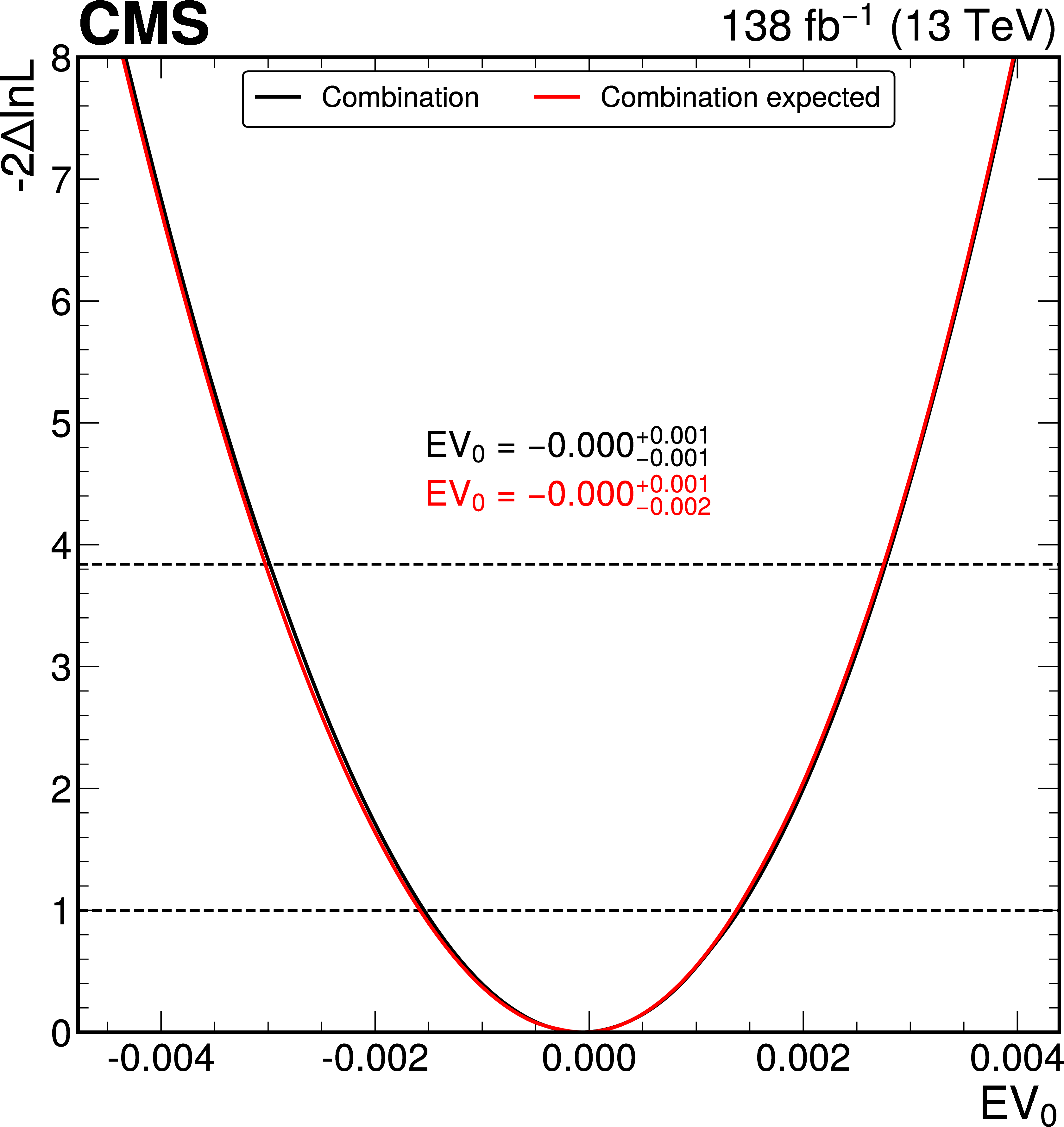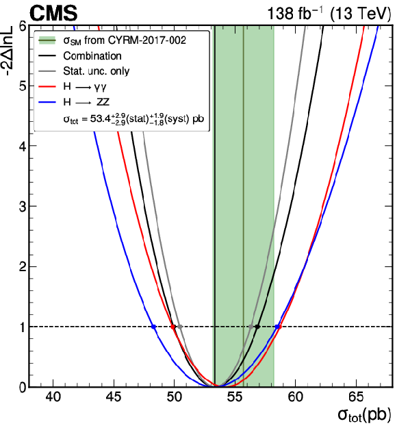Negative log-likelihood scan of the total Higgs boson production cross section $ \sigma_{\mathrm{tot}} $ for the $ \mathrm{H} \to \gamma \gamma $, $ \mathrm{H} \to \mathrm{Z} \mathrm{Z}^{(*)} \to 4\ell $, and combined analyses. The markers indicate the 68% confidence interval. The label \textitCYRM-2017-002 in the legend denotes Ref. [19]. |