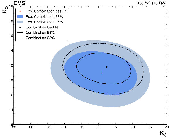 Observed and expected simultaneous fits for $ \kappa_{\mathrm{b}} $ and $ \kappa_{\mathrm{c}} $, assuming a coupling dependence of the branching fractions (left) and with the branching fractions of the decay channels entering the combination implemented as nuisance parameters with no dependence on the couplings (right). The 68% and 95% CL contours are shown in solid and dashed lines for the observed data, with the expected contours indicated in blue. |