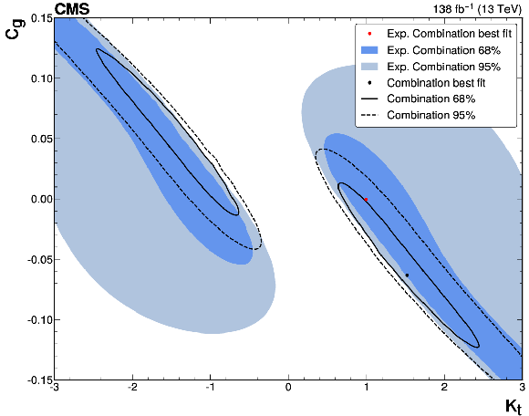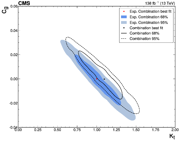 Simultaneous fit for $ \kappa_{\mathrm{t}} $ and $ c_{\mathrm{g}} $, observed and expected, assuming a coupling dependence of the branching fractions (left) and with the branching fractions of the decay channels entering the combination implemented as nuisance parameters with no dependence on the couplings (right). The 68% and 95% CL contours are shown in solid and dashed lines for observed data, the expected contours are indicated by the blue shaded areas. |