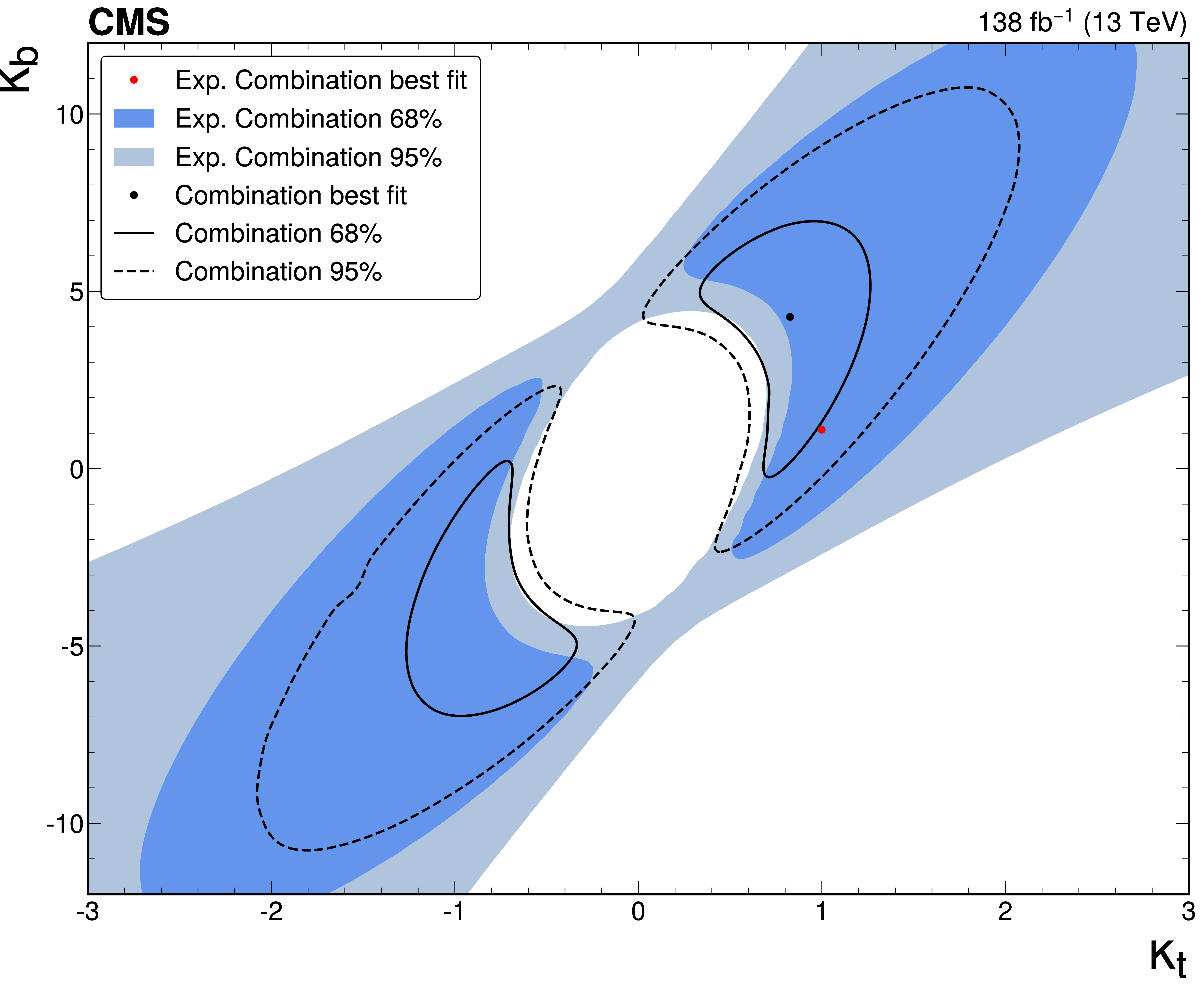 Simultaneous fit for $ \kappa_{\mathrm{t}} $ and $ \kappa_{\mathrm{b}} $, observed and expected, assuming a coupling dependence of the branching fractions (left) and with the branching fractions of the decay channels entering the combination implemented as nuisance parameters with no dependence on the couplings (right). The 68% and 95% CL contours are indicated by the solid and dashed lines for the observed data, the expected contours are indicated by the blue shaded regions. |