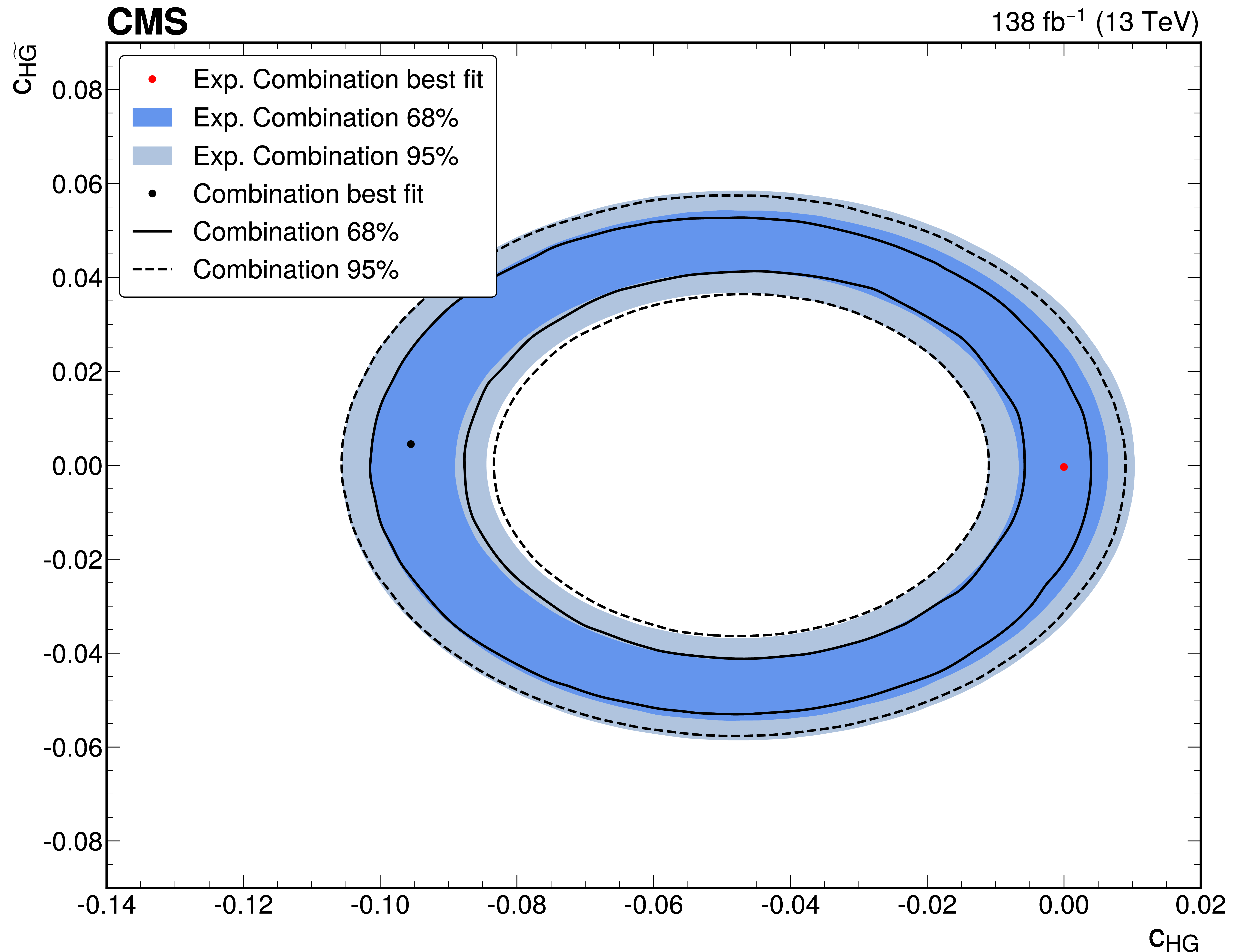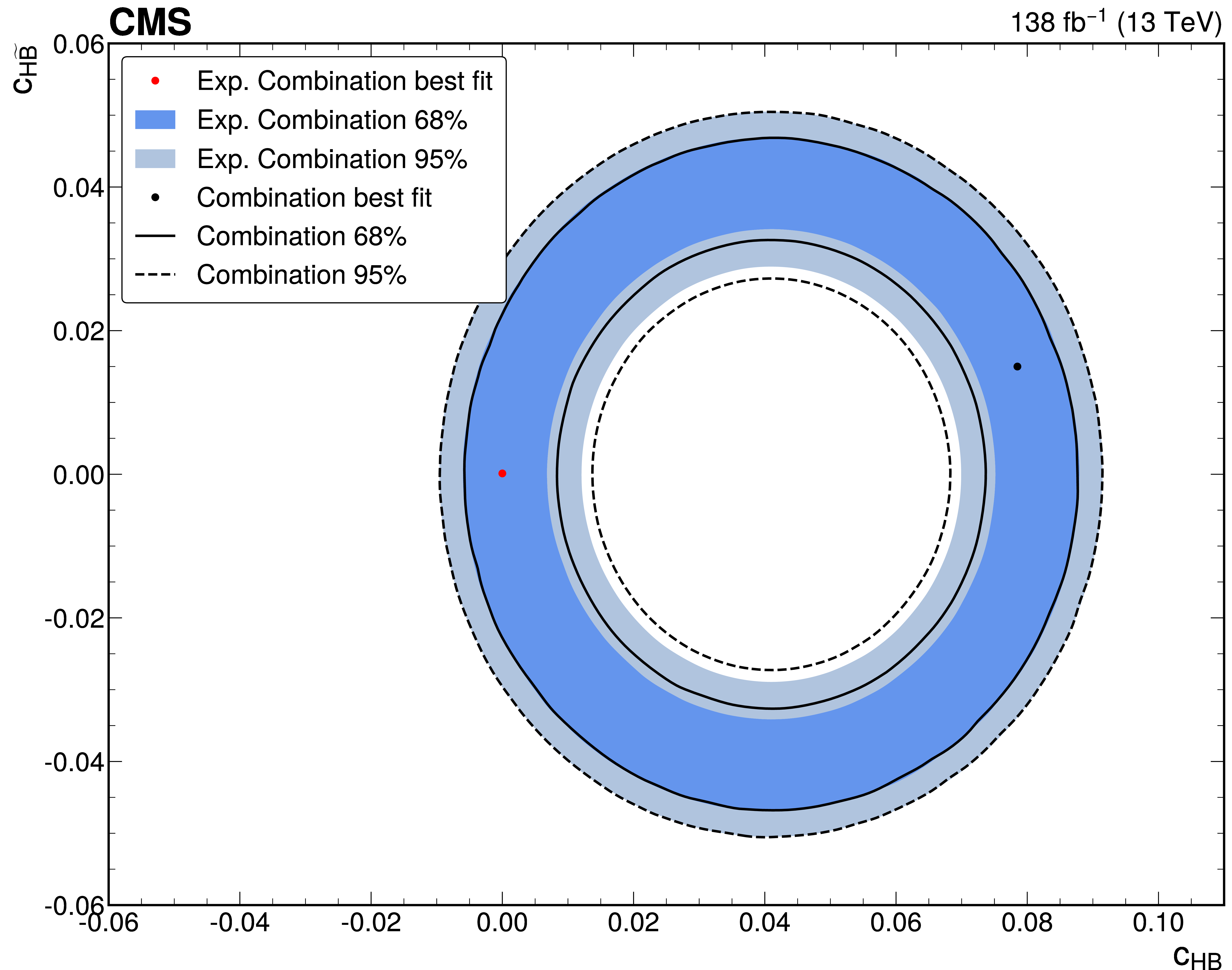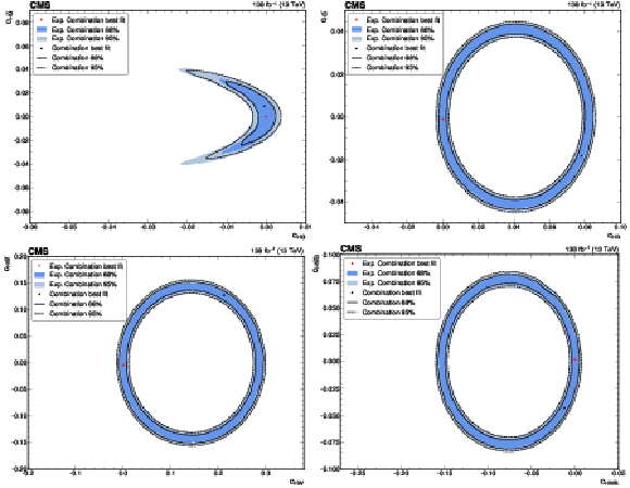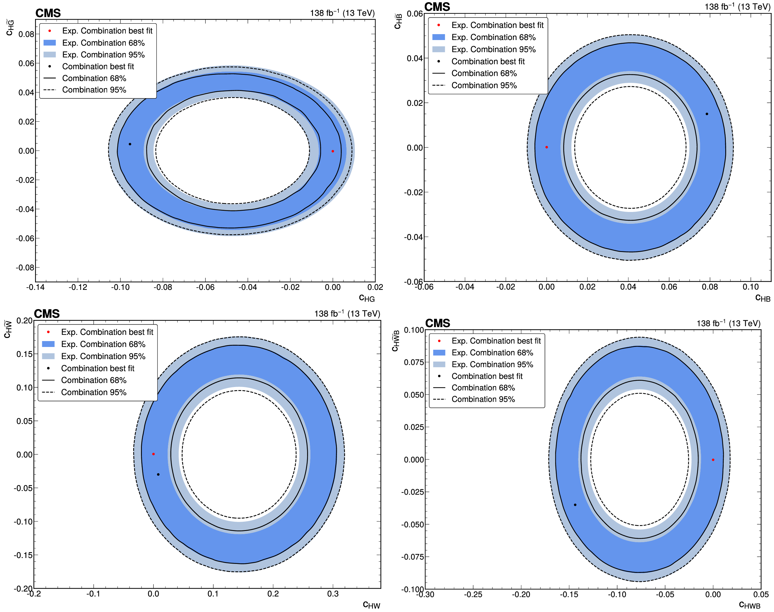 Observed and expected two-dimensional scans for the $ c_{\mathrm{HG}}-\tilde{c}_{\mathrm{HG}} $ (upper left), $ c_{\mathrm{HB}}-\tilde{c}_{\mathrm{HB}} $ (upper right), $ c_{\mathrm{HW}}-\tilde{c}_{\mathrm{HW}} $ (lower left), and $ c_{\mathrm{HWB}}-\tilde{c}_{\mathrm{HWB}} $ (lower right) pairs with $ p_{\mathrm{T}}^{\mathrm{H}} $ spectra in all decay channels. |