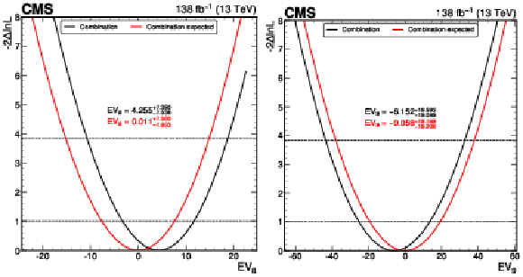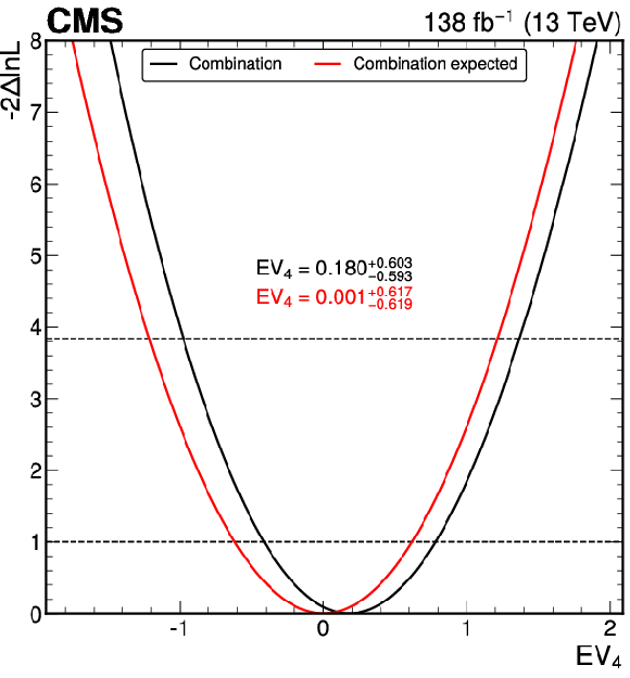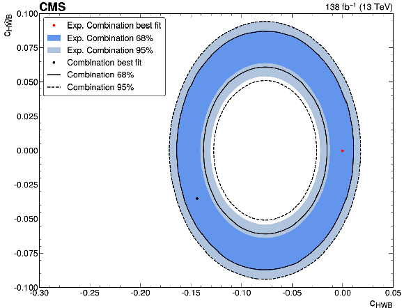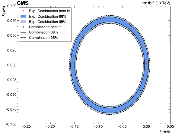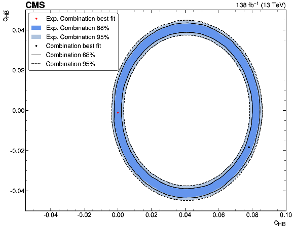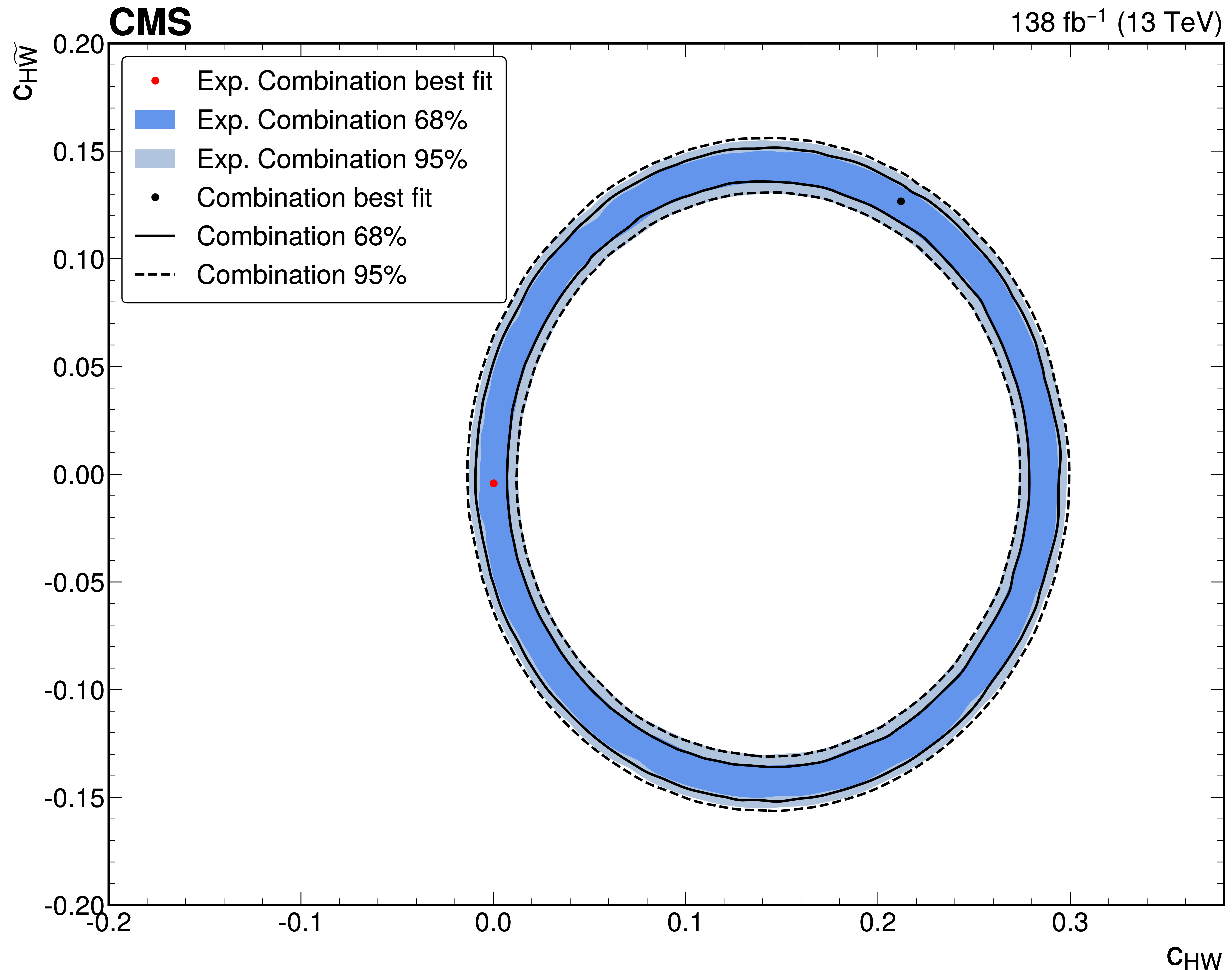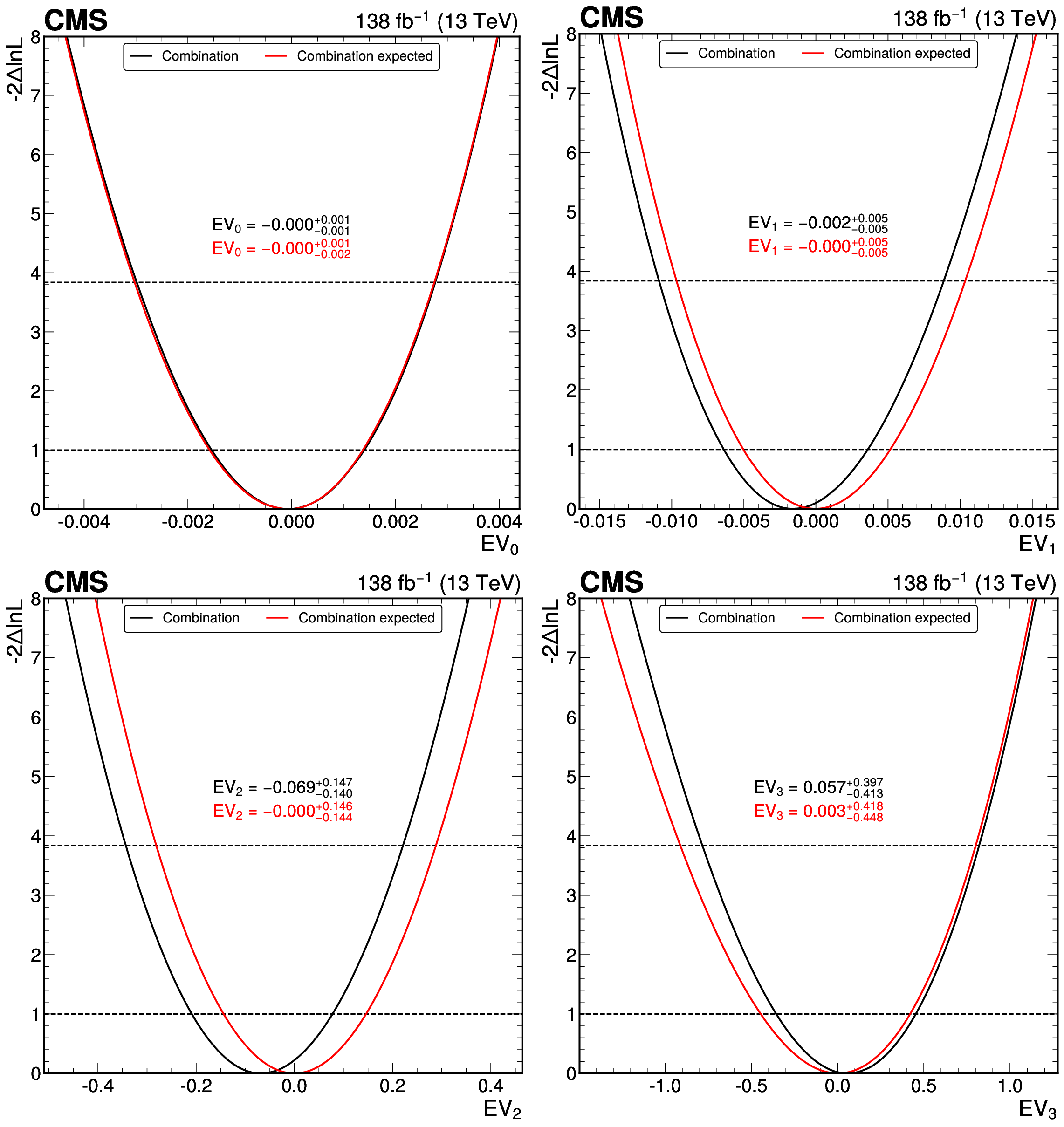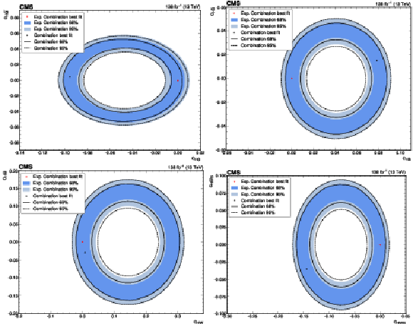 Observed and expected two-dimensional scans for the $ c_{\mathrm{HG}}-\tilde{c}_{\mathrm{HG}} $ (upper left), $ c_{\mathrm{HB}}-\tilde{c}_{\mathrm{HB}} $ (upper right), $ c_{\mathrm{HW}}-\tilde{c}_{\mathrm{HW}} $ (lower left), and $ c_{\mathrm{HWB}}-\tilde{c}_{\mathrm{HWB}} $ (lower right) pairs with $ p_{\mathrm{T}}^{\mathrm{H}} $ spectra in all decay channels. |