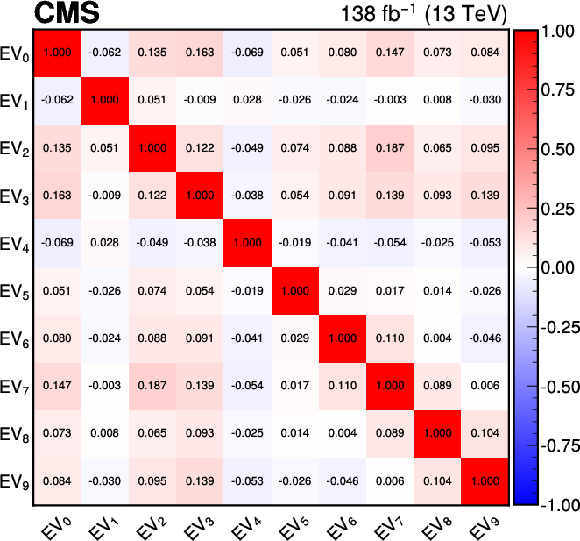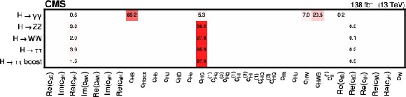Correlation matrix of the linear combinations of Wilson coefficients obtained from the PCA, obtained by fitting the observed data to the $ p_{\mathrm{T}}^{\mathrm{H}} $ spectra of all decay channels. |