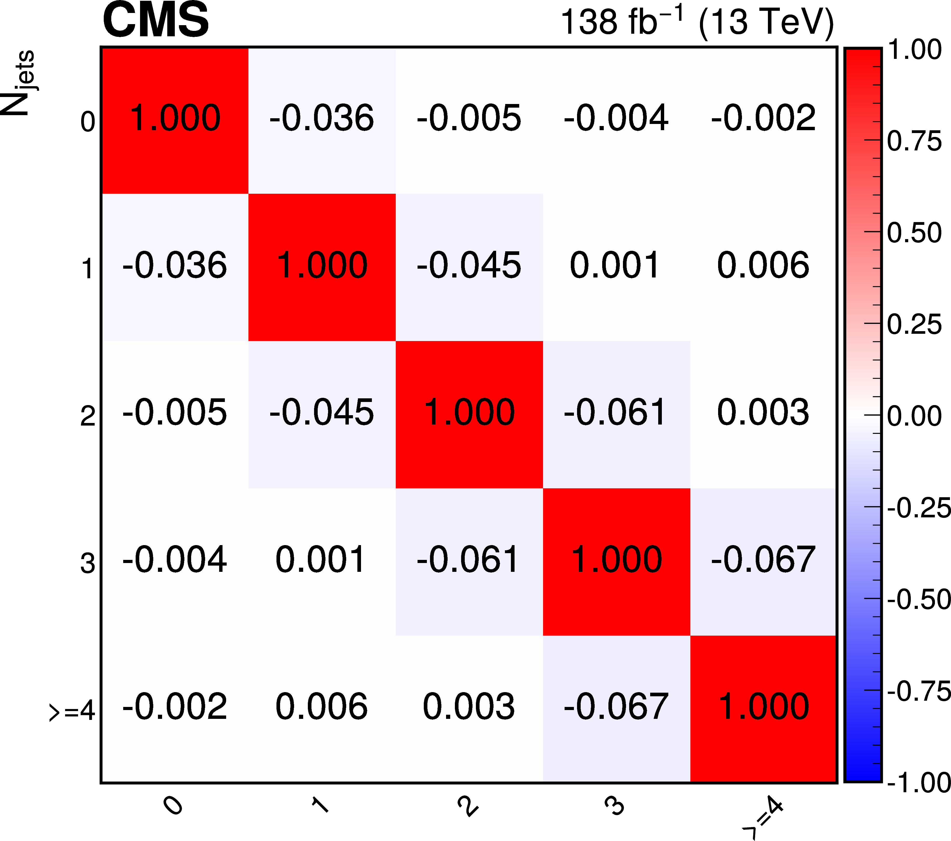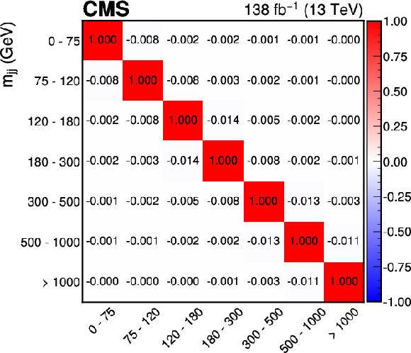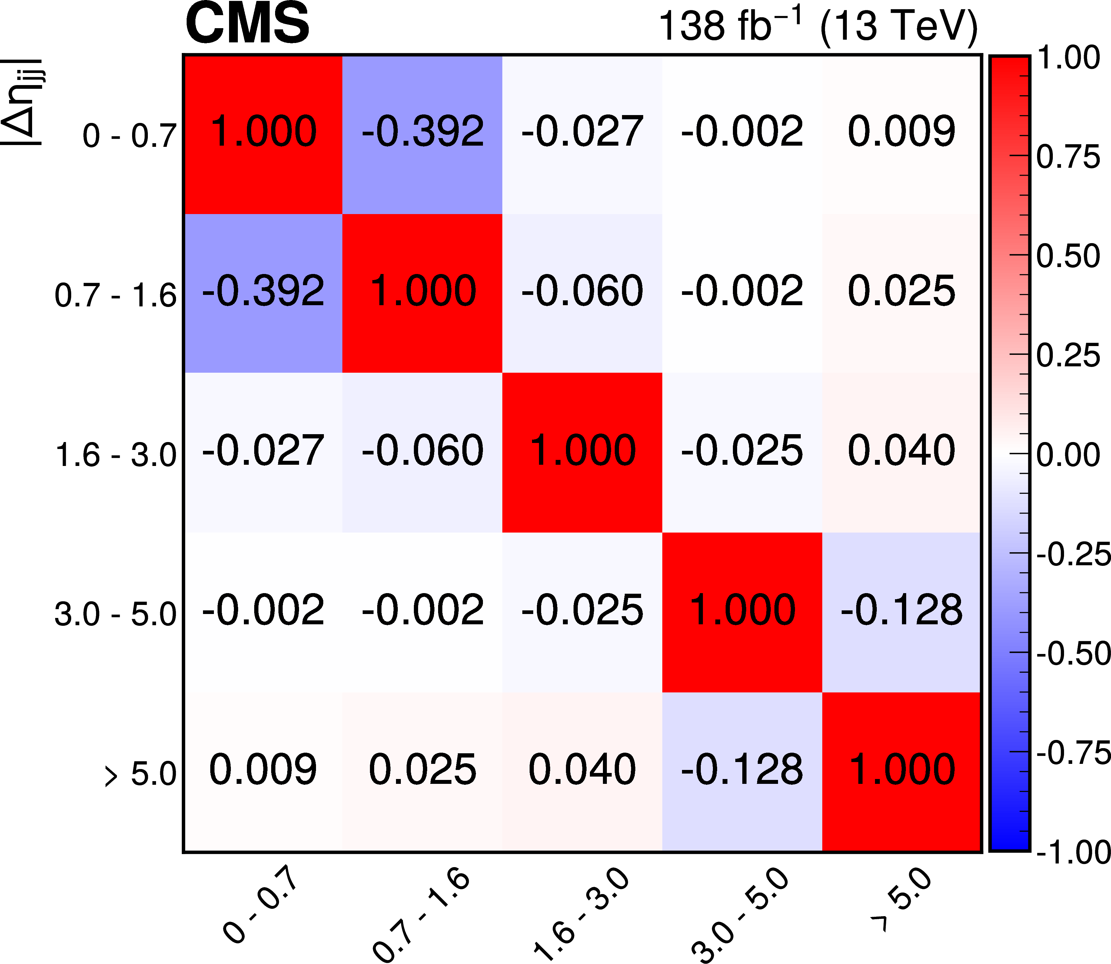 Bin-to-bin correlation matrices for the $ m_{\mathrm{jj}} $ (upper left), $ |\Delta\eta_{\mathrm{jj}}| $ (upper right) and $ \tau^{\mathrm{j}}_{\mathrm{C}} $ (lower) spectra. |