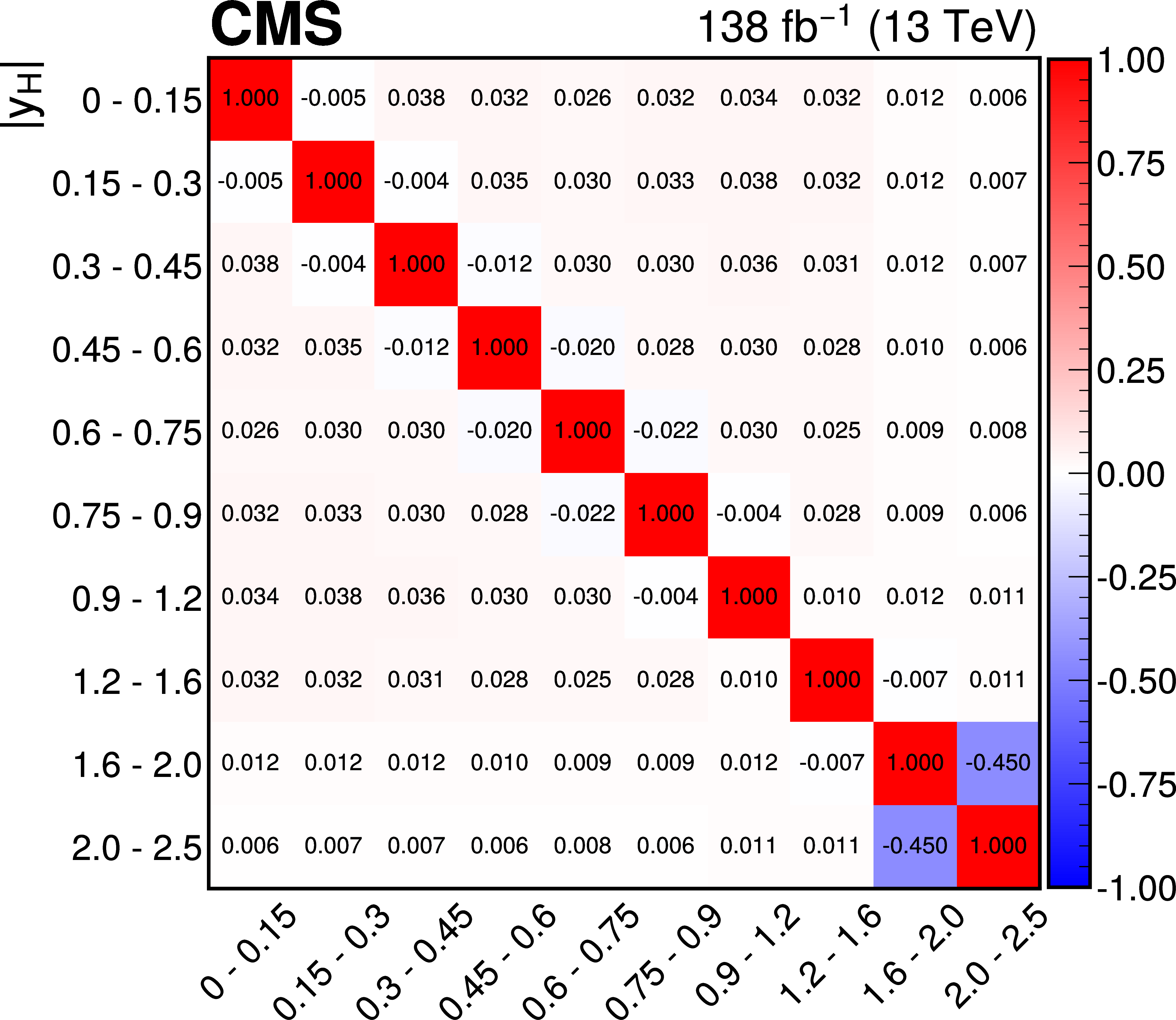 Bin-to-bin correlation matrices for the $ p_{\mathrm{T}}^{\mathrm{H}} $ (upper left), $ N_{\mathrm{jets}} $ (upper right), $ |y_{\mathrm{H}}| $ (lower left), and $ p_{\mathrm{T}}^{\mathrm{j}_1} $ (lower right) spectra. |