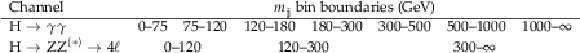 The $ m_{\mathrm{jj}} $ bin boundaries used in the analyses that are input to the combination. |