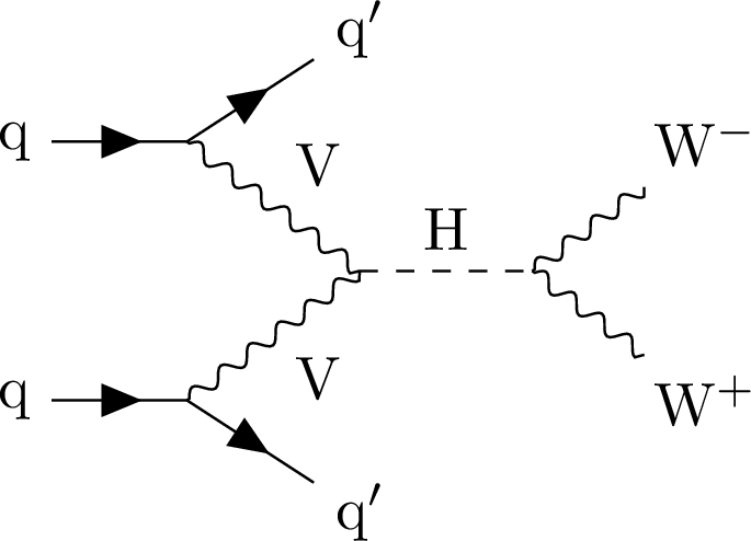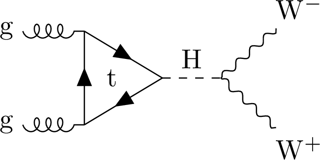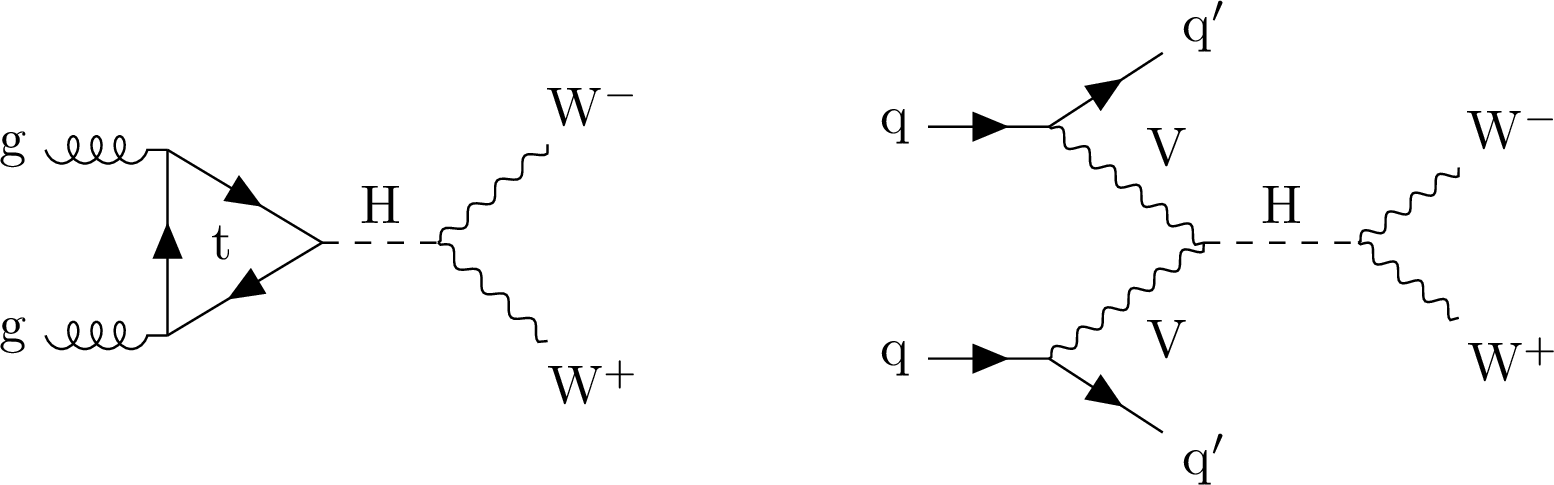 Feynman diagrams illustrating Higgs boson production and decays to WW in ggF (left) and VBF (right) modes. |