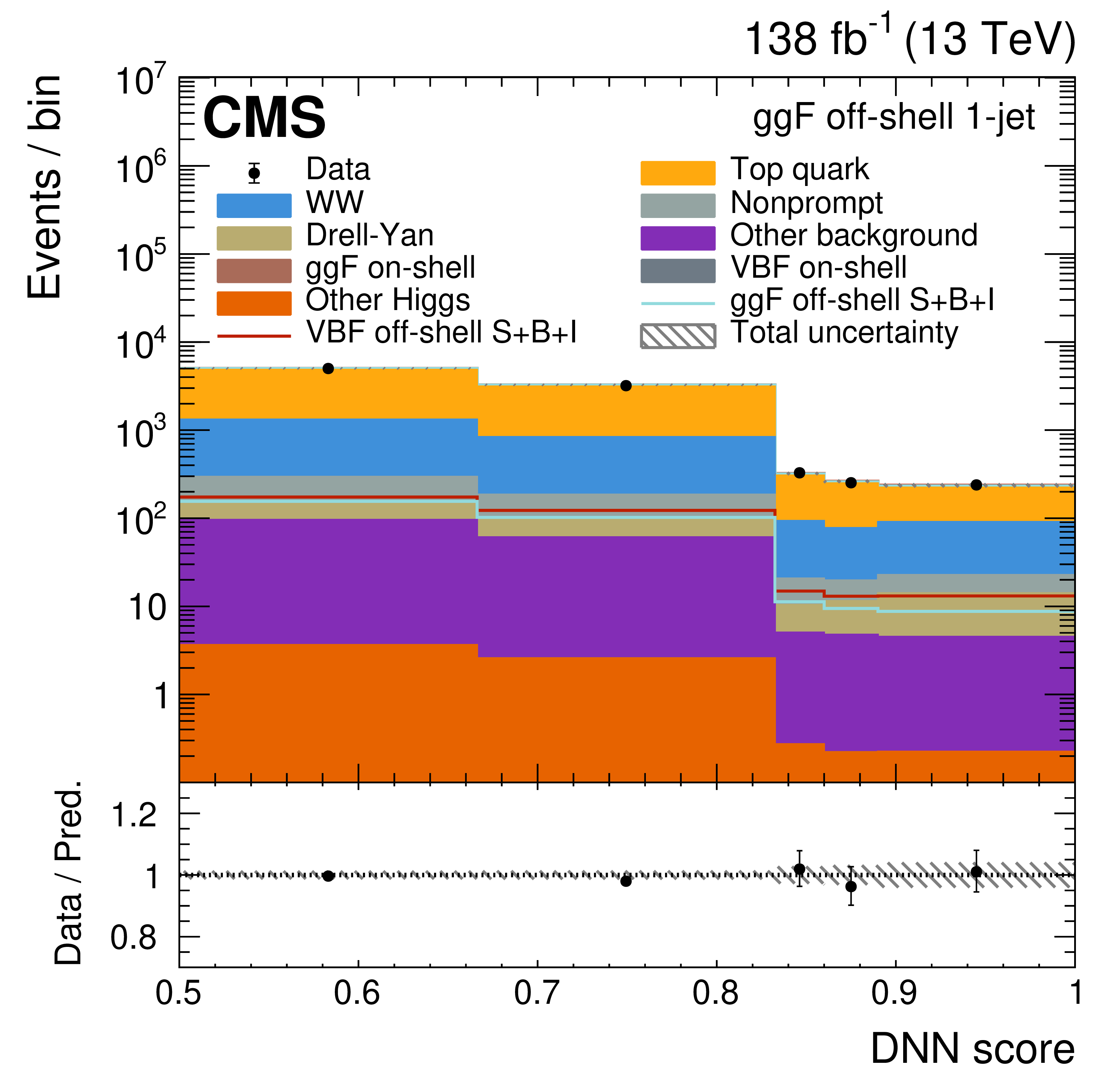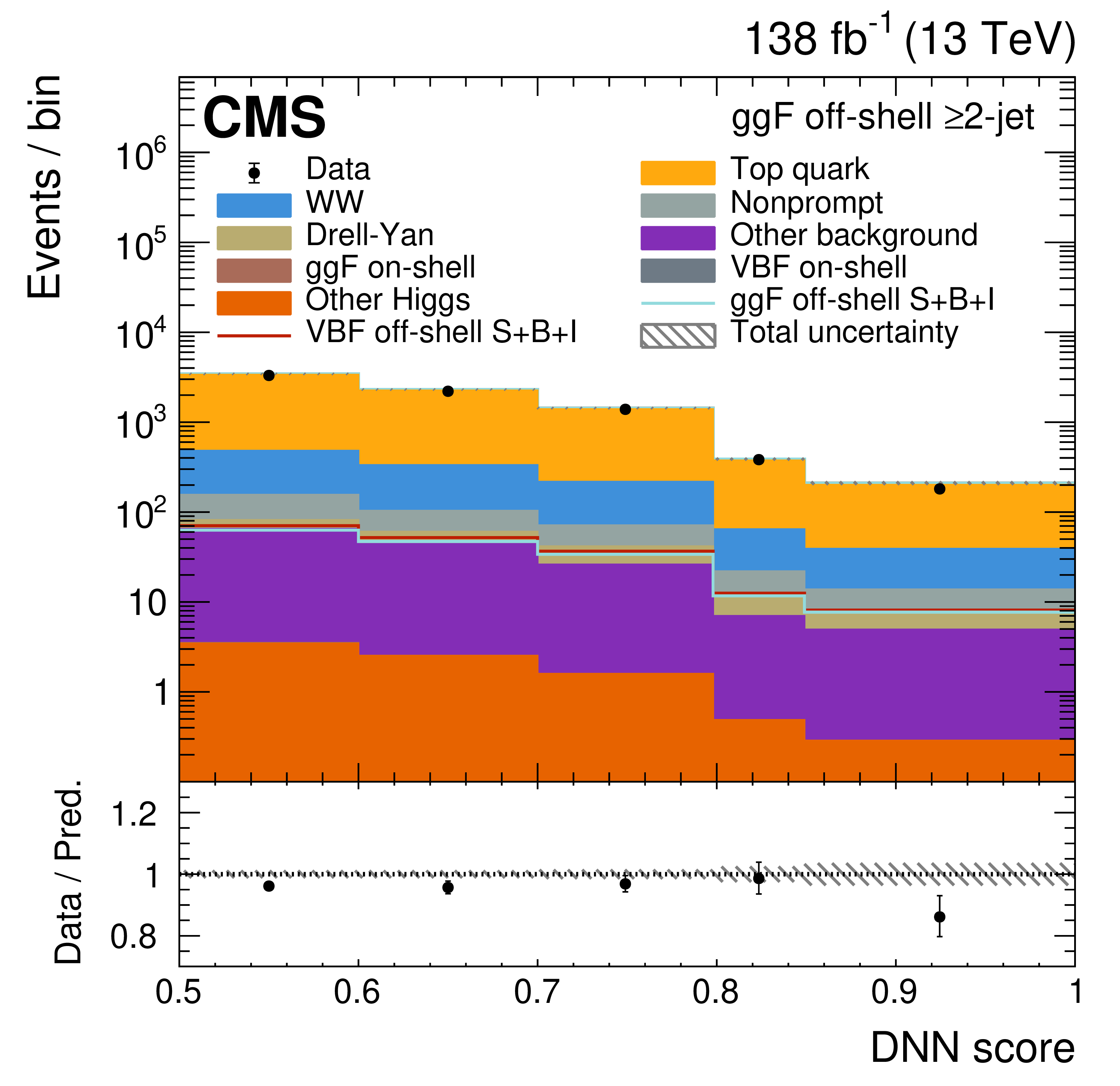The off-shell SR post-fit DNN output distributions for the 0-jet (upper left), 1-jet (upper right), and $ \geq $2-jet (lower plots) event categories. The data are shown as the black dots, with the vertical bars representing the statistical uncertainties. The predicted signal and background distributions are shown by the various colored histograms. The predicted signal ggF and VBH off-shell $ S+B+I $ distributions are displayed both as part of the total stacked histograms, along with all the predicted background distributions, and on top of the stacked background distributions for visibility. The lower portion of the plots gives the ratio of the data to the total predicted yields, including the post-fit signal. The hatched area represents the total uncertainty in the ratio. |