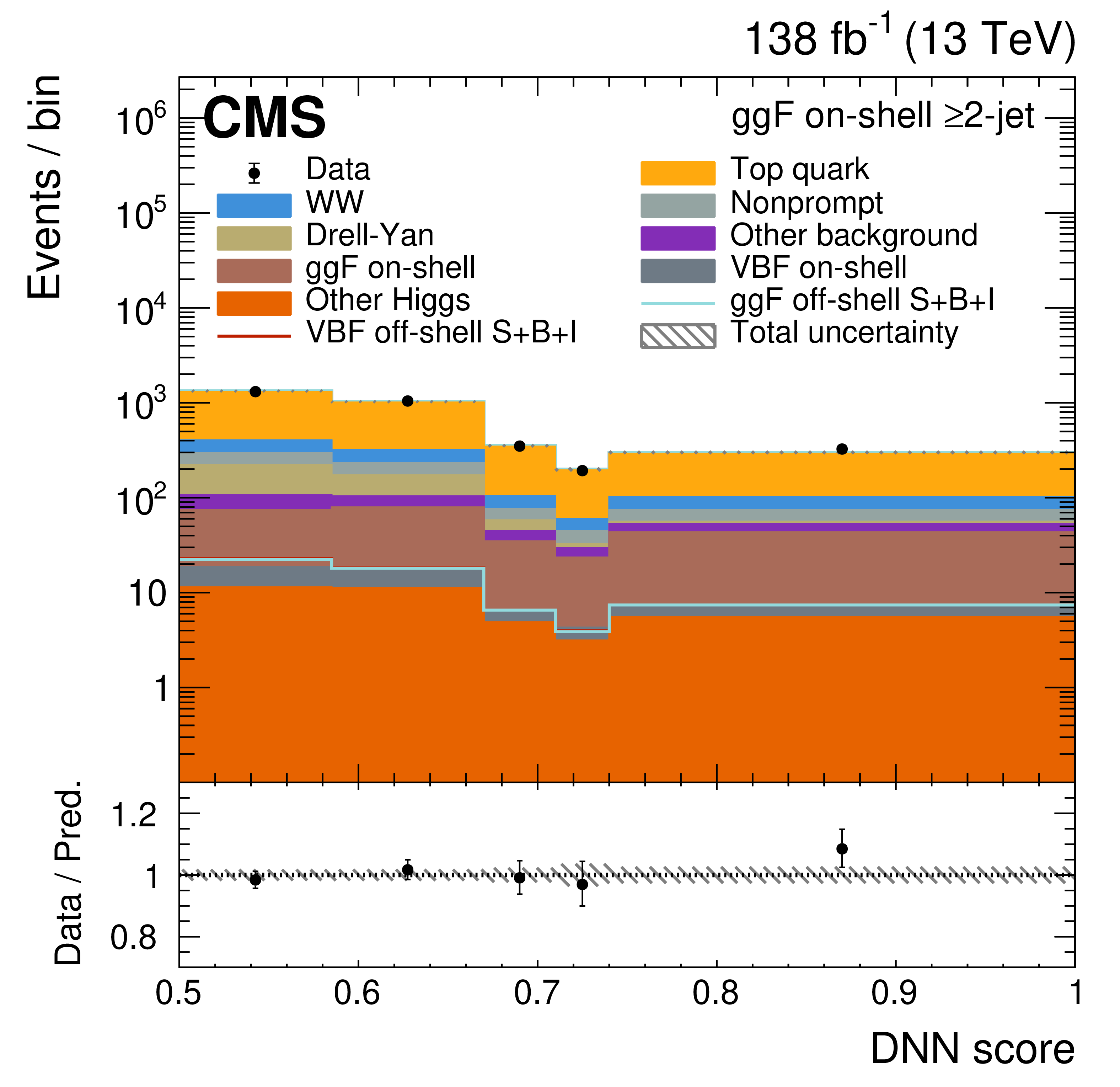 The on-shell CR post-fit DNN output distributions for the 0-jet (upper left), 1-jet (upper right), and $ \geq $2-jet (lower plots) event categories. The data are shown as the black dots, with the vertical bars representing the statistical uncertainties. The predicted signal and background distributions are shown by the various colored histograms. The predicted signal ggF and VBH off-shell $ S+B+I $ distributions are displayed both as part of the total stacked histograms, along with all the predicted background distributions, and on top of the stacked background distributions for visibility. The lower portion of the plots gives the ratio of the data to the total predicted yields, including the post-fit signal. The hatched area represents the total uncertainty in the ratio. |