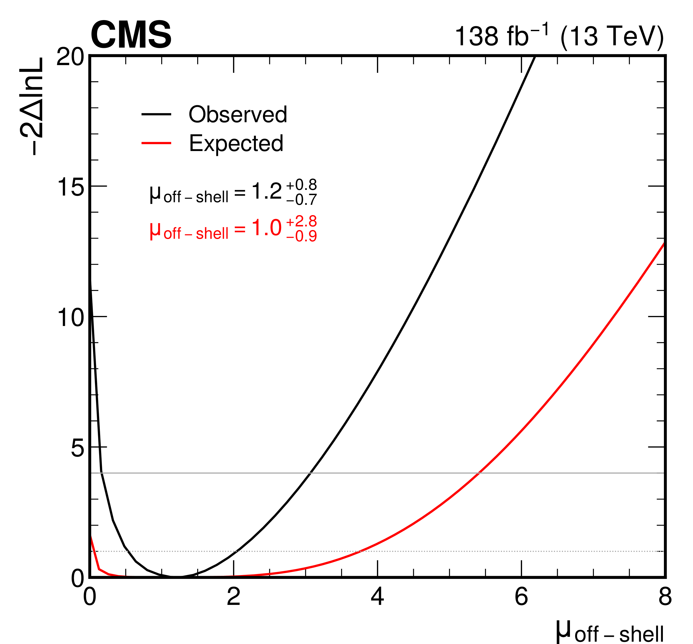 The observed (black curve) and expected (red curve) likelihood function scans for the off-shell signal strength $ \mu_{\text{off-shell} } $ (left) and the Higgs boson decay width $ \Gamma_{\mathrm{H}} $ (right). The resulting best-fit observed and expected values are also given, along with their uncertainties. The 68 and 95% confidence level intervals are shown by the intersection of the likelihood function curves with the dotted and solid horizontal lines, respectively. |