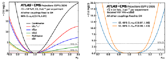 Left: Expected ATLAS+CMS $ \kappa_{3} $ likelihood scans for single decay channels and the combination for 3 ab$ ^{-1} $ for the S3 scenario, obtained fixing $ \kappa_{3}^\mathrm{true}= $ 1. Right: The ATLAS+CMS projections for $ \kappa_{2V} $ in the S2 and S3 scenarios, fixing $ \kappa_{2V}^\mathrm{true}= $ 1. |