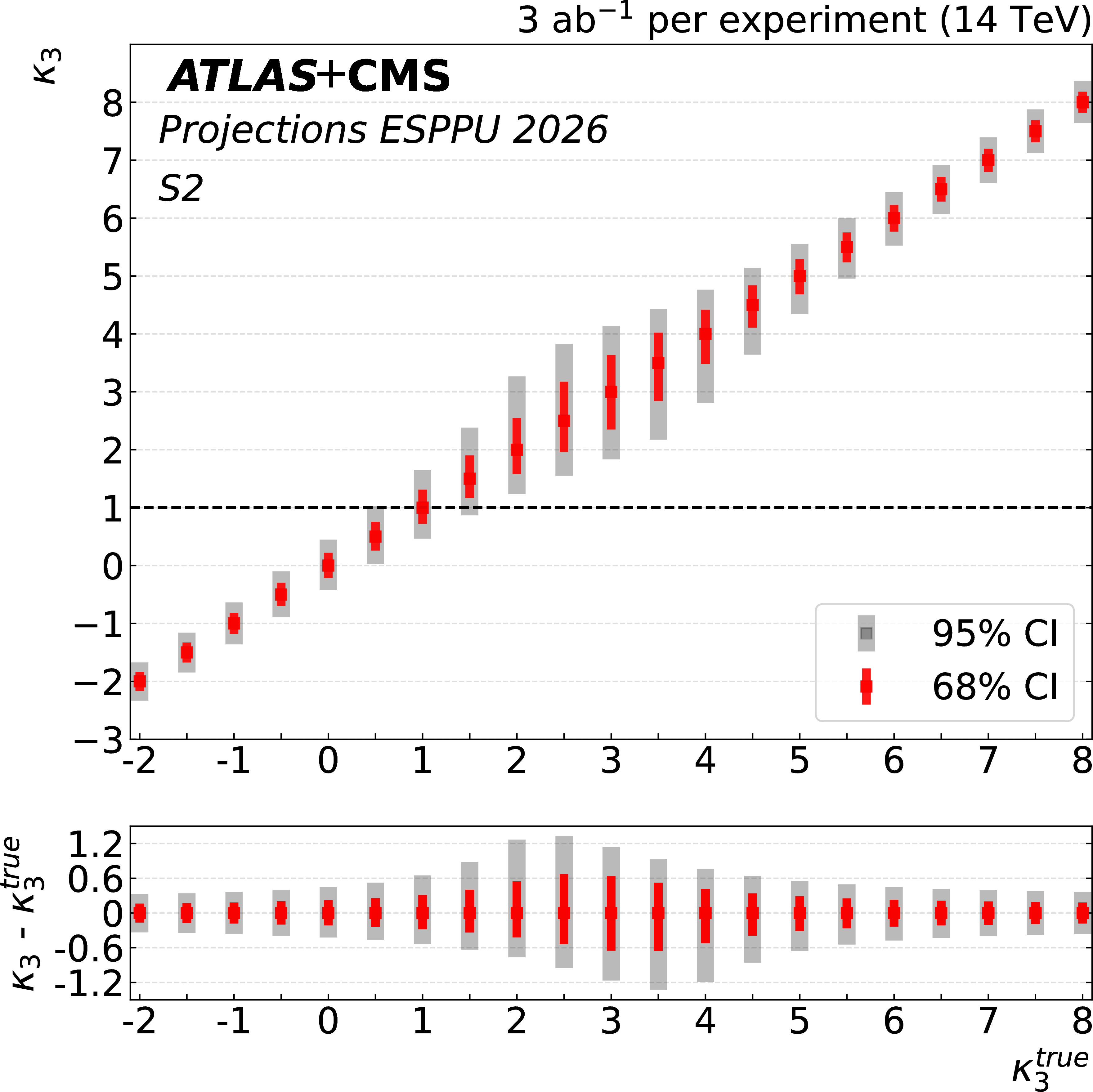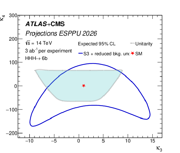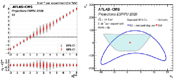 Left: The ATLAS+CMS projection on the precision of the determination of $ \kappa_{3} $ as a function of $ \kappa_{3}^\mathrm{true} $. The 68% and 95% confidence intervals are shown in the upper plot, while the lower plot shows the $ \kappa_{3} $ deviation from the simulated $ \kappa_{3}^\mathrm{true} $ value and its 68% and 95% confidence intervals. Right: 95% CL constraints from the $ \mathrm{HHH} $ search projection on $ \kappa_3 $ and $ \kappa_4 $. Results are shown for 3 ab$ ^{-1} $ per experiment at $ \sqrt{s}= $ 14 TeV in scenario S3 with data-driven background uncertainties. Unitarity limits, as calculated in Ref. [57], are overlaid in the region bounded by the grey dashed line. |