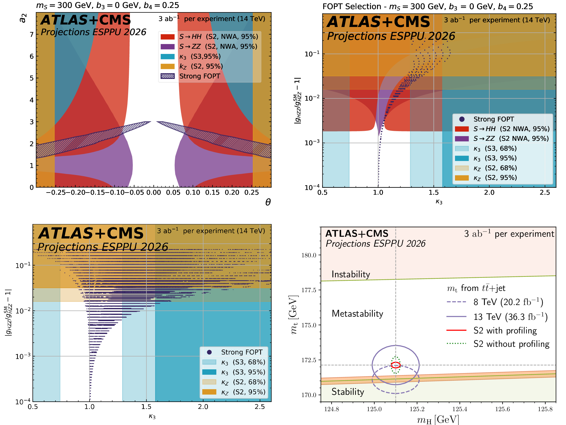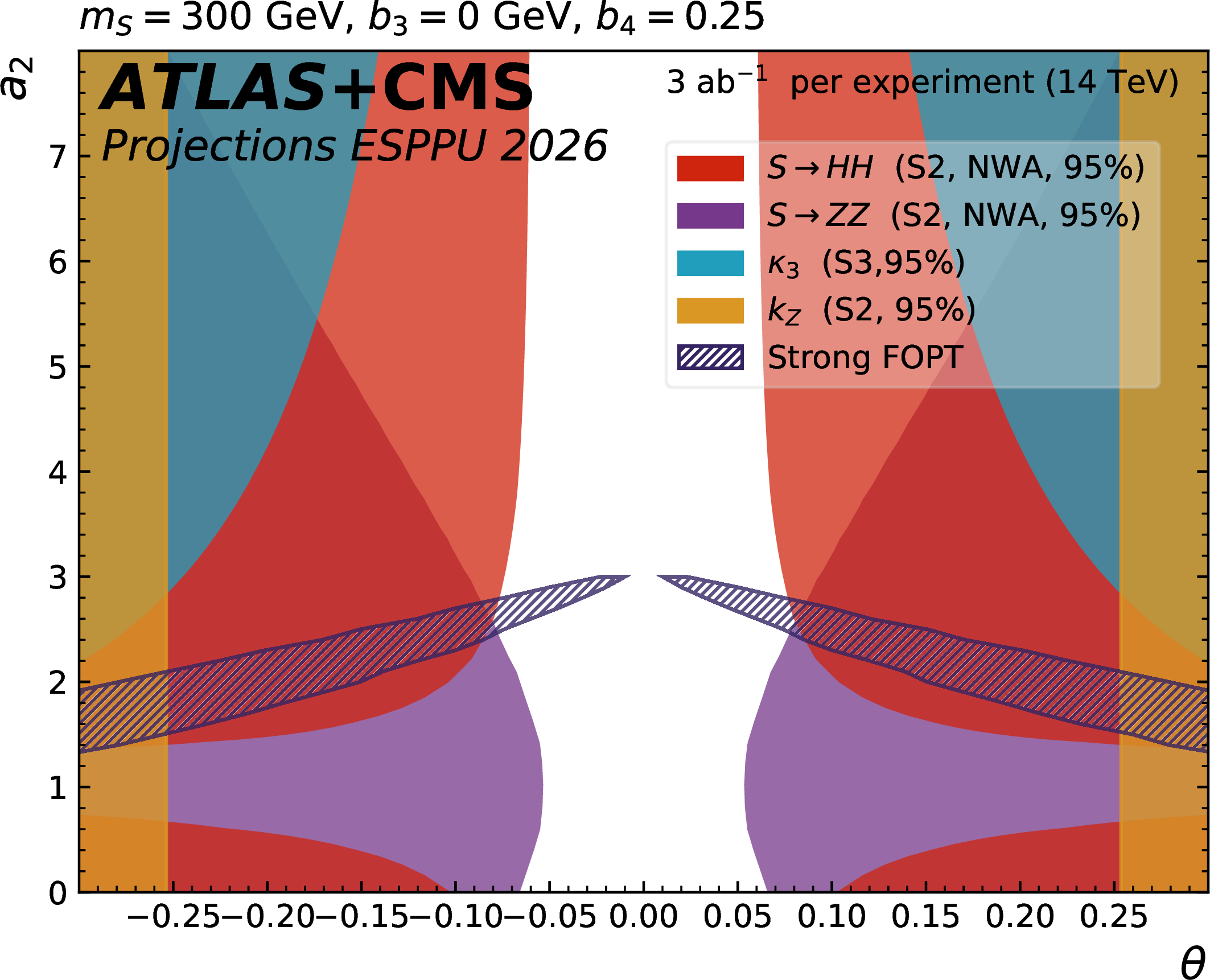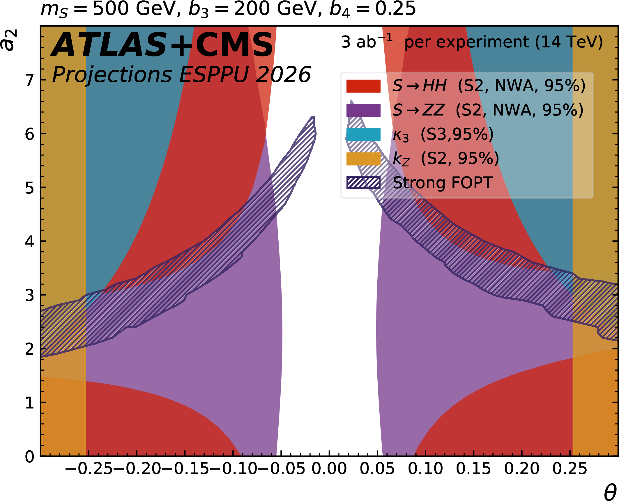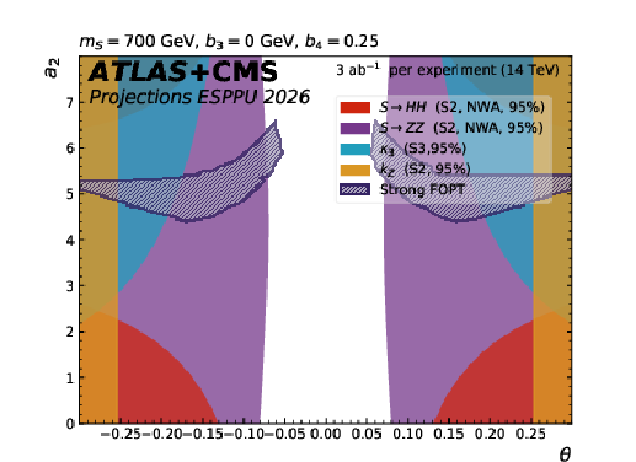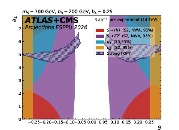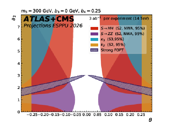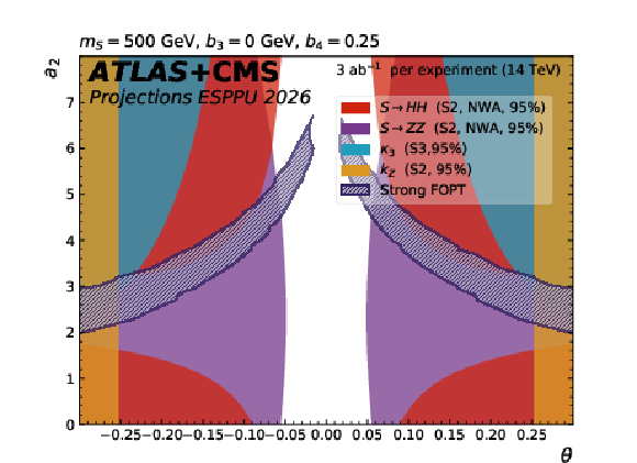 The dark blue hatched contours show the regions of the $ a_2 $ versus $ \theta $ parameter space in the scalar singlet model where a strong first-order phase transition is possible. The other contours show the 95% CL exclusion in this plane from the searches for resonant $ \mathrm{ S \to HH(ZZ) } $ decays, from the H coupling to Z and from $ \kappa_{3} $ constraints. The different plots correspond to representative parameter choices in the model. |