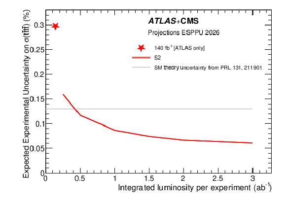 Expected 95% CL upper limits on the $ \mathrm{ \sigma(pp \to S \to ZZ)} $ (left) and $ \mathrm{ \sigma(pp \to S t \bar t \to t \bar t t \bar t) }$ (right) cross sections as a function of the scalar mass $ m_{\mathrm{S}} $, produced via gluon fusion using the narrow width approximation. The projection is derived assuming 3 ab$^{-1}$ per experiment for the S2 scenario at 14 TeV. |
