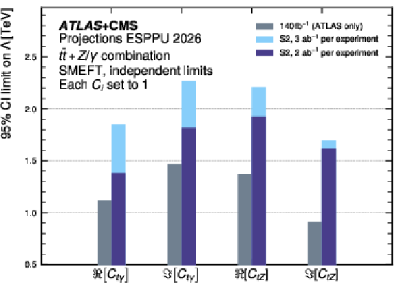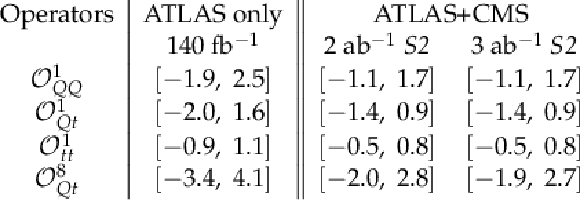 Evolution of the expected 95% CL bound on $ C_i/\Lambda^2 $ as a function of integrated luminosity for the SMEFT operator $ \mathcal{O}^{8}_{Qt} $ obtained from the ATLAS+CMS combination of the inclusive $ \mathrm{ t\bar{t}t\bar{t} } $ production cross section measurements in the S2 scenario. The impact of the experimental and total uncertainties are shown separately. |
