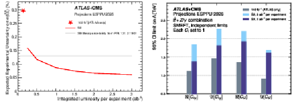 Left: Expected experimental uncertainty in the $ \mathrm{t\bar{t}t\bar{t}} $ cross section measurement. Right: Projected 95% confidence intervals on the new physics energy scale $ \Lambda $ from the combined constraints of $ \mathrm{t \bar t Z } $ and $ \mathrm{t \bar t \gamma} $ cross section measurements on EFT operators related to the electroweak dipole moments of the top quark, derived for EFT operator couplings $ C_i= $ 1. |