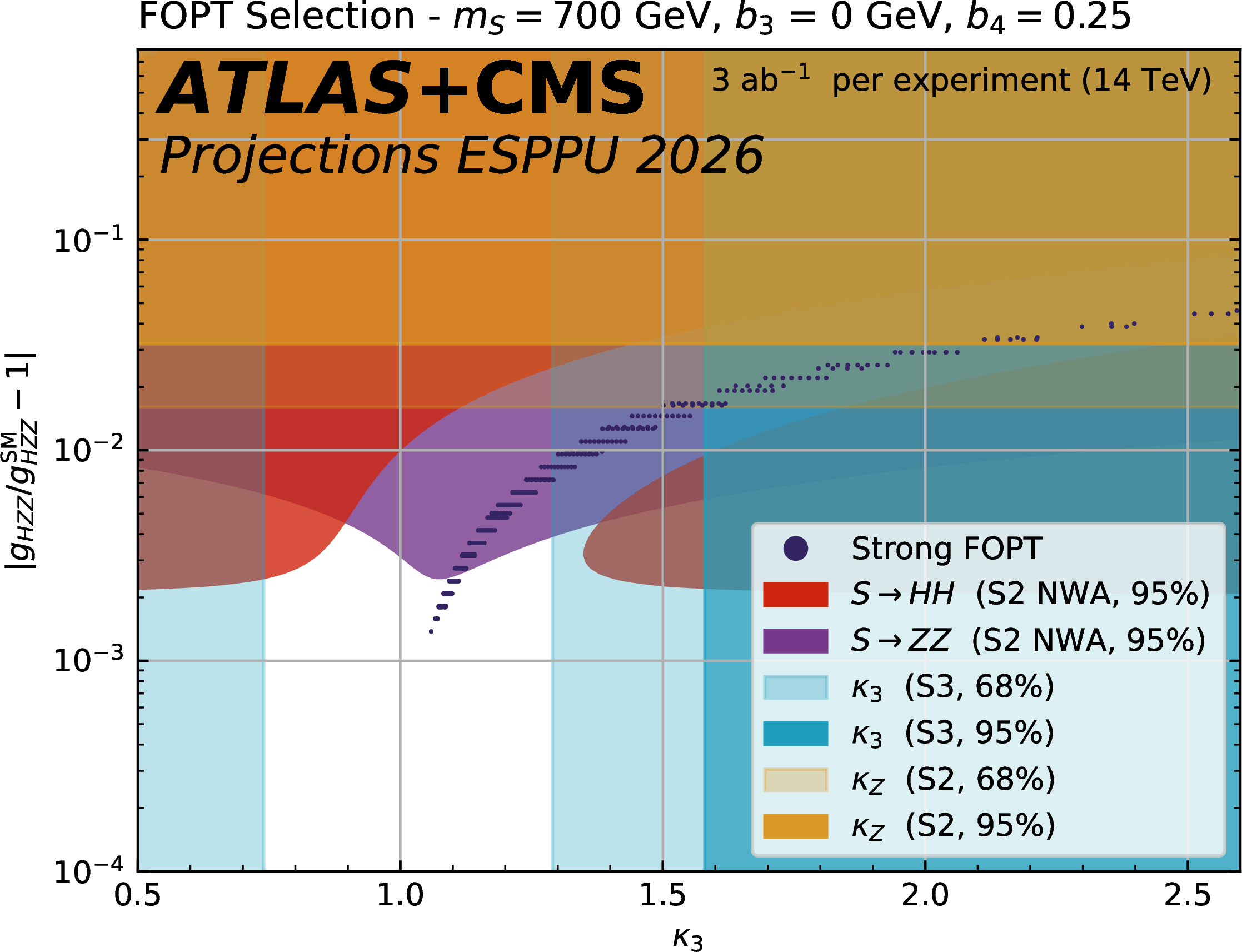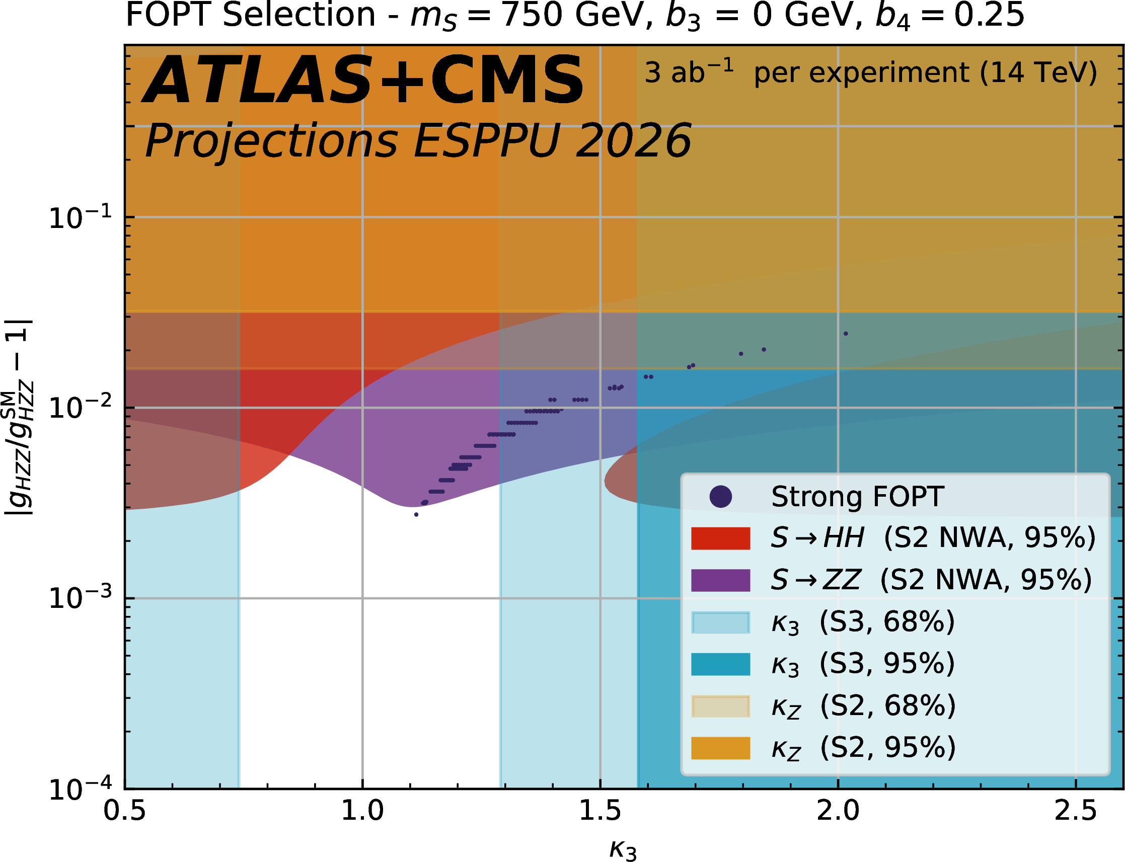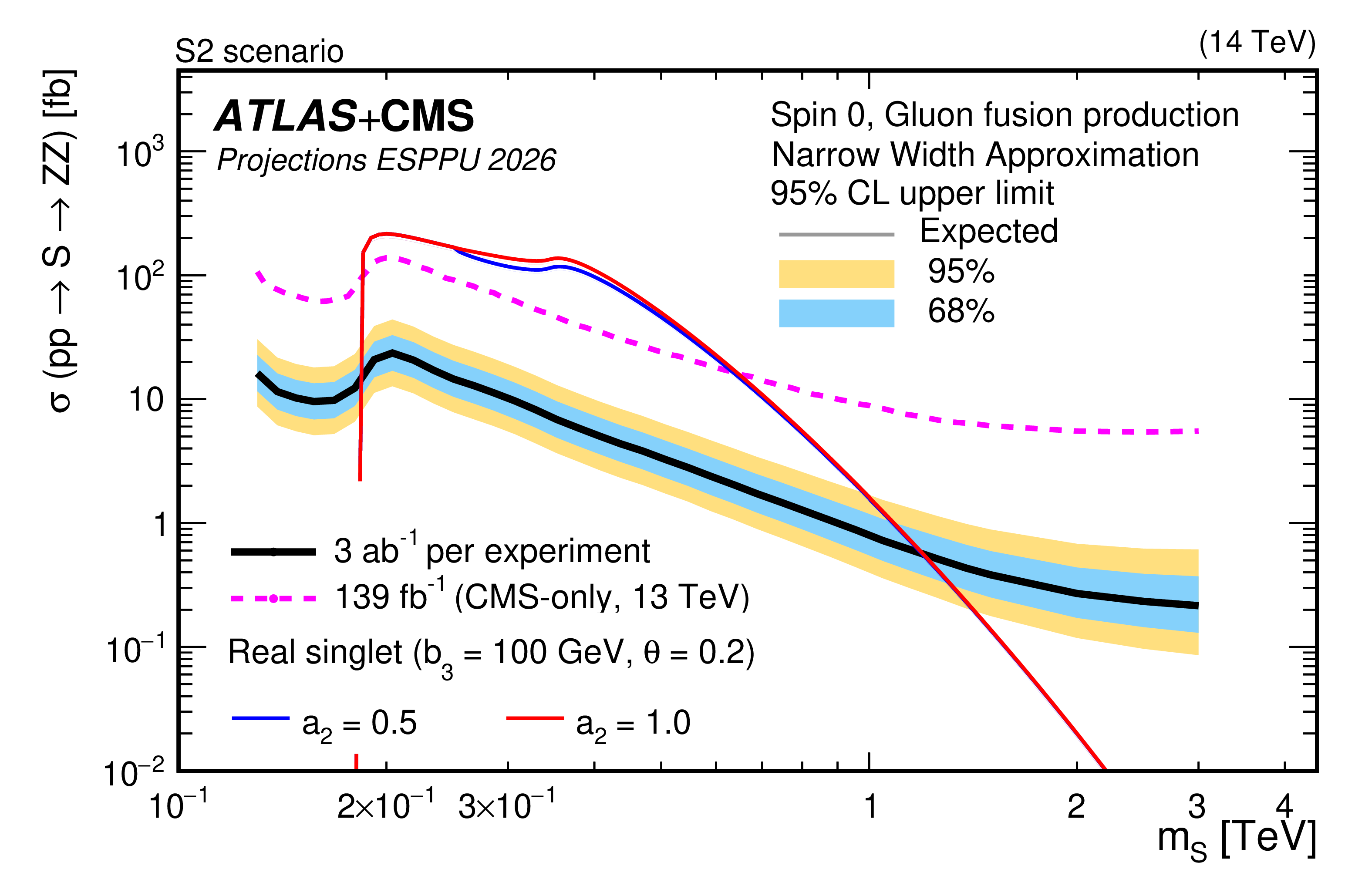 Expected 95% CL upper limits on the $\mathrm{ \sigma(pp \to S \to HH } $ cross section as a function of the scalar mass $ m_{\mathrm{S}} $, produced via gluon fusion using the narrow width approximation. The projection is derived assuming 3 ab$^{-1}$ per experiment for the S2 scenario at 14 TeV. For comparison, production cross section curves for the model described in Section 7 are shown, for two values of the scalar portal coupling $ a_2 $. |