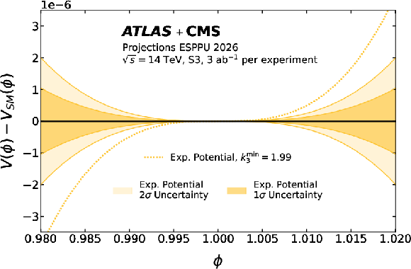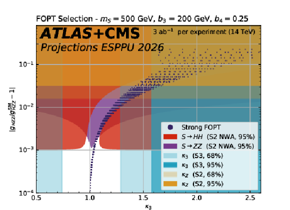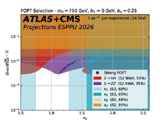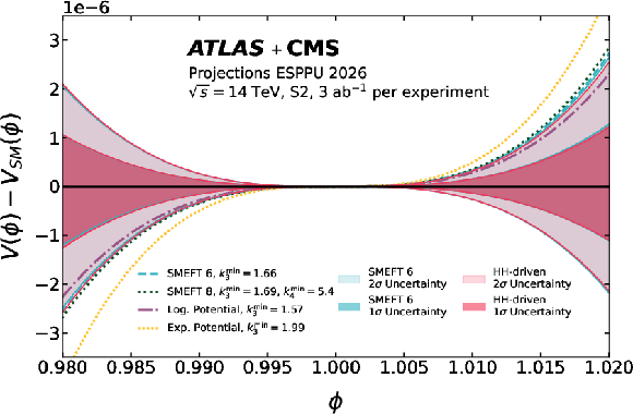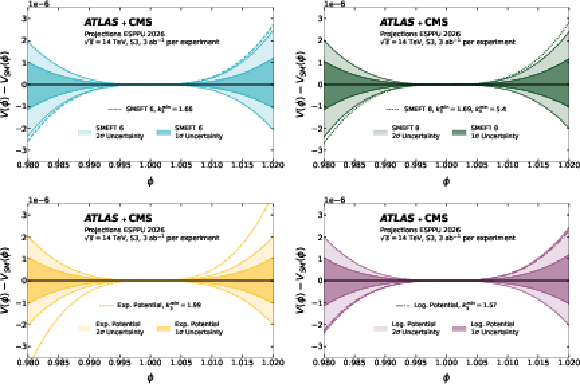 The difference between the BEH potential $ V(\phi) $ and its SM expectation $ V_{SM}(\phi) $ in four scenarios: SMEFT 6 (top left), SMEFT 8 (top right), exponential (bottom left), and logarithmic (bottom right) potentials. The 68% and 95% uncertainty bands from the ATLAS+CMS combination is compared to the boundary of the regions for which each model predicts a strong first-order phase transition. The $ \phi $ range corresponds to the validity range of the HH-driven band. The projection is derived in S3 scenario assuming 3 ab$^{-1}$ per experiment. |