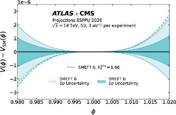 (Top) BEH potentials in various models which predict a first-order phase transition [70]. The models are compared with the SM BEH potential. Two approaches (SMEFT 6 and HH-driven) are used to show the expected uncertainties on the Higgs self-coupling achieved by combining ATLAS and CMS at 3 ab$^{-1}$ in the S3 scenario. The dashed lines show the boundary of the regions for which the alternative models predict a strong first-order phase transition. The arrows indicate the region where the strong first-order phase transition happens. Further details can be found in the text. The bottom panel shows the difference between the potential $V(\phi)$ and its SM expectation $ V_{SM}(\phi) $. Here, the 68% and 95% CL uncertainty bands on the shape of $V(\phi)$ are shown, for the HH-driven and SMEFT 6 potentials (see text). (Bottom) A zoom into the $ V(\phi)-V_{SM}(\phi) $ difference around the minimum of $V(\phi)$, corresponding to the validity range of the HH-driven band. |
