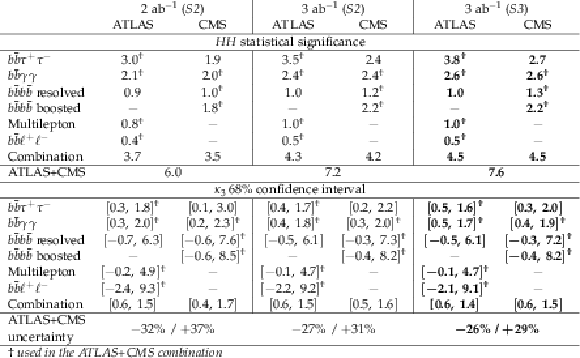 Combined ATLAS and CMS expected statistical significance for $ \mathrm{HH} $ production and the corresponding 68% confidence interval on $ \kappa_{3} $ at 3 ab$ ^{-1} $, derived assuming $ \kappa_{3}^\mathrm{true}= $ 1. The last row reports the projected ATLAS+CMS percentage uncertainty on $ \kappa_{3} $ in the various scenarios. The measurement labelled by the $ \dagger $ symbol have been used in the ATLAS+CMS combination. When the $ \dagger $ symbol is present on only one of the two experiments, this measurement has been extrapolated to 6 ab$^{-1}$ assuming the same sensitivity on that channel for the two experiments. |
