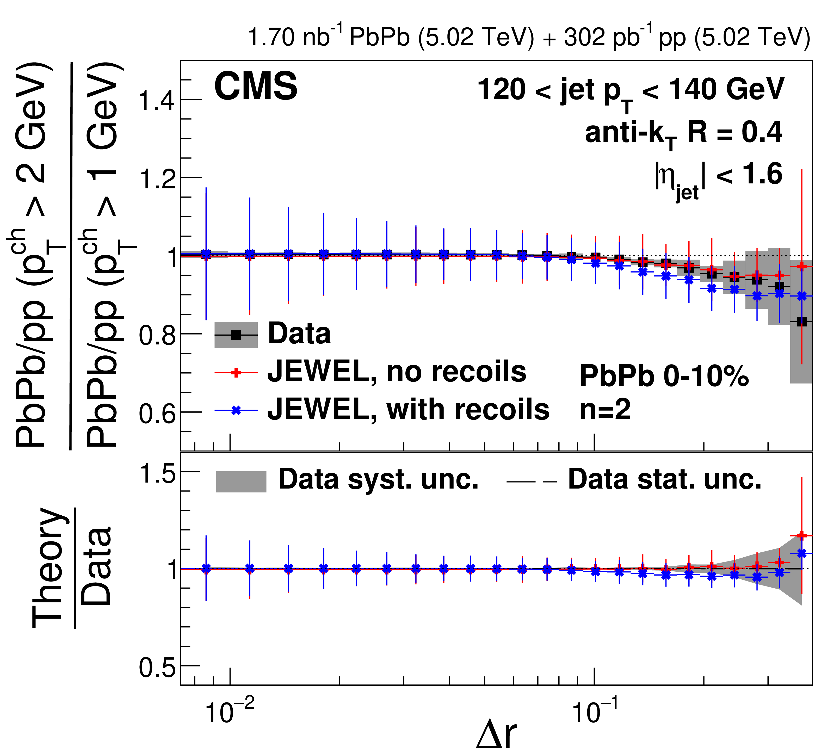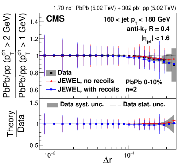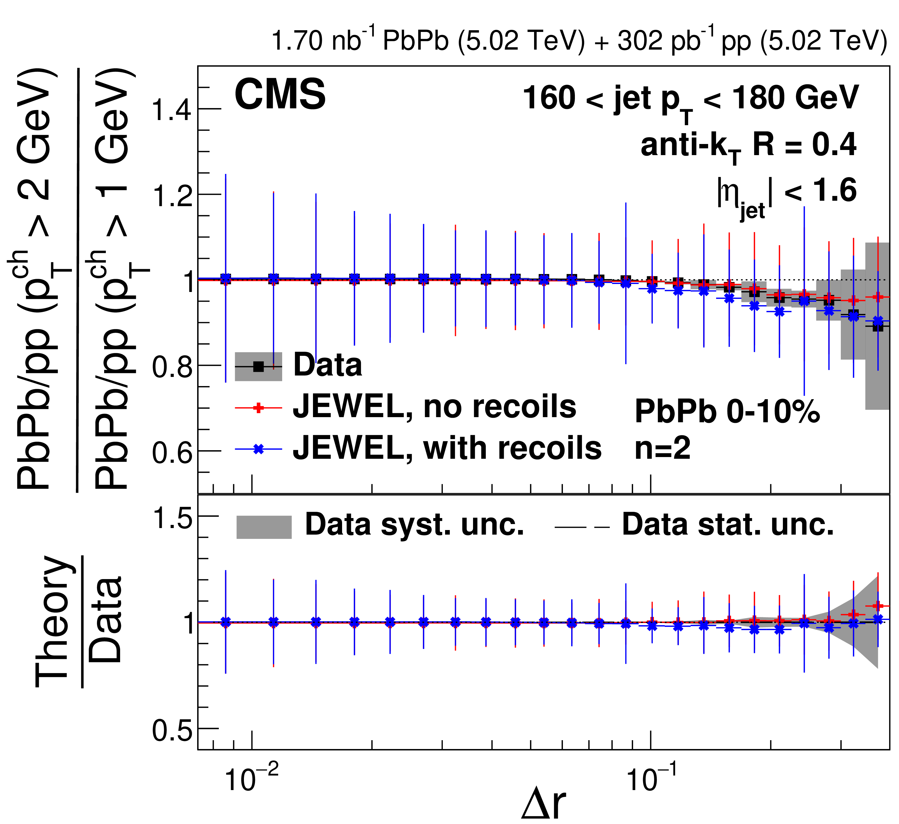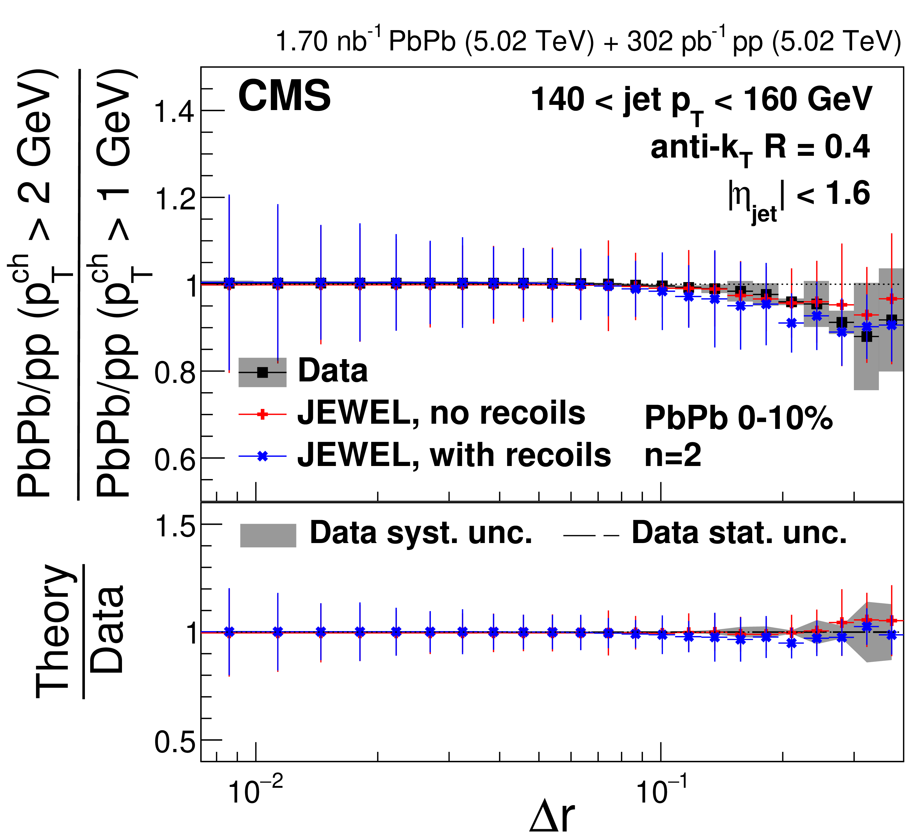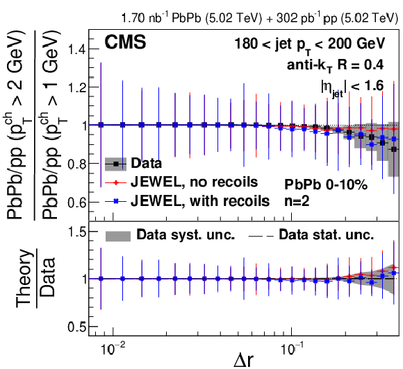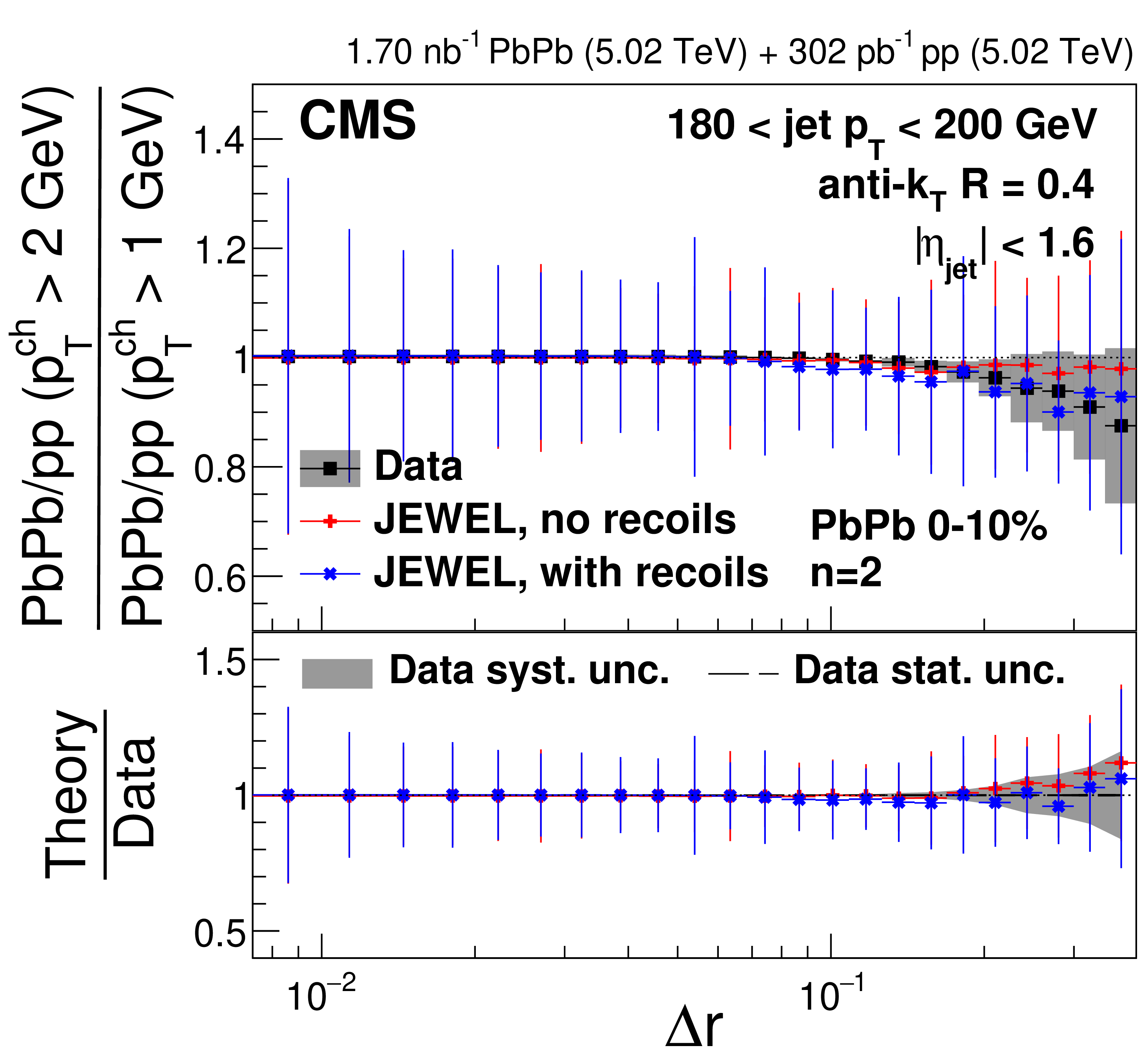 Centrality- and $ p_{\text{T,jet}} $-dependent ratios of PbPb to pp energy-energy correlators with $ p_{\mathrm{T}}^{\text{ch}} > $ 2 GeV and for both $ n= $ 1 (red squares) and $ n= $ 2 (blue circles). The error bars show statistical uncertainties, the point-by-point systematic uncertainties are shown in boxes, while the error bands show systematic uncertainties related to the shape of the ratio. The two colors illustrate that the shape uncertainties tend to tilt the ratio one way or another. |