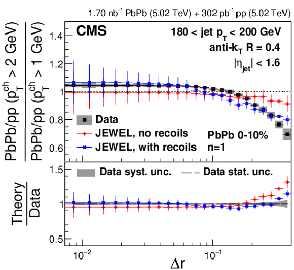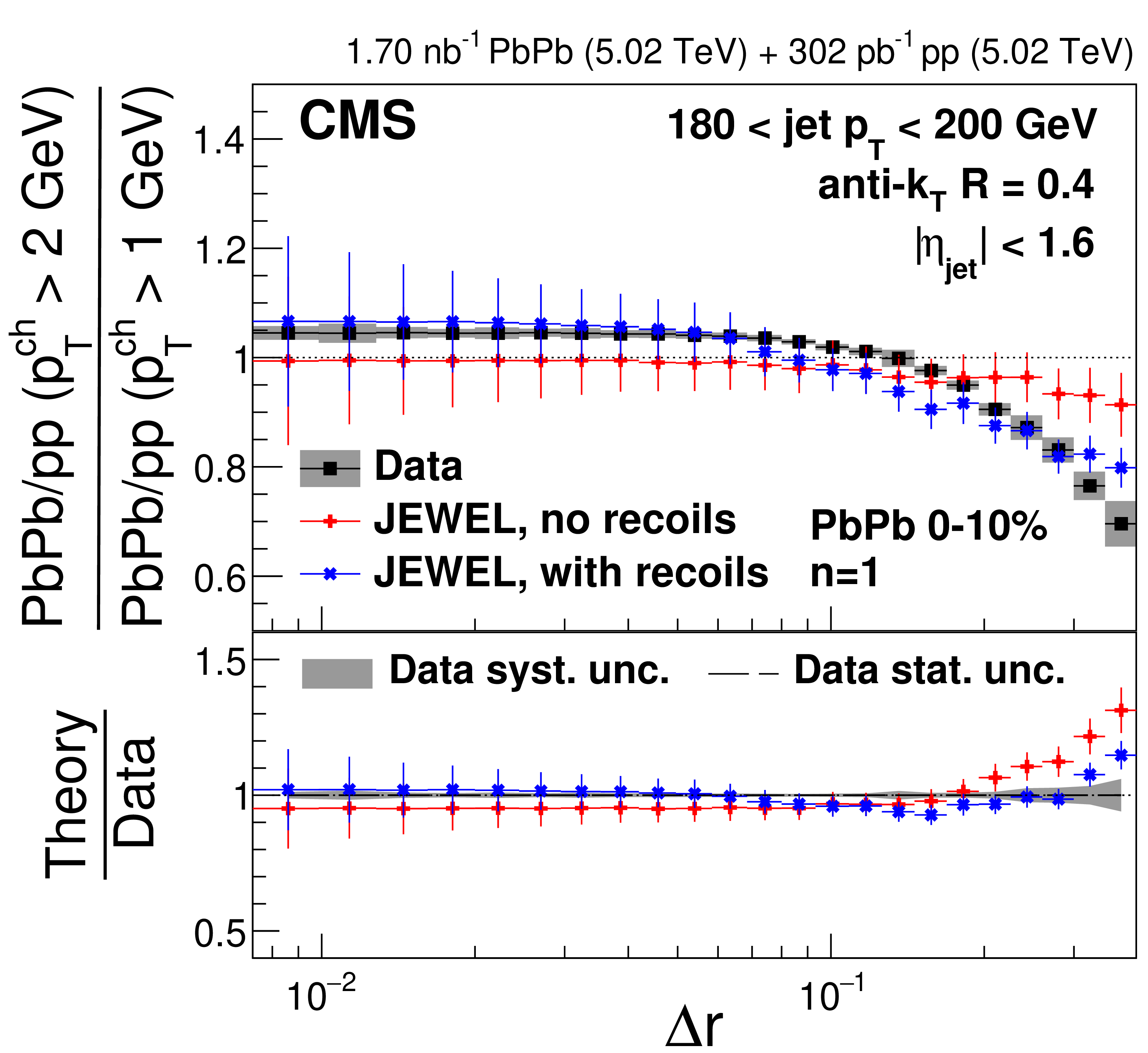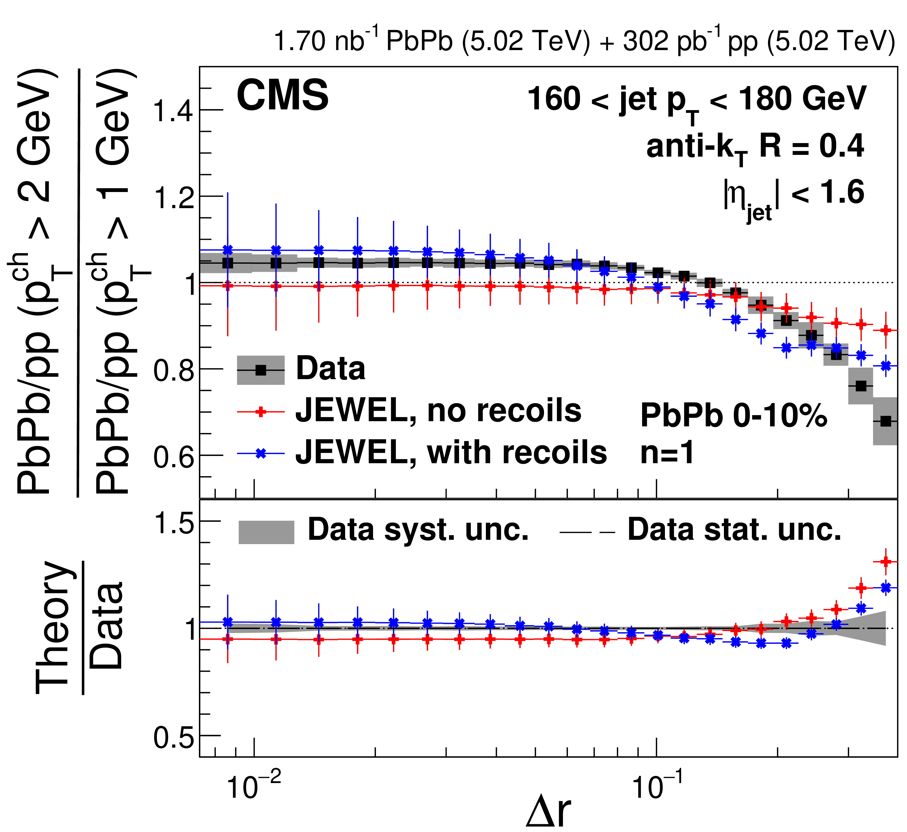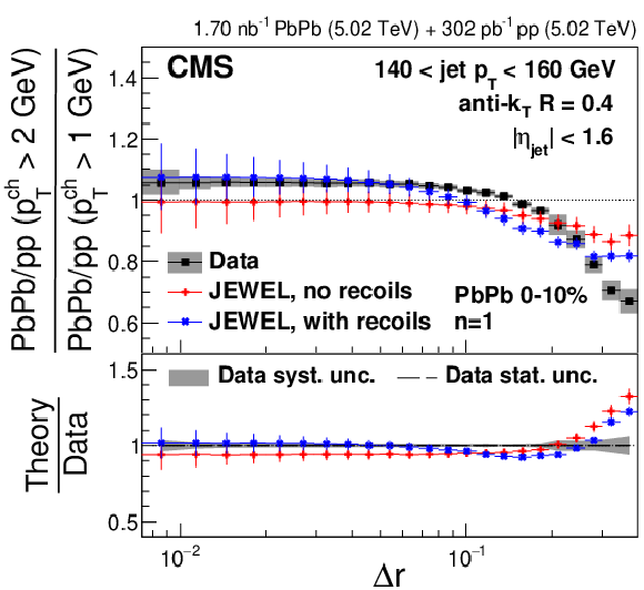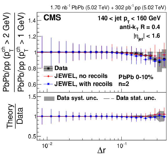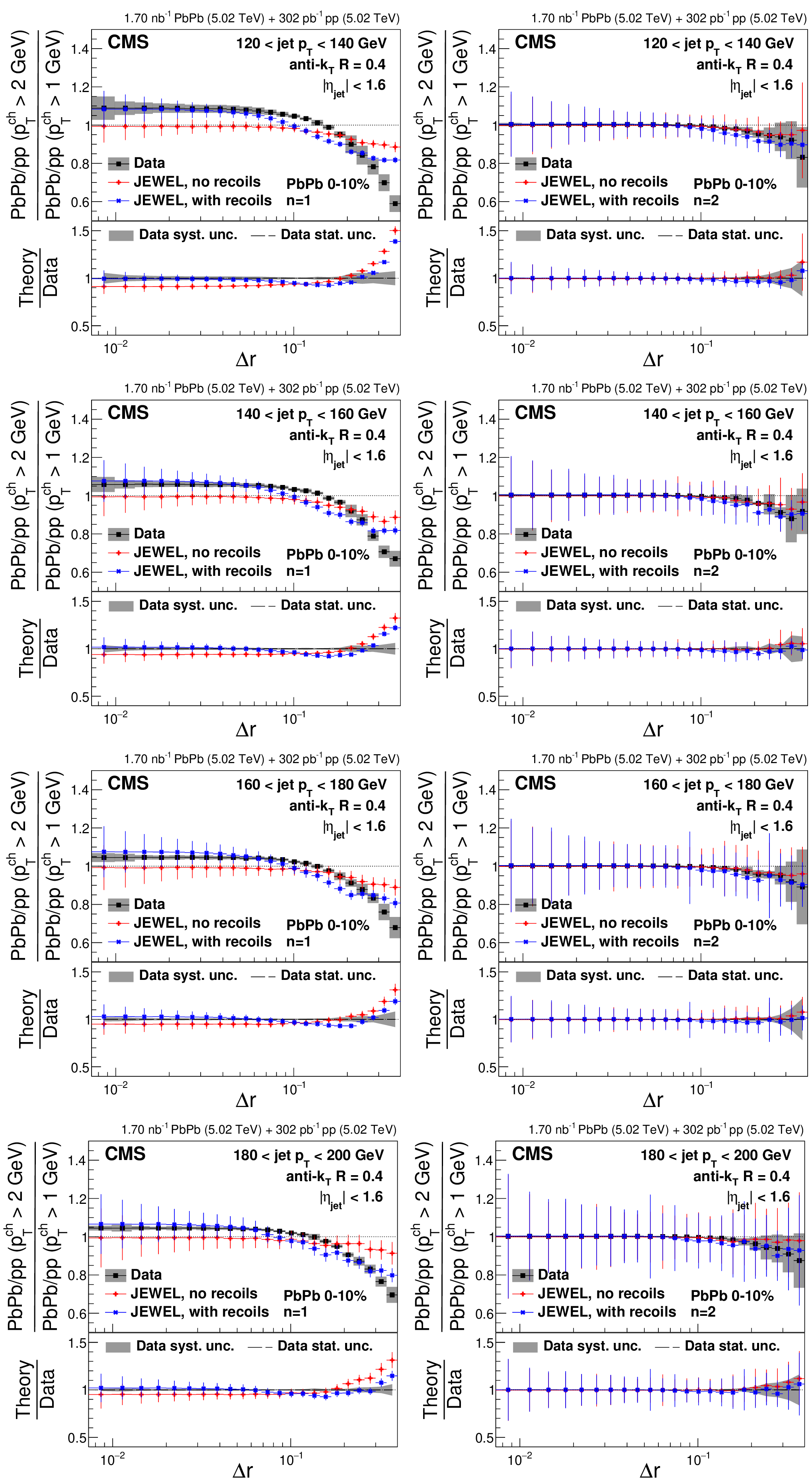 The PbPb to pp ratios of energy-energy correlators with $ p_{\mathrm{T}}^{\text{ch}} > $ 1 GeV and $ n= $ 1 are shown for 120 $ < p_{\text{T,jet}} < $ 140 GeV (left) and 180 $ < p_{\text{T,jet}} < $ 200 GeV (right) together with predictions from perturbative calculation by Holguin and collaborators [85] and from JEWEL simulation [86,87]. In the lower panels, the experimental uncertainties are indicated by the bands around unity. |
