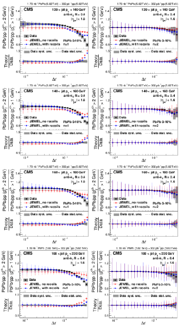 Centrality- and $ p_{\text{T,jet}} $-dependent ratios of PbPb to pp energy-energy correlators with $ p_{\mathrm{T}}^{\text{ch}} > $ 1 GeV and for both $ n= $ 1 (red squares) and $ n= $ 2 (blue circles). The error bars show statistical uncertainties, the point-by-point systematic uncertainties are shown in boxes, while the error bands show systematic uncertainties related to the shape of the ratio. The two colors illustrate that the shape uncertainties tend to tilt the ratio one way or another. |