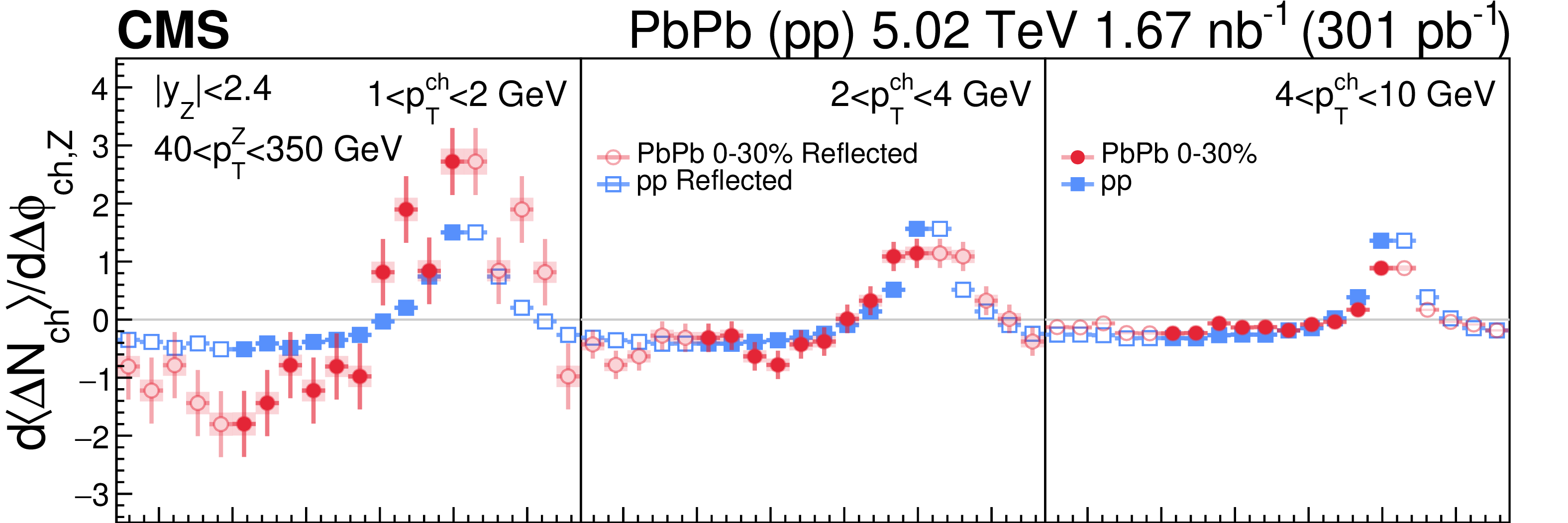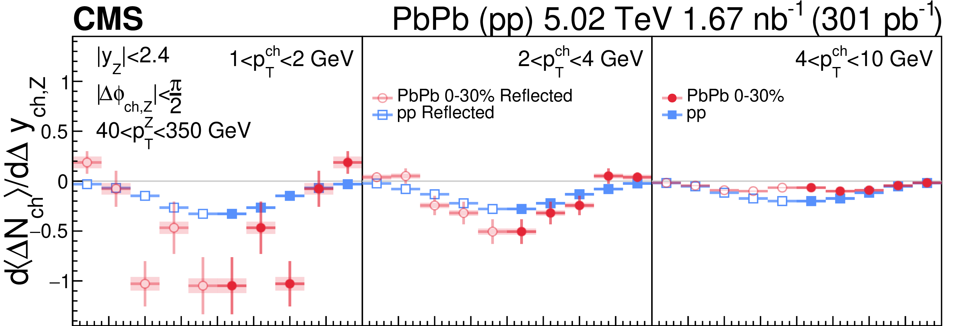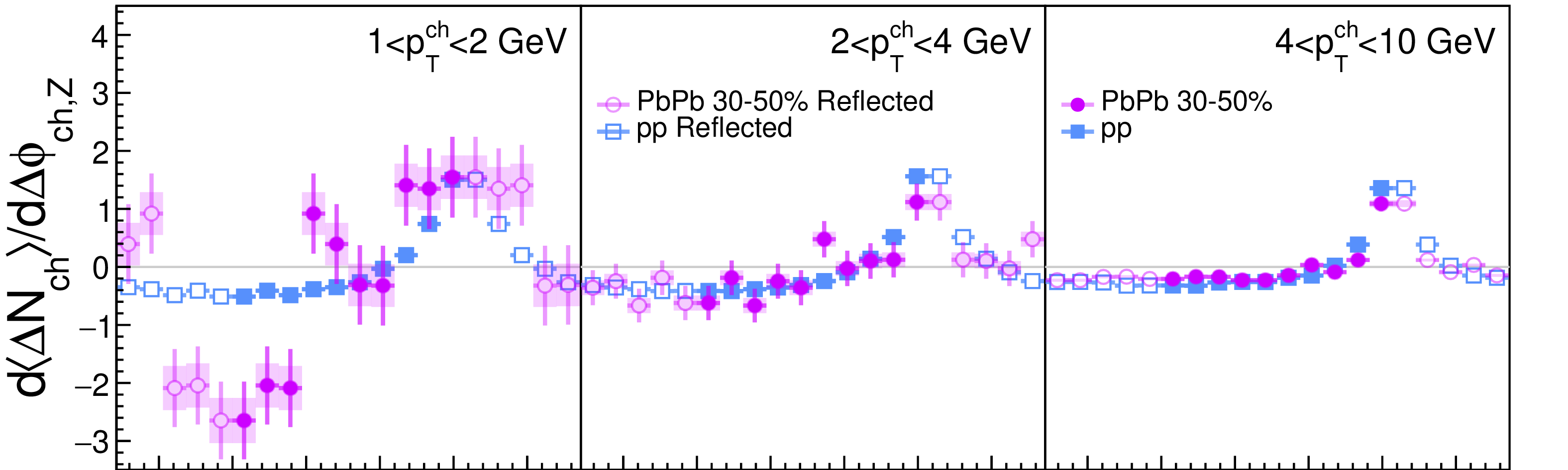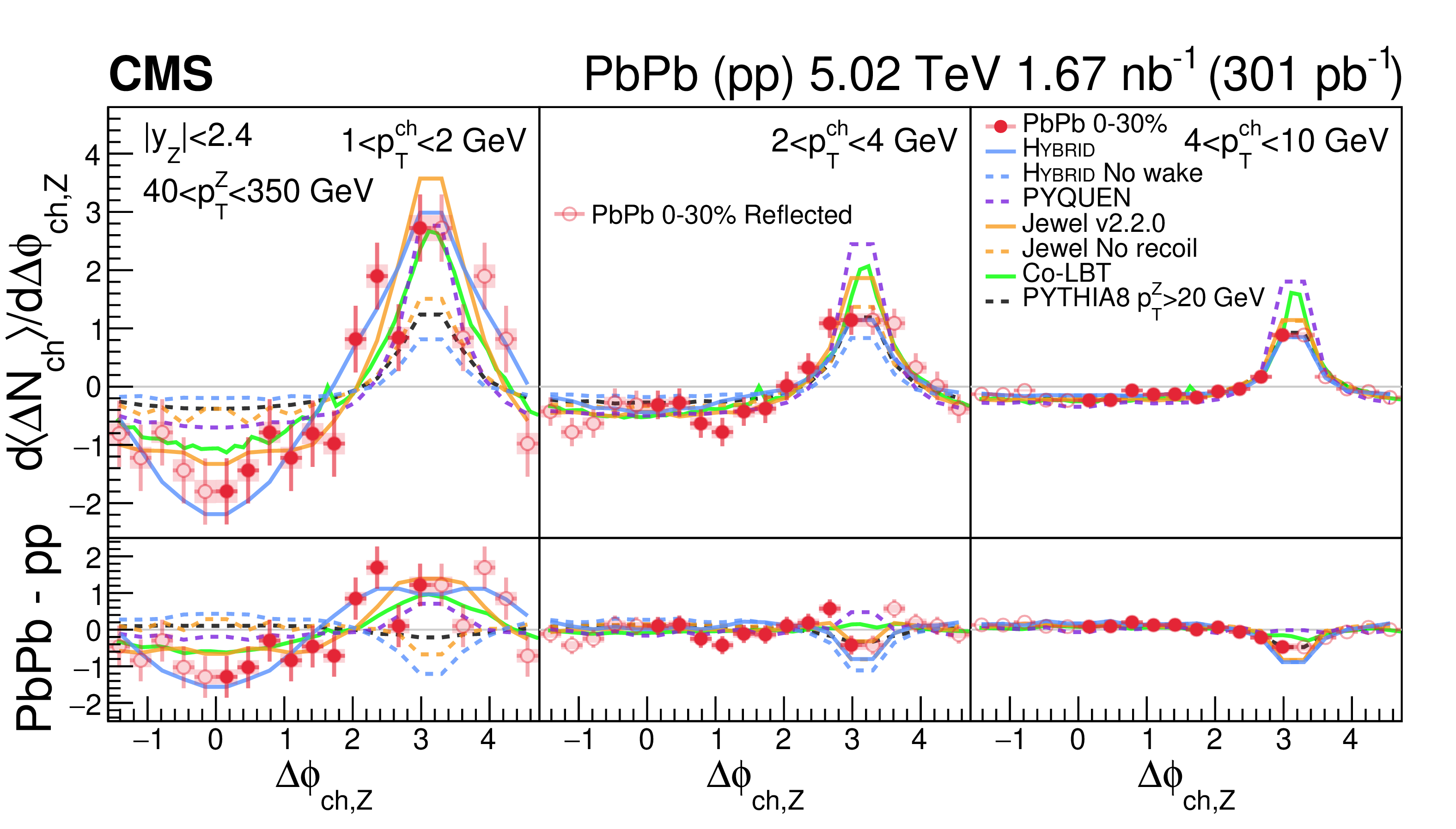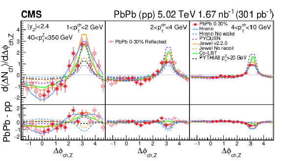 Upper row: Distributions of $ \Delta\phi_{\mathrm{ch,Z}} $ in 0--30% centrality PbPb collisions in the charged hadron $ p_{\mathrm{T}}^\text{ch} $ intervals of 1--2 (left column), 2--4 (middle column) and 4--10 GeV (right column). Lower row: The differences between the PbPb and pp distributions. The filled circles are PbPb data and the open circles are reflected data. The vertical bars and shaded boxes represent the statistical and systematic uncertainties, respectively. The results are compared to predictions from theoretical models. |