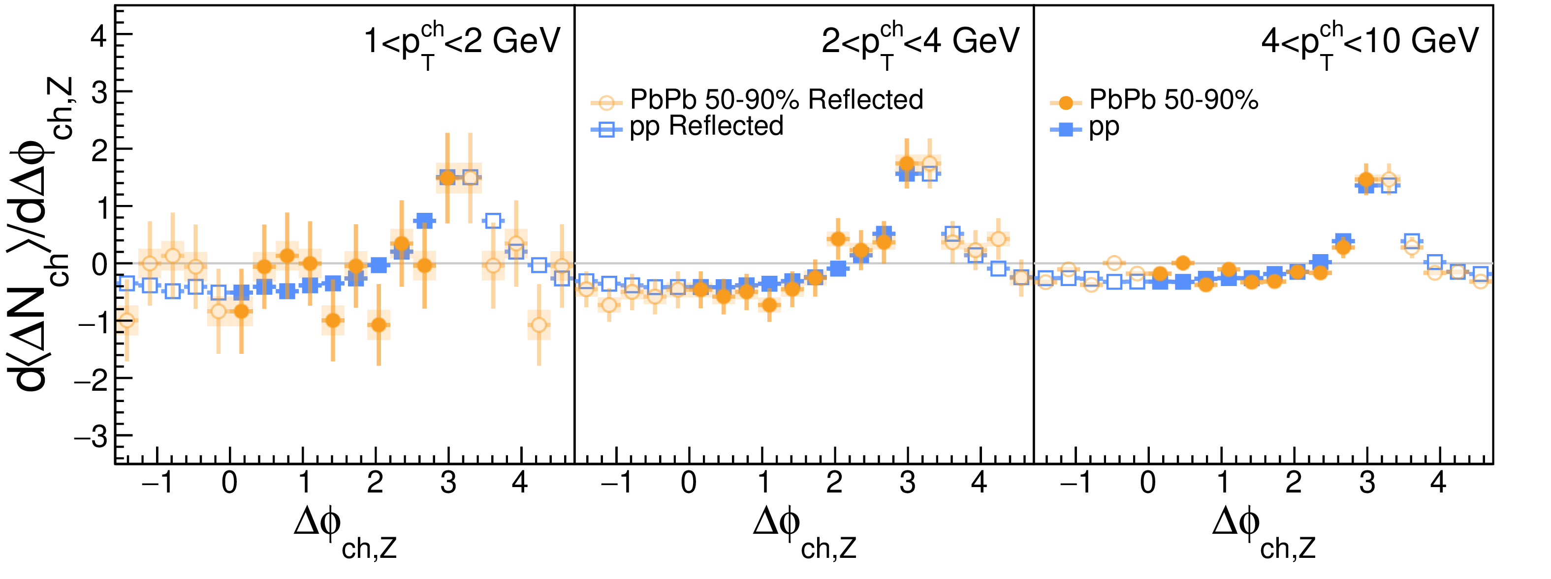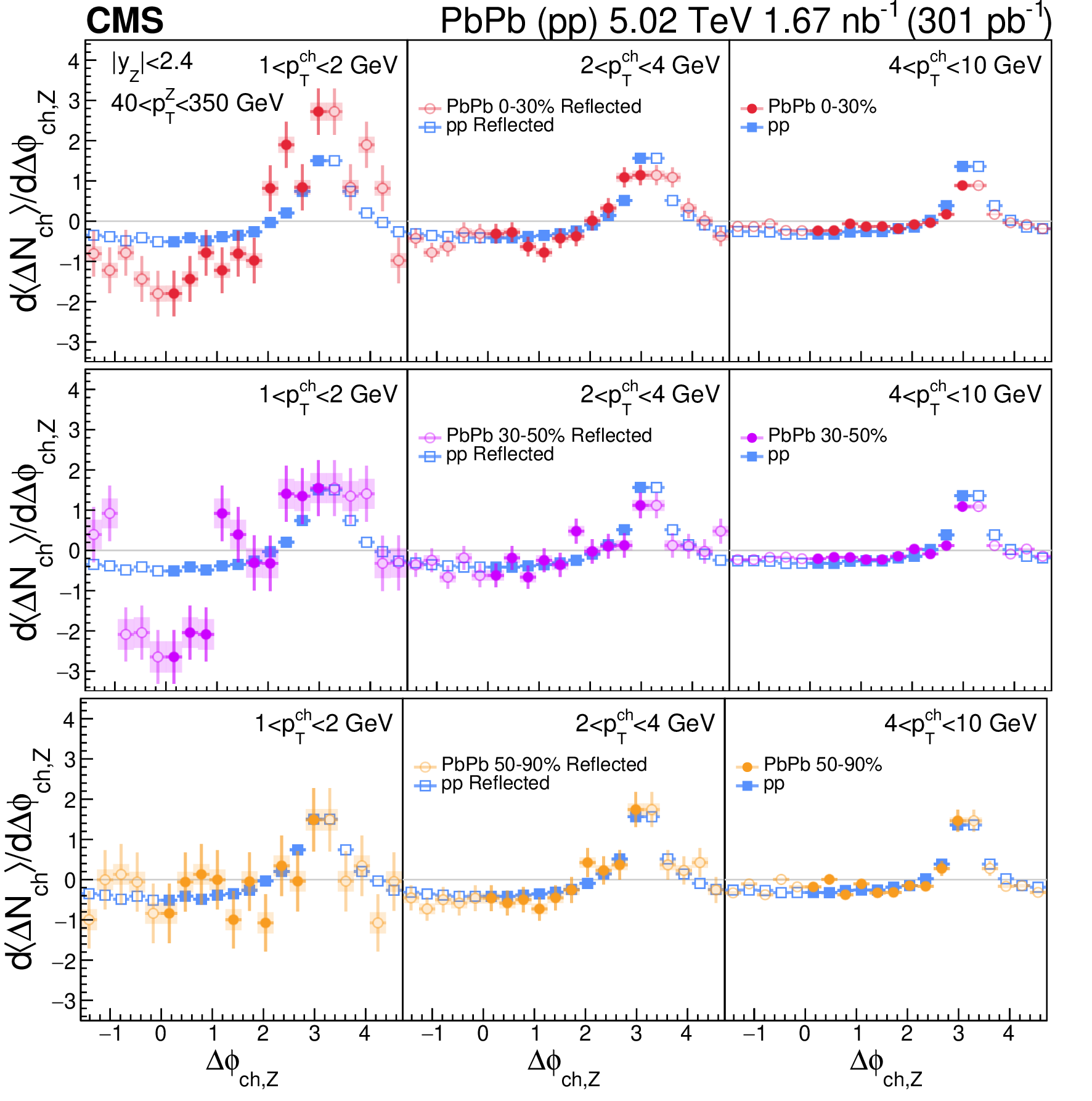The $ \Delta\phi_{\mathrm{ch,Z}} $ spectra for events with Z boson $ p_{\mathrm{T}}^{\mathrm{Z}} > $ 40 GeV in pp and PbPb collisions. The filled circles (squares) are the PbPb (pp) data and the open circles (squares) are reflected data. The pp data are identical across panels with different centrality intervals. The vertical bars and shaded boxes represent the statistical and systematic uncertainties, respectively. The results are presented in centrality intervals of 0--30% (top row, red), 30--50% (middle row, purple), and 50--90% (bottom row, yellow) and in the charged-hadron $ p_{\mathrm{T}}^\text{ch} $ intervals of 1--2 (left column), 2--4 (middle column) and 4--10 GeV (right column). |