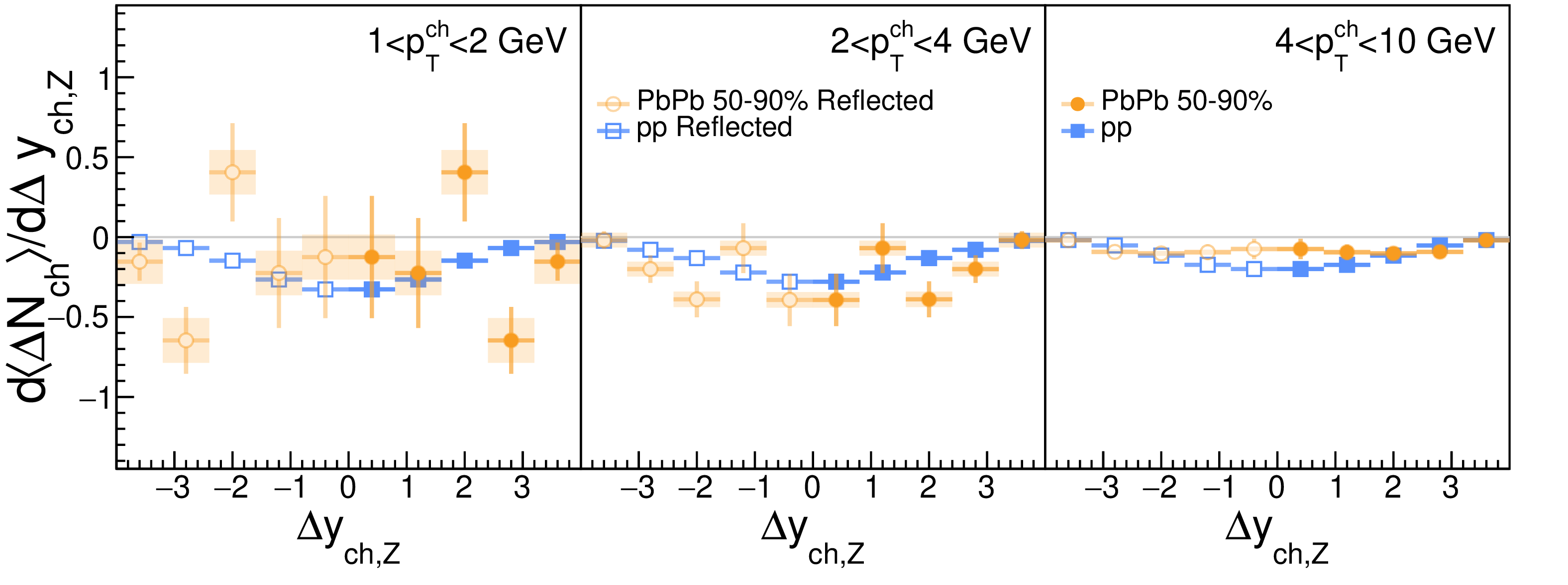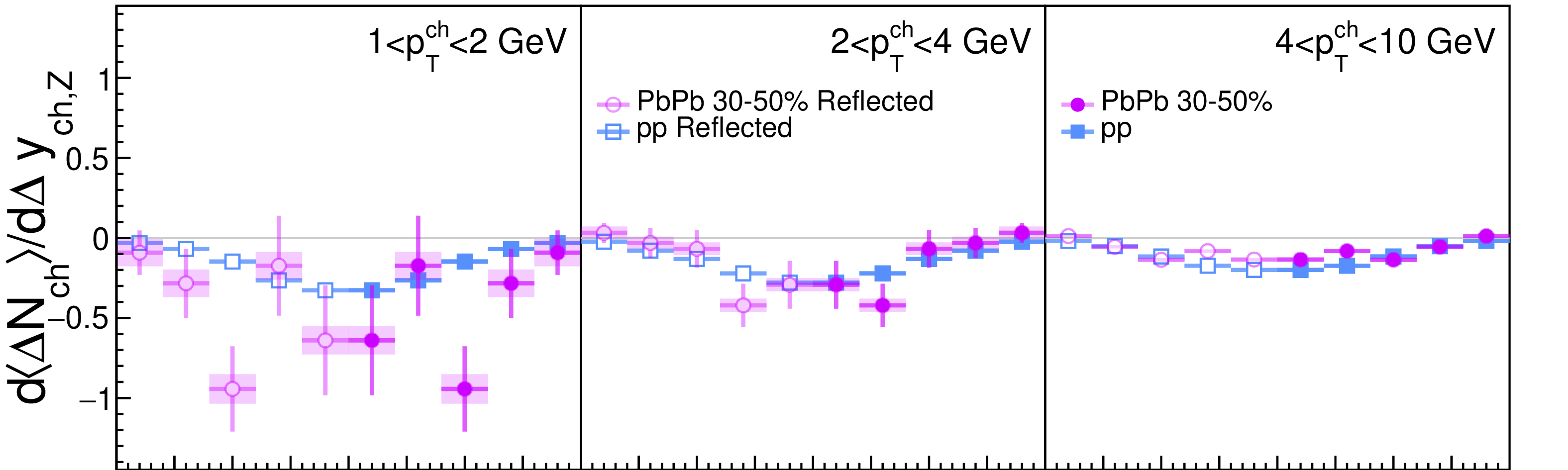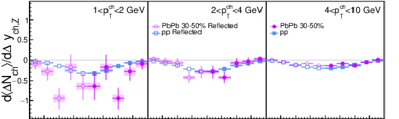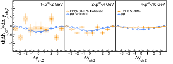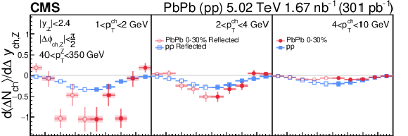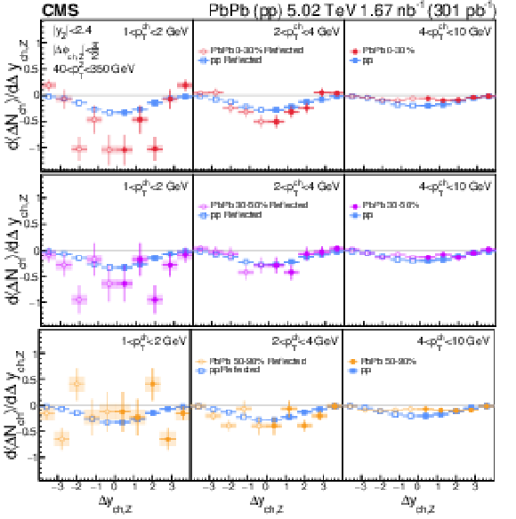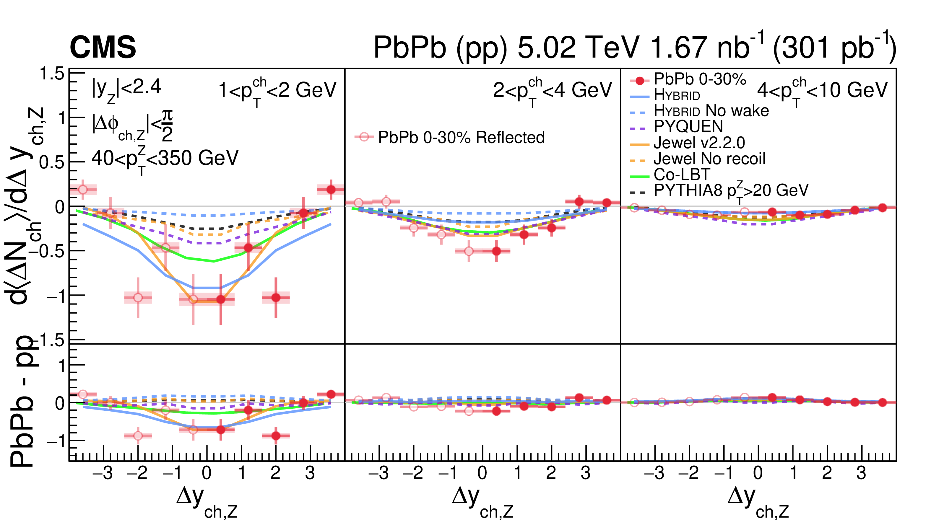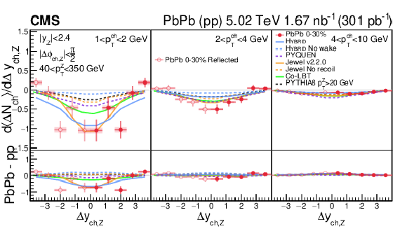Upper row: Distributions of $ \Delta y_{\mathrm{ch,Z}} $ in 0--30% centrality PbPb collisions in the charged hadron $ p_{\mathrm{T}}^\text{ch} $ intervals of 1--2 (left column), 2--4 (middle column) and 4--10 GeV (right column). Lower row: The differences between the PbPb and pp distributions. The filled circles are PbPb data and the open circles are reflected data. The vertical bars and shaded boxes represent the statistical and systematic uncertainties, respectively. The results are compared to predictions from theoretical models. |