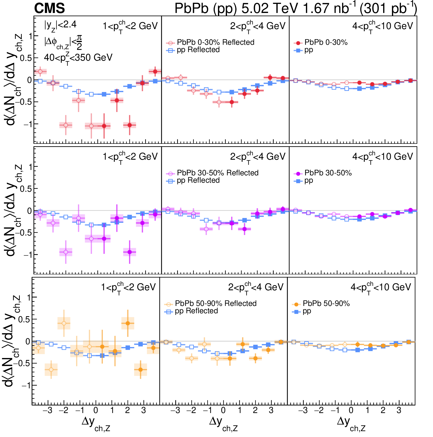 The $ \Delta y_{\mathrm{ch,Z}} $ spectra in the Z boson side ($ |\Delta\phi_{\mathrm{ch,Z}}| < \pi/ $ 2) for events with Z boson $ p_{\mathrm{T}}^{\mathrm{Z}} > $ 40 GeV in pp and PbPb collisions. The filled circles (squares) are the PbPb (pp) data and the open circles (squares) are reflected data. The vertical bars and shaded boxes represent the statistical and systematic uncertainties, respectively. The results are presented in centrality intervals of 0--30% (top row, red), 30--50% (middle row, purple), and 50--90% (bottom row, yellow) and in the charged-hadron $ p_{\mathrm{T}}^\text{ch} $ intervals of 1--2 (left column), 2--4 (middle column) and 4--10 GeV (right column). The pp data are identical across panels with different centrality intervals. |