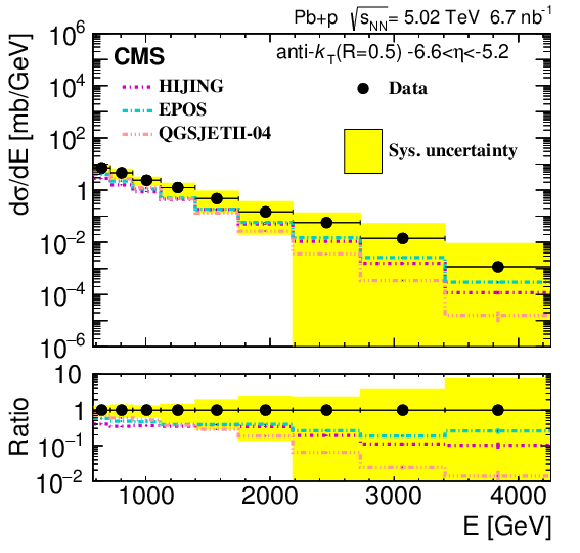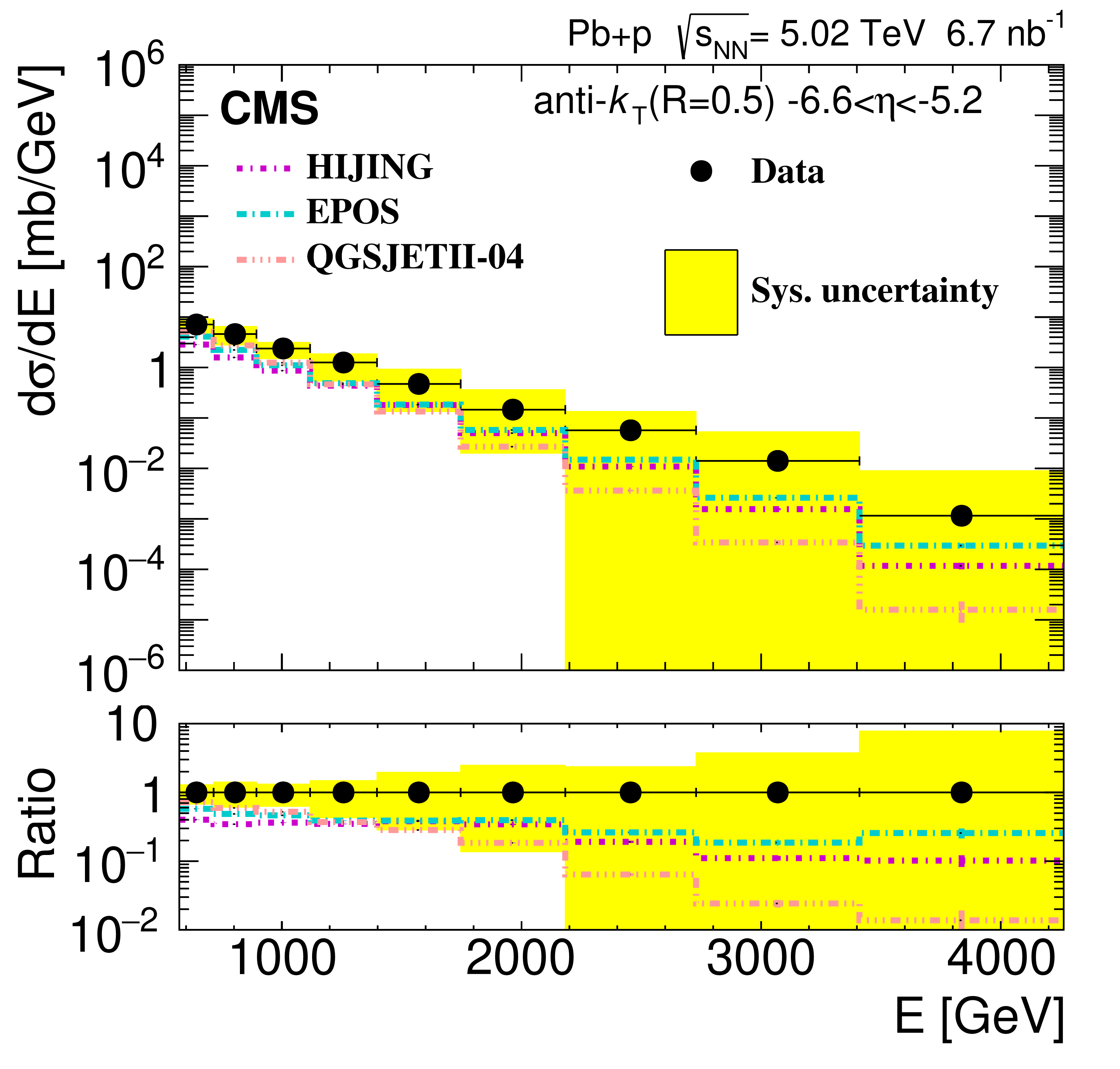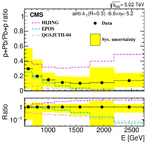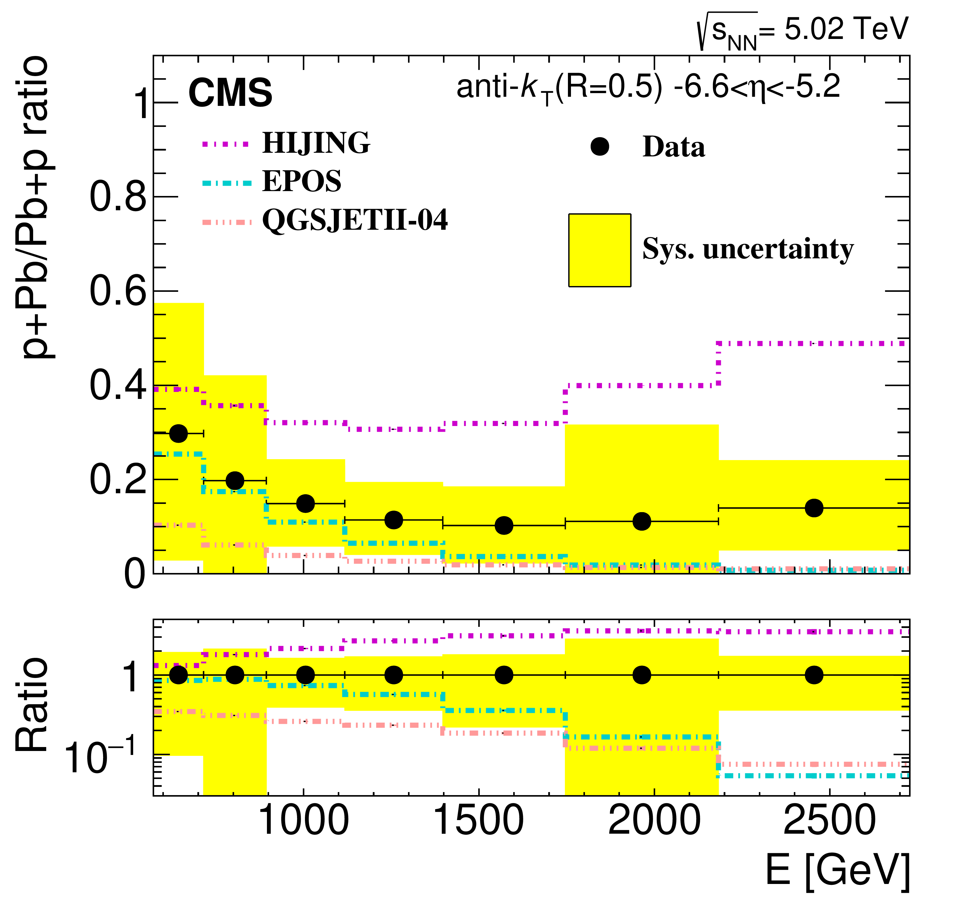 (Left) Forward jet differential cross section, where the forward jet is in the Pb-going direction, as a function of the jet energy in pPb collisions at 5.02 TeV. The kinematic properties of the collision probe the small-$ x $ wave function of the proton with a high-$ x $ parton from the Pb nucleus. The data are compared with different Monte Carlo event generators: EPOS-LHC [123], HIJING [124], and QGSJETII-04 [199]. (Right) The ratio of the inclusive jet cross sections; the numerator (denominator) of the ratio corresponds to the case where the jet is measured in the proton-going (Pb-going) direction. Figure adapted from Ref. [202] |