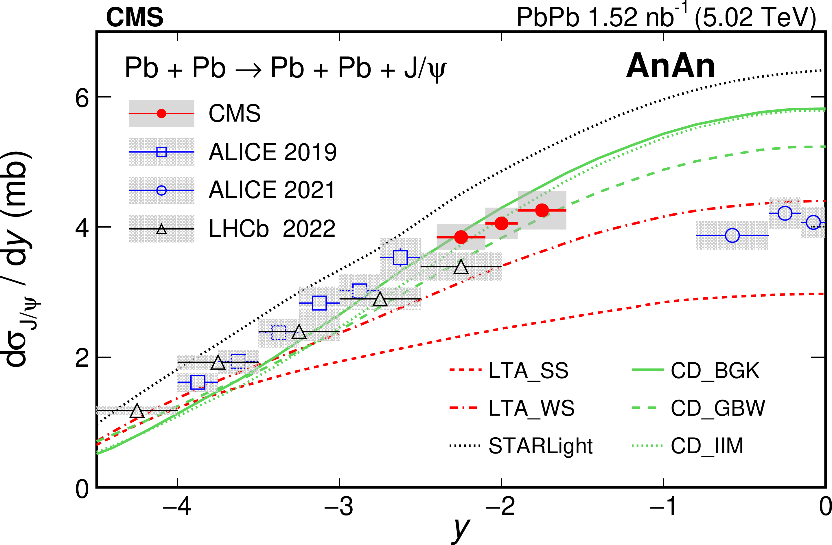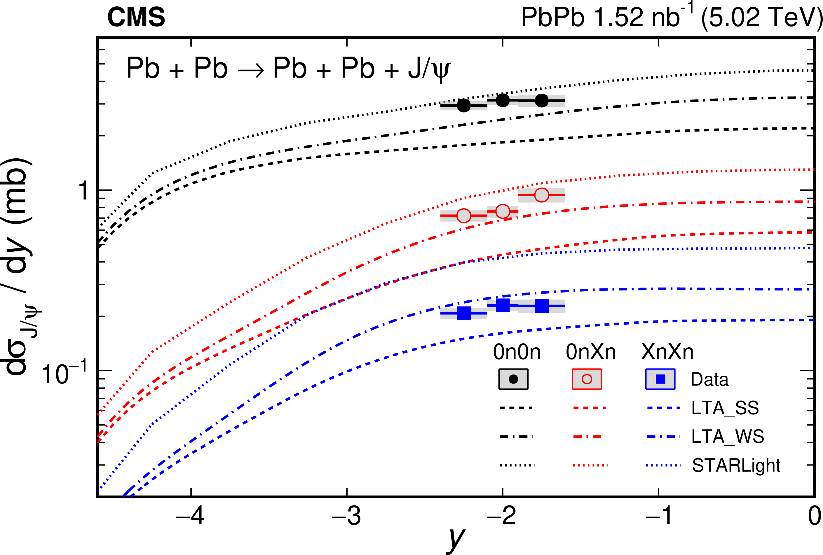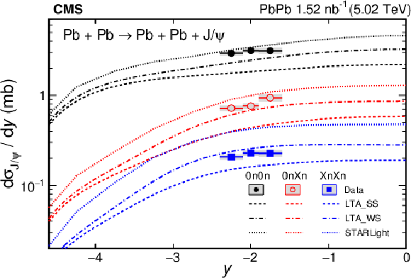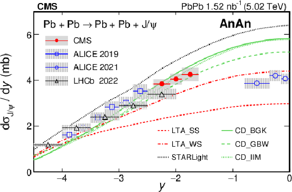 The differential coherent $ \mathrm{J}/\psi $ meson photoproduction cross section as a function of rapidity, in different neutron multiplicity classes (left): 0 $ \mathrm{n}0\mathrm{n} $, 0 $ \mathrm{n}\mathrm{X}\mathrm{n} $ and $ \mathrm{X}\mathrm{n}\mathrm{X}\mathrm{n} $ ($ \mathrm{X} \geq $ 1); (right): $ \mathrm{A}\mathrm{n}\mathrm{A}\mathrm{n} $ (inclusive in the number of neutrons detected in the ZDC). The small vertical bars and shaded boxes represent the statistical and systematic uncertainties, respectively. The horizontal bars represent the bin widths. Theoretical predictions from LTA weak/strong shadowing [216], color dipole models (CD_BGK, CD_BGW, and CD_IIM) [220], and STARLIGHT [115] are shown. Figure adapted from Ref. [221] |