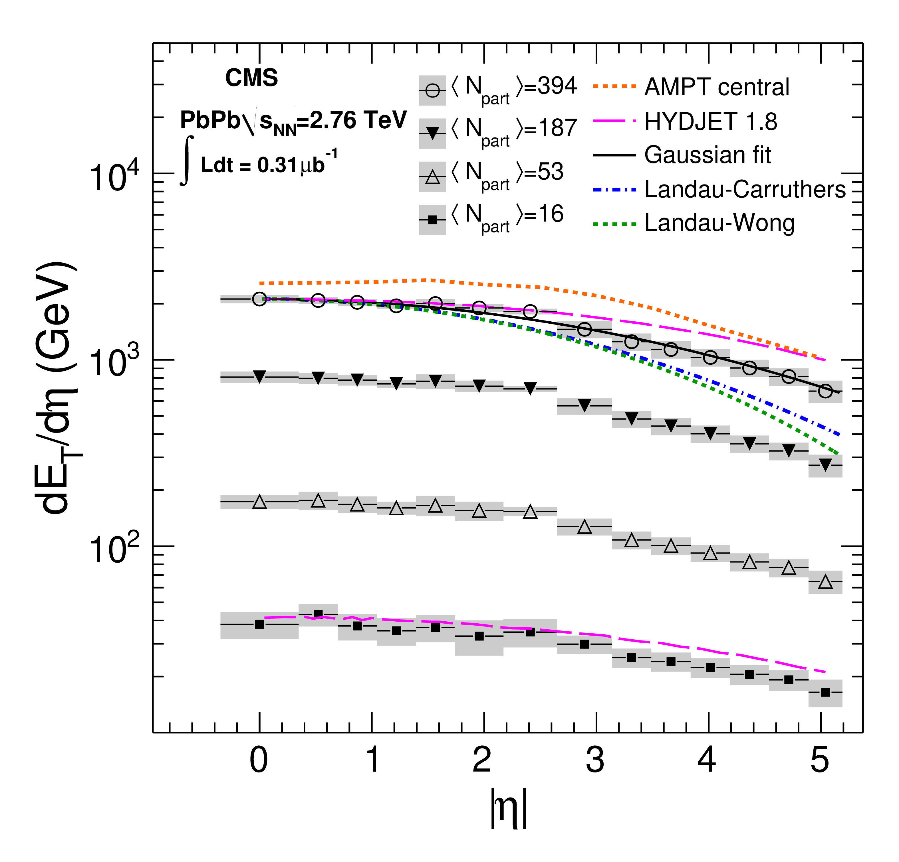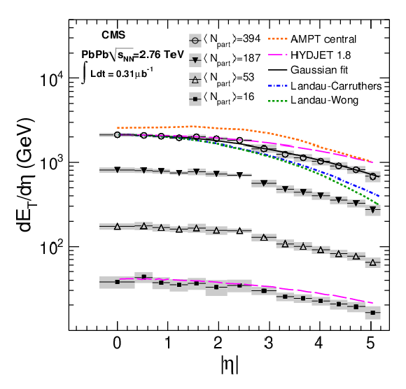 Distributions $ (\mathrm{d}N_{\text{ch}}/\mathrm{d}\eta)/(N_\text{part}/2) $ in 2.76 TeV PbPb (top left) and $ \mathrm{d}N_{\text{ch}}/\mathrm{d}\eta $ in 5.44 TeV XeXe (top right) collisions, and $ \mathrm{d}E_{\mathrm{T}}/\mathrm{d}\eta $ in 2.76 TeV PbPb collisions (bottom) as functions of $ \eta $ in various centrality bins. The inner green band in the left panel shows the measurement uncertainties affecting the scale of the measured distribution, while the outer gray band shows the full systematic uncertainty, i.e., affecting both the scale and the slope. Figure adapted from Refs. [111,231,232] |