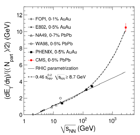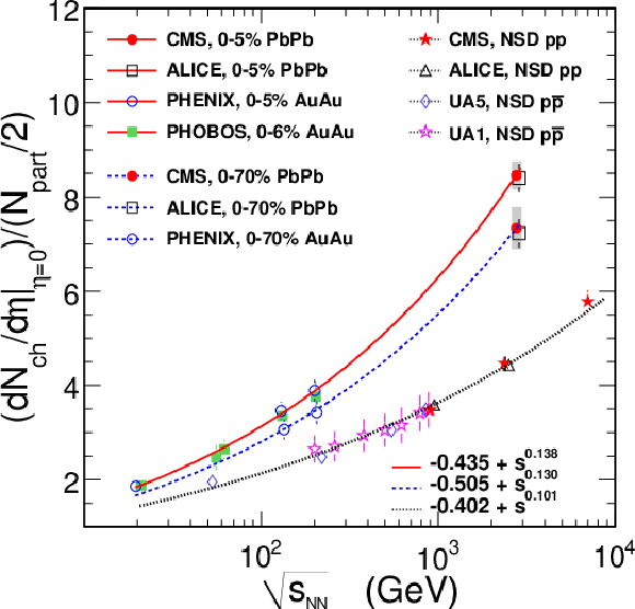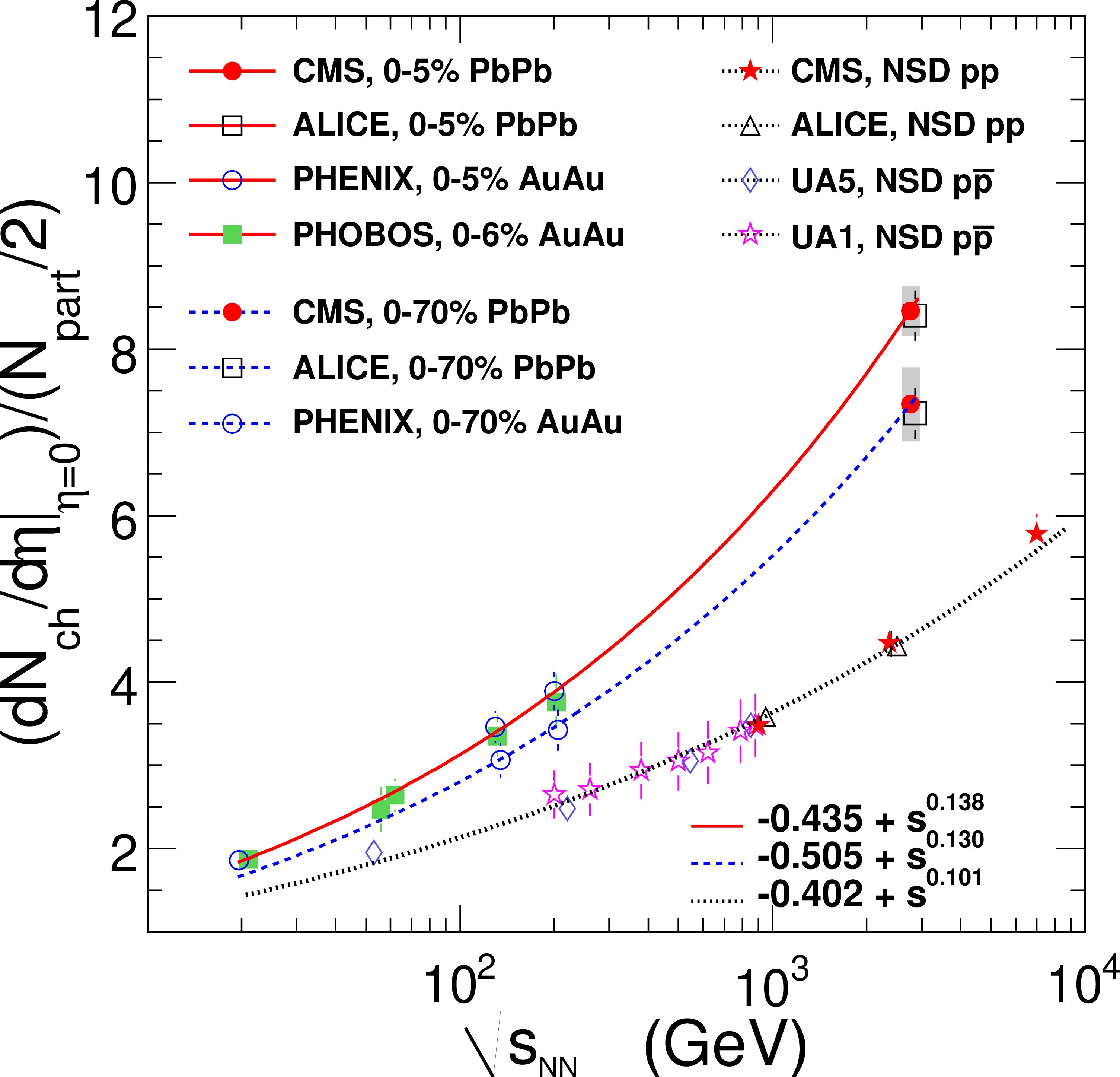 Normalized charged-particle pseudorapidity (left, figure adapted from Ref. [111]) and transverse energy density (right, figure adapted from Ref. [232]) at $ \eta= $ 0 as functions of center-of-mass energy, from various experiments. The fits to power-law functions are shown by lines. |