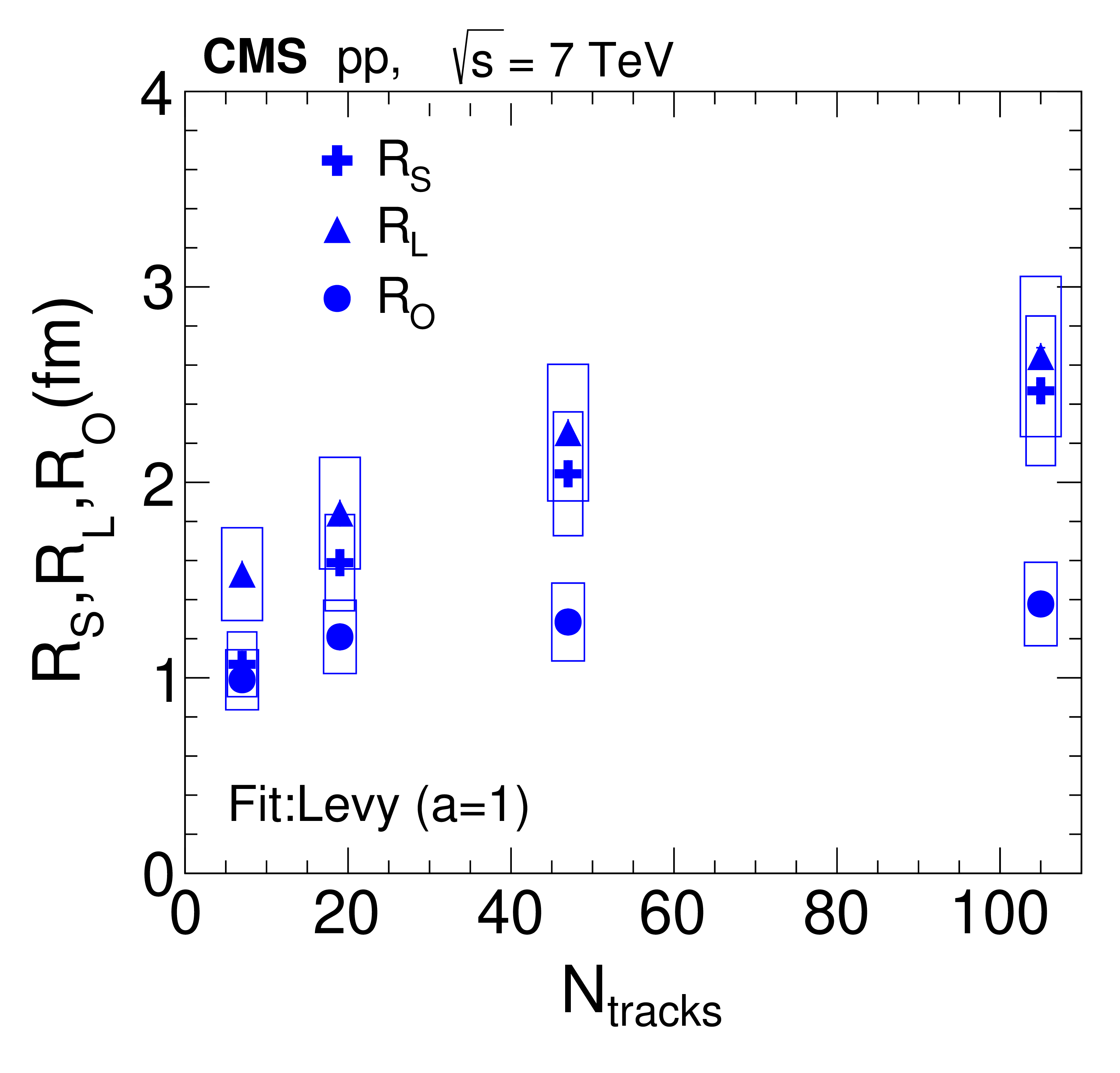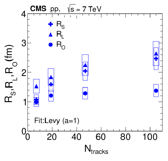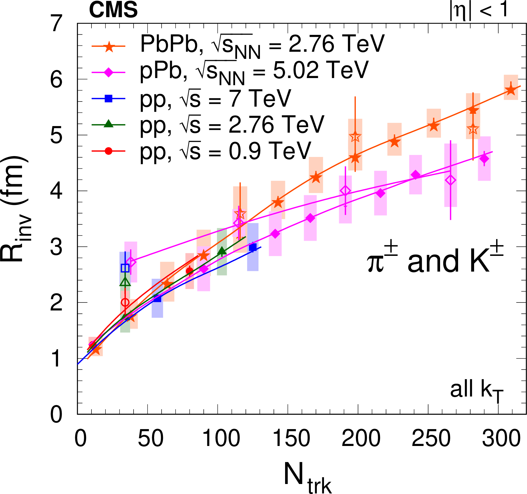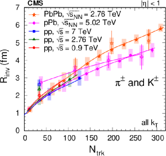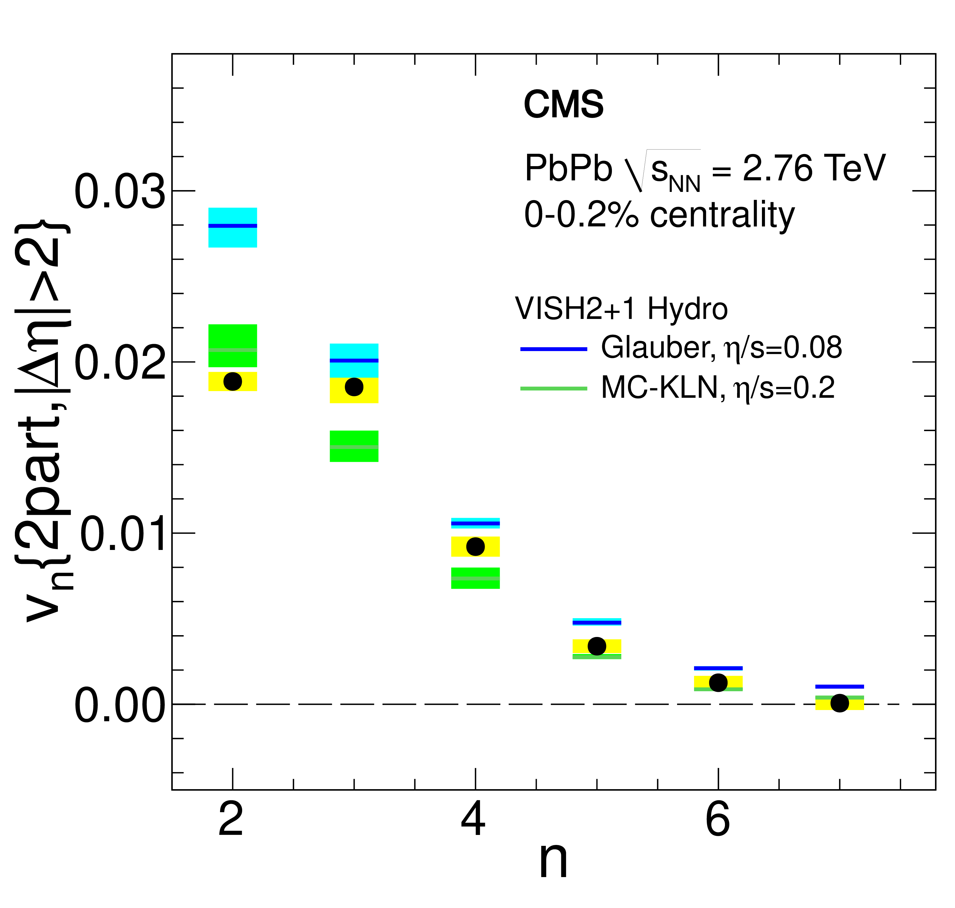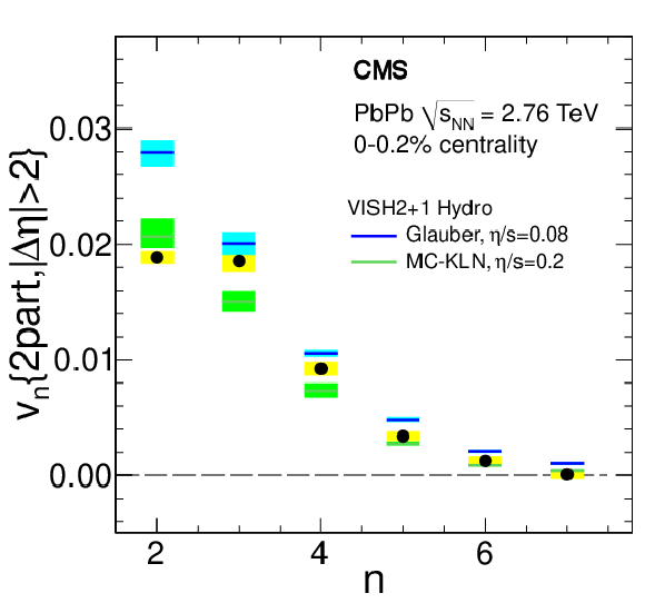 Charged hadron multiplicity density at mid-rapidity ($ \mathrm{d} N_{\text{ch}} / \mathrm{d} \eta |_{\eta=0} $) as a function of centrality class in PbPb collisions at $ \sqrt{\smash[b]{s_{_{\mathrm{NN}}}}}= $ 2.76 TeV from the CMS (solid circles) and ALICE [121] (open squares) experiments. The inner green band shows the measurement uncertainties affecting the scale of the measured distribution, while the outer grey band represents the full systematic uncertainty, i.e.,, affecting both the scale and the slope. Figure adapted from Ref. [111] |