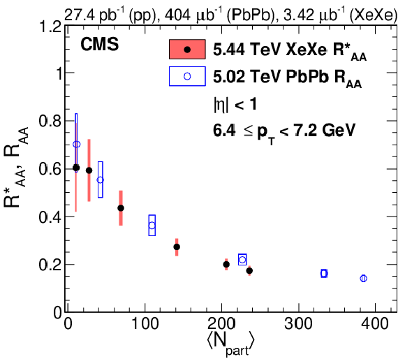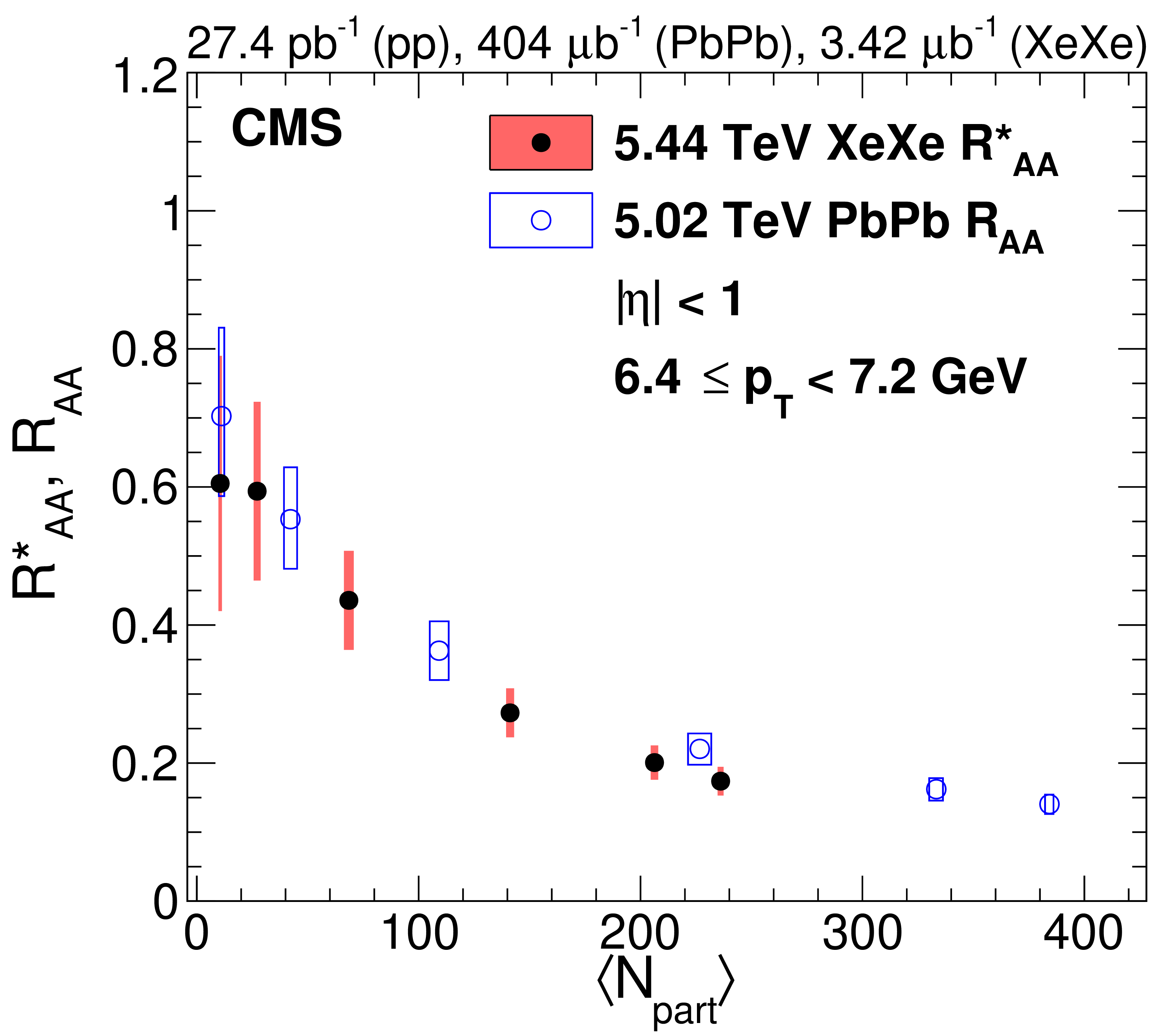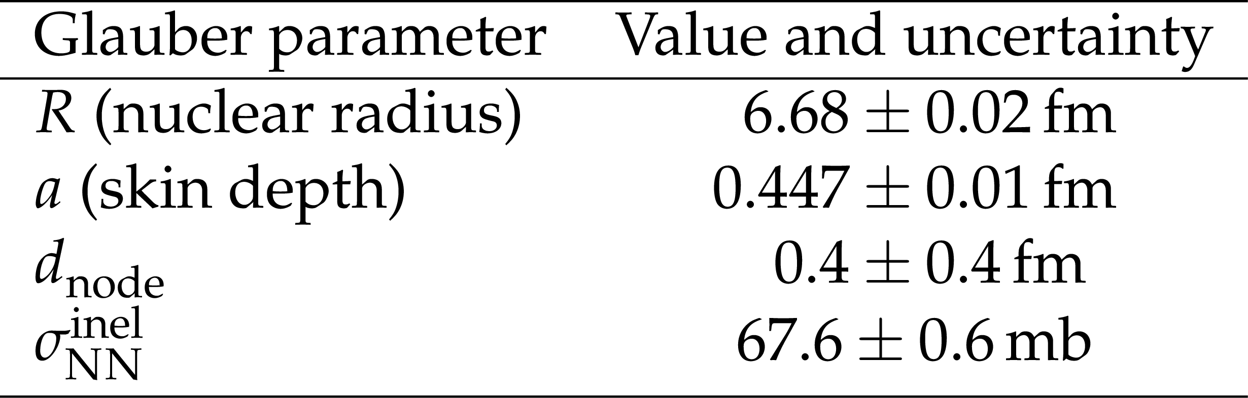 Distribution of $ \rho $, the UE energy per unit area, as a function of centrality, found using the central-$ \eta $ strip of PF pseudotowers. Figure adapted from Ref. [142]. |