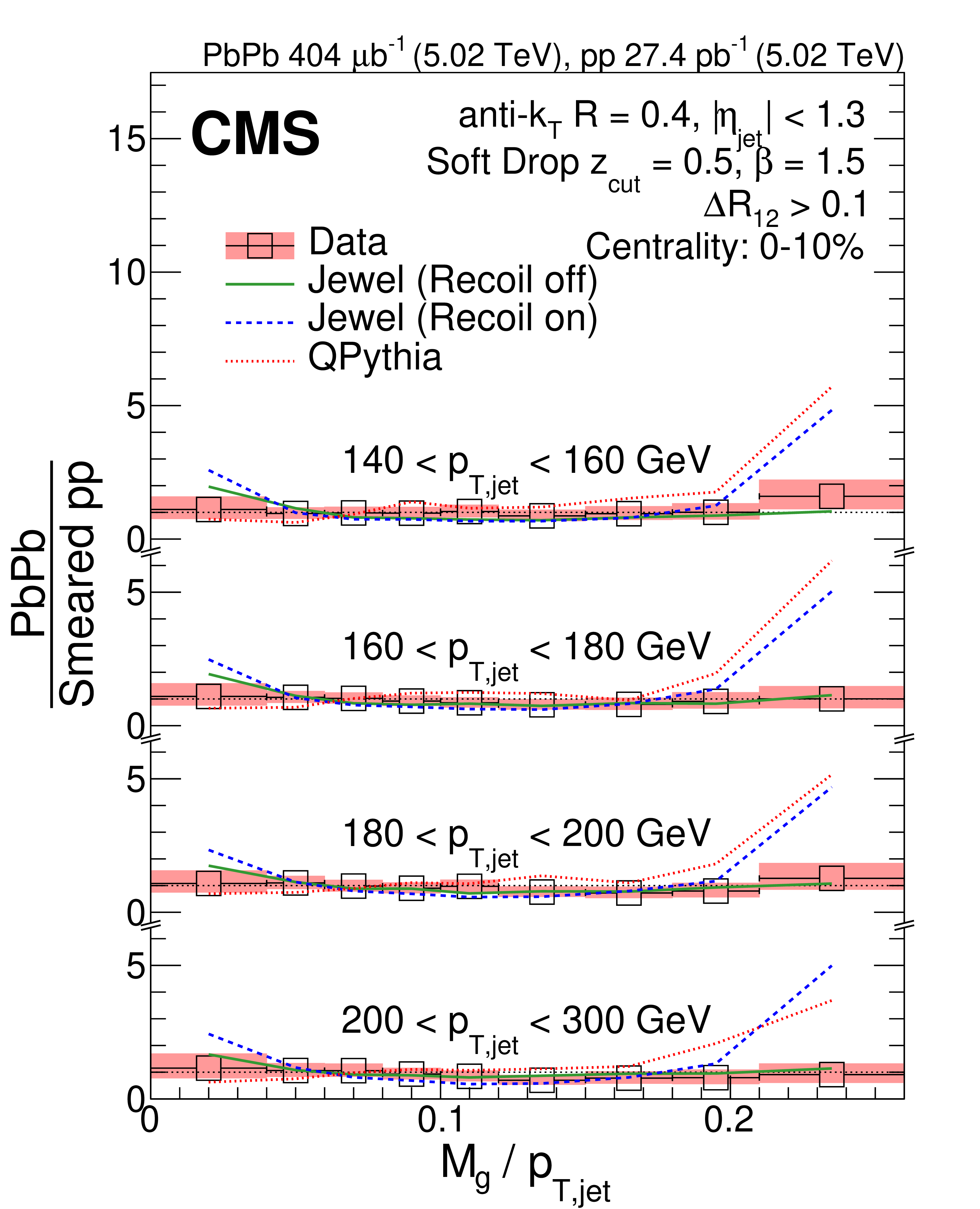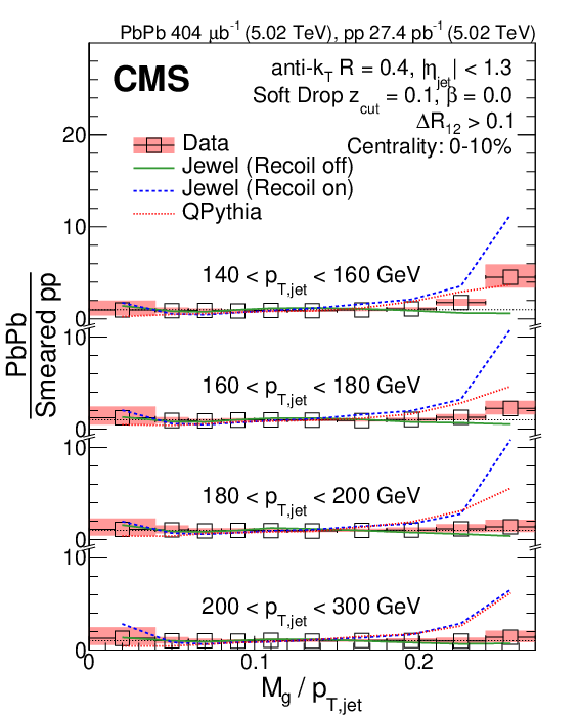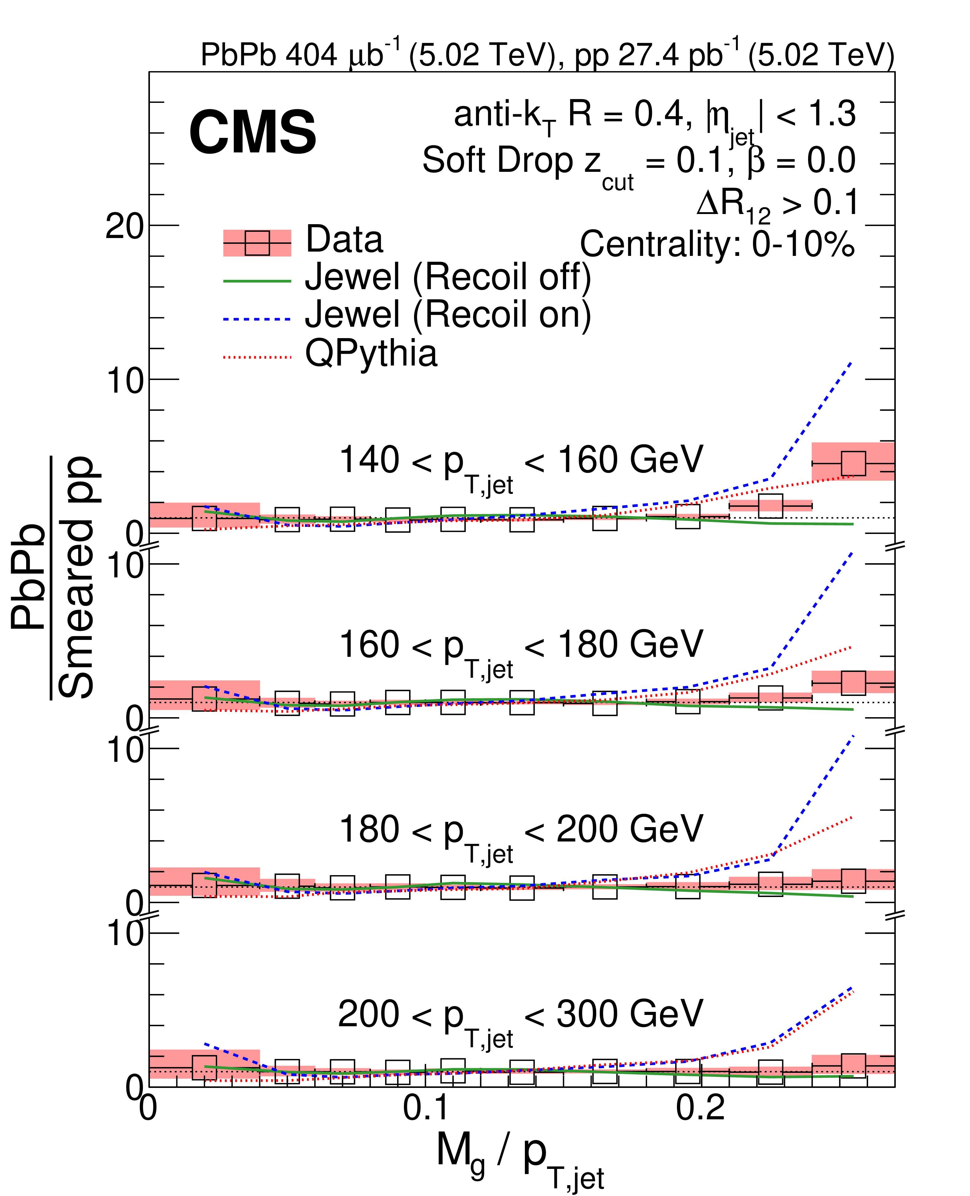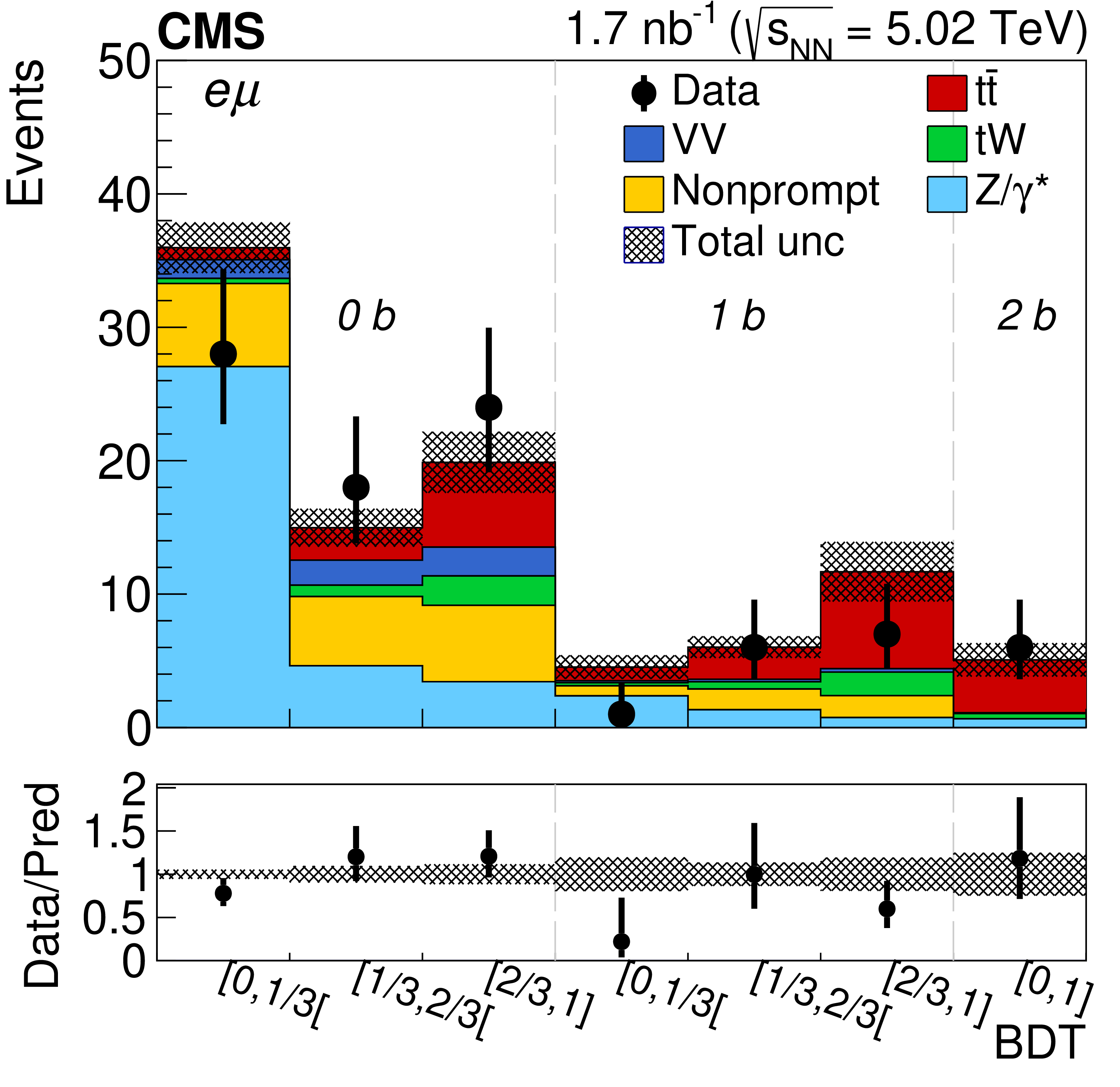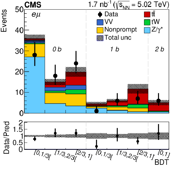 Multiplicity distribution of the b-tagged jets in a top quark pair enriched final state using PbPb collisions. The distribution of the main background is taken from the data. Backgrounds and $ \mathrm{t} \overline{\mathrm{t}} $ signal are shown with the filled histograms and data are shown with the markers. The vertical bars on the markers represent the statistical uncertainties in data. The hatched regions show the uncertainties in the sum of $ \mathrm{t} \overline{\mathrm{t}} $ signal and backgrounds. The lower panel displays the ratio of the data to the predictions with bands representing the uncertainties in the predictions. Figure adapted from Ref. [149] |